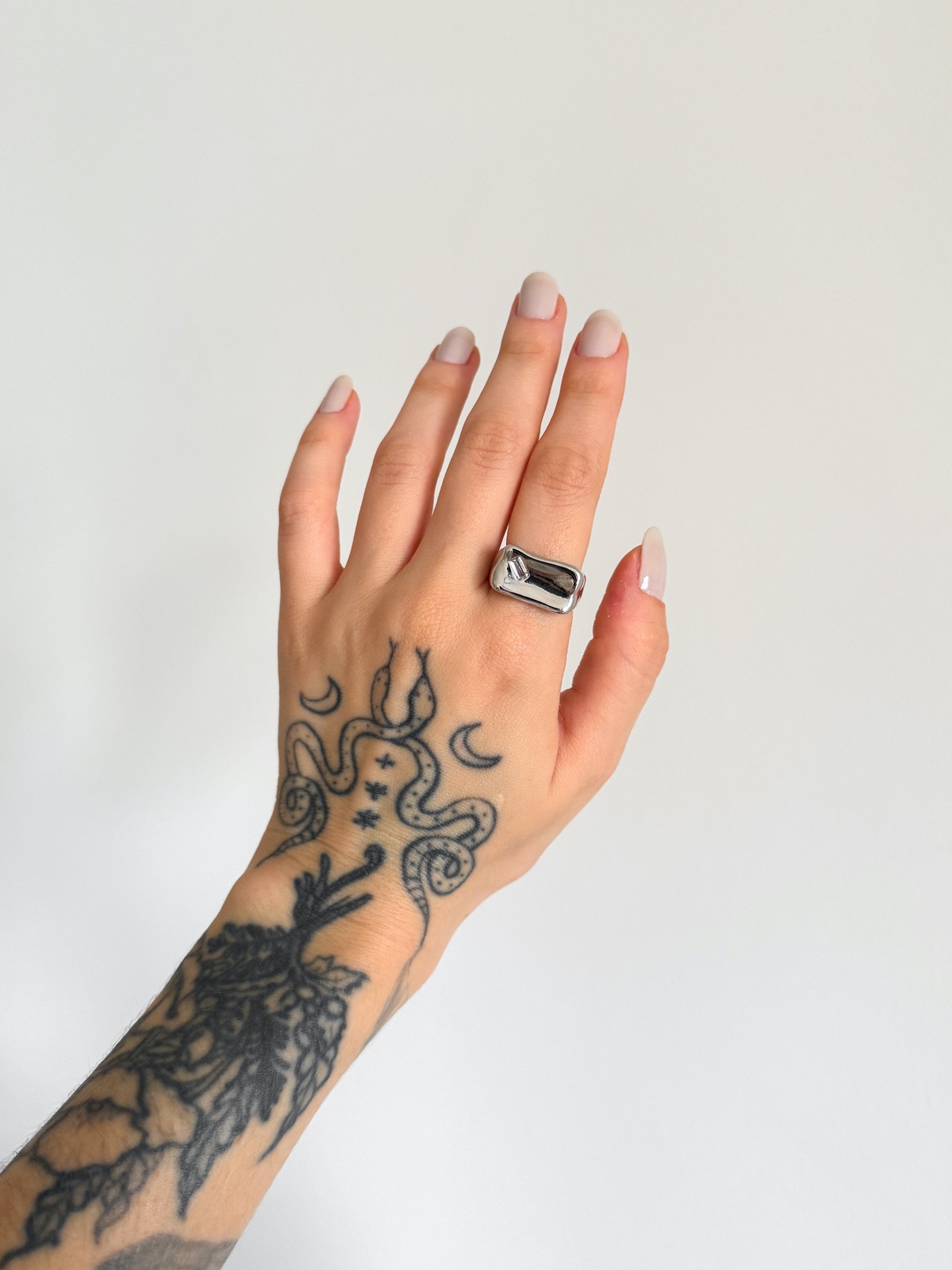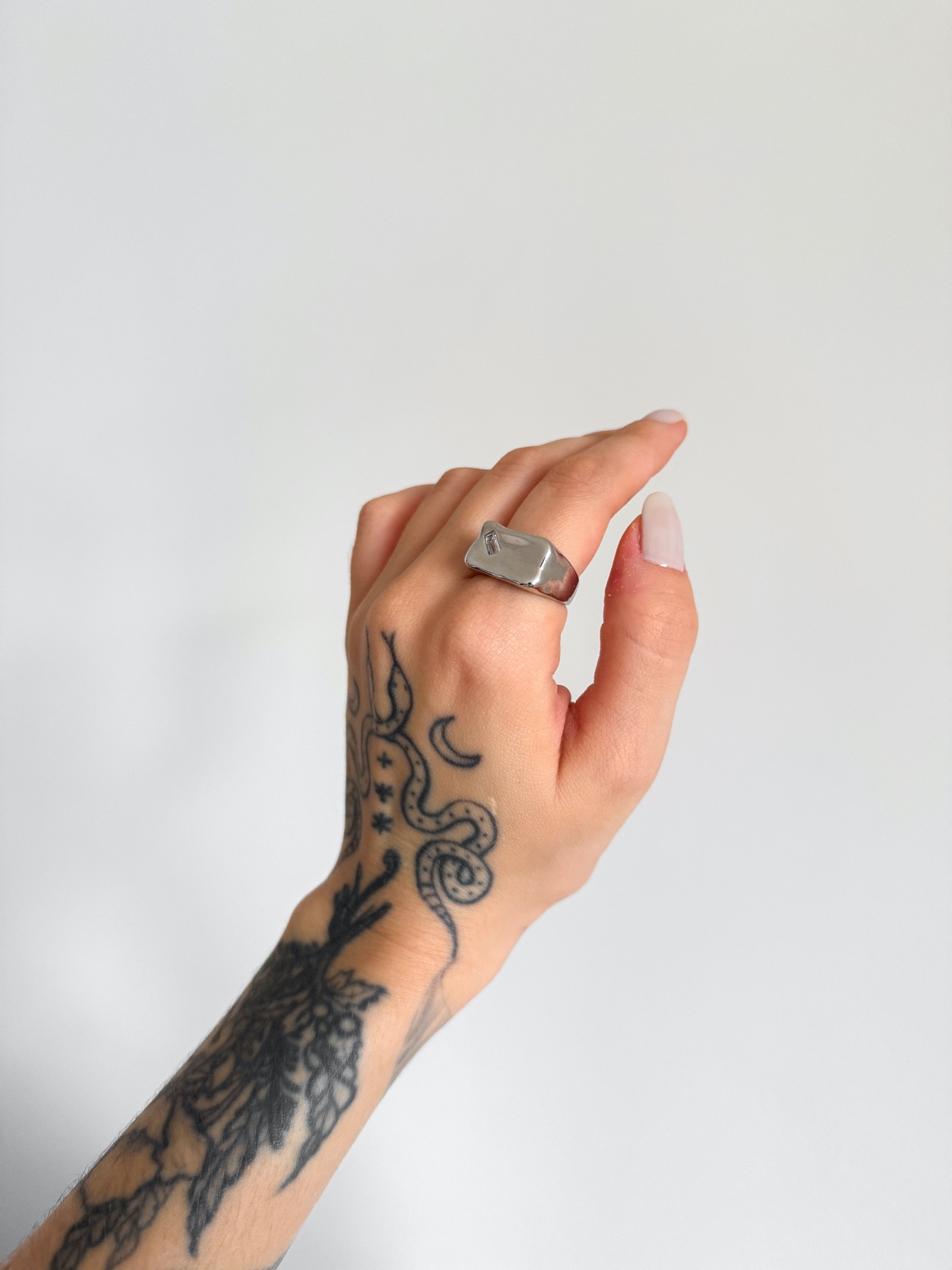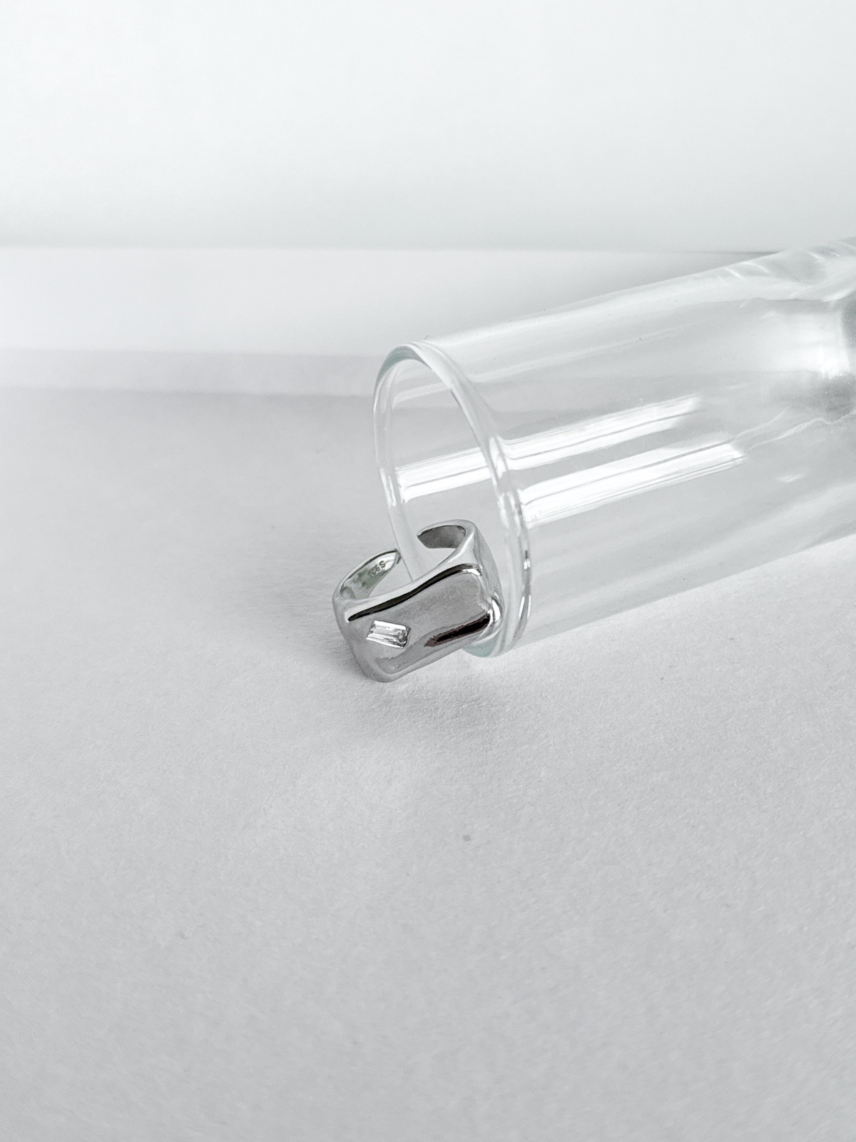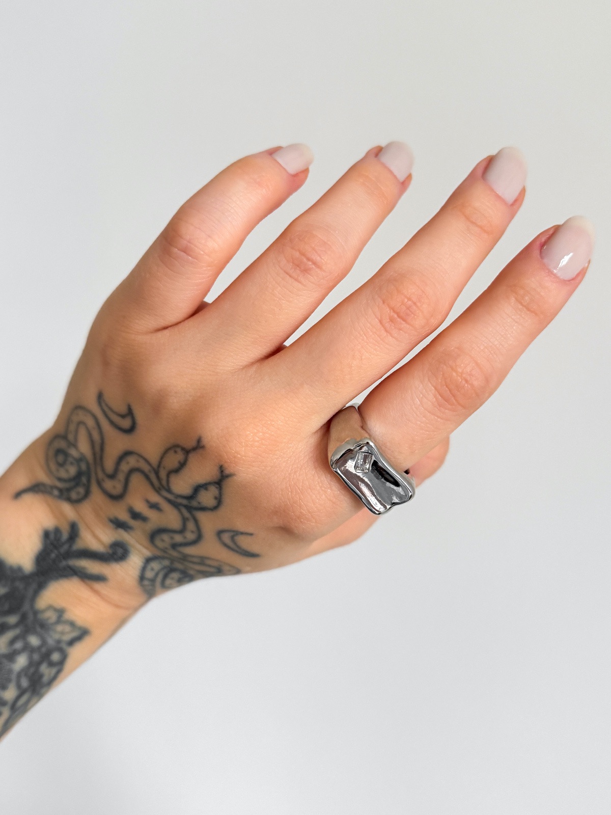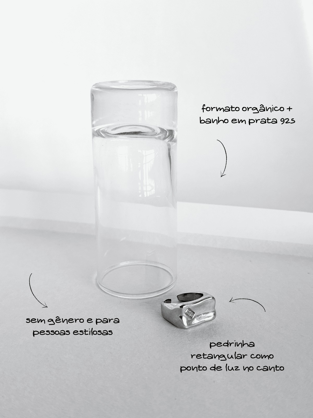 OMG! Não tem como não amar e é uma das peças mais diferentes que já tivemos por aqui. Ele tem essa base retangular orgânica com uma mini pedrinha transparente também retangular. Esse mood ”amassadinho” do anel faz com que ele fique mais cool e chique.