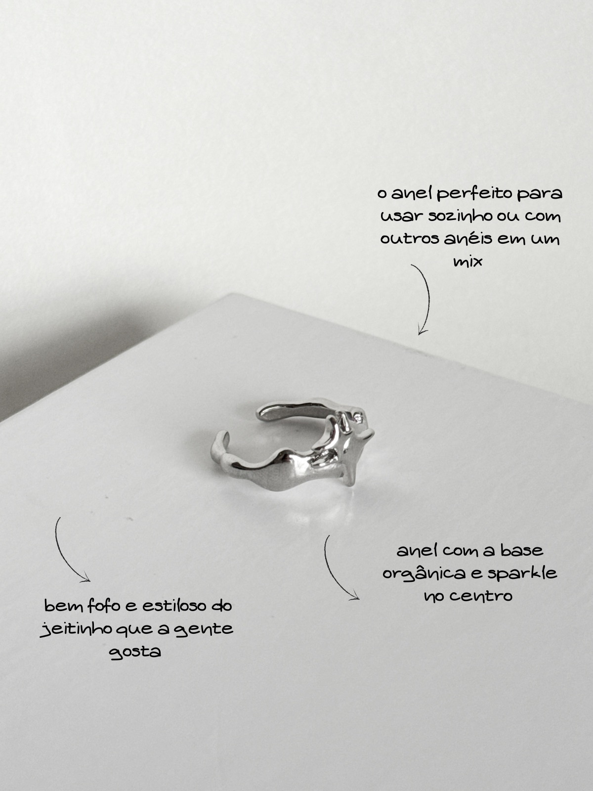 Misturando o mood orgânico com o futurista, do jeitinho que amamos, esse anel não tem como ficar melhor. A base e lateral mais finas e no formato orgânico e no centro as estrelas em formatp sparkle que já é um sucesso por aqui. Perfeito para usar sozinho ou com outros anéis juntos. Enjoy!