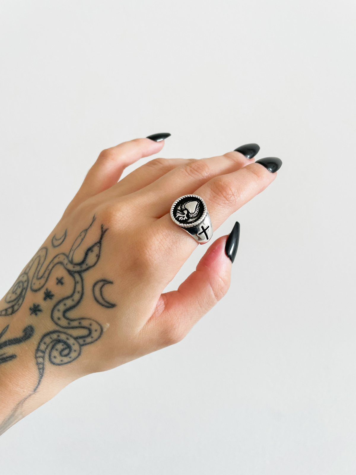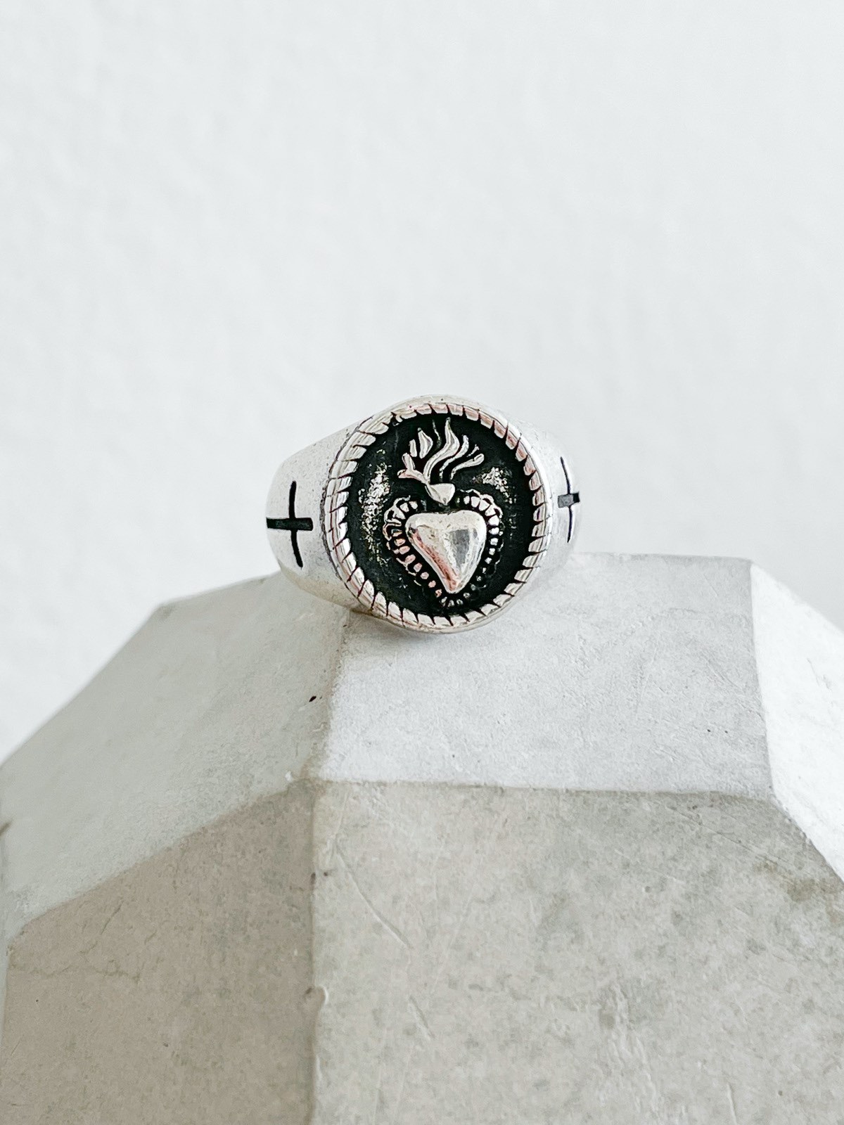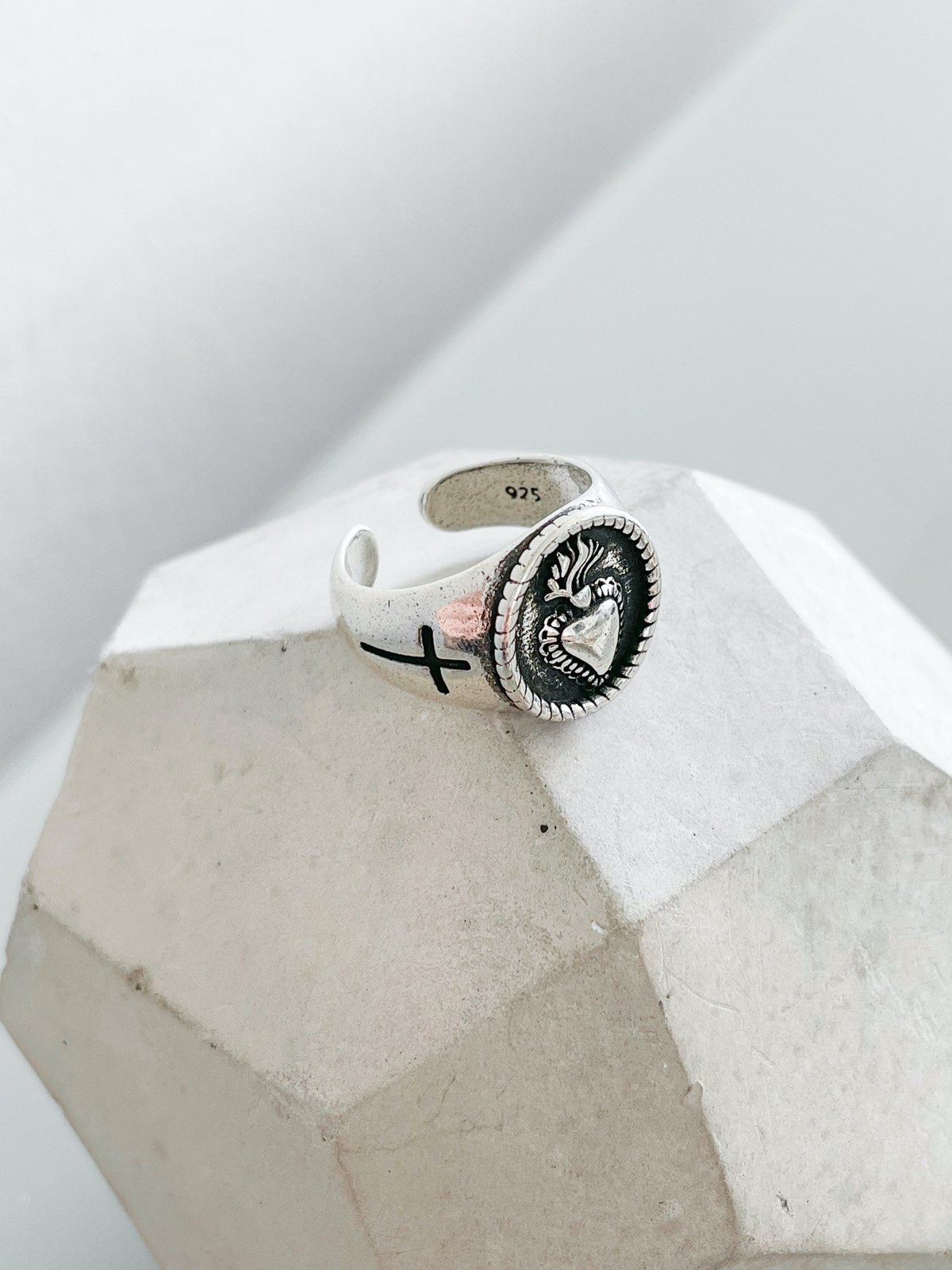 Anel Camden, com formato arredondado, coração e cruz em alto relevo. Banhado em prata 925
