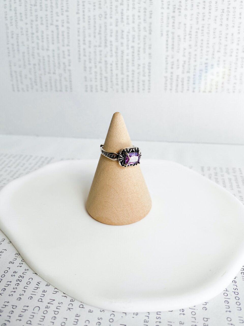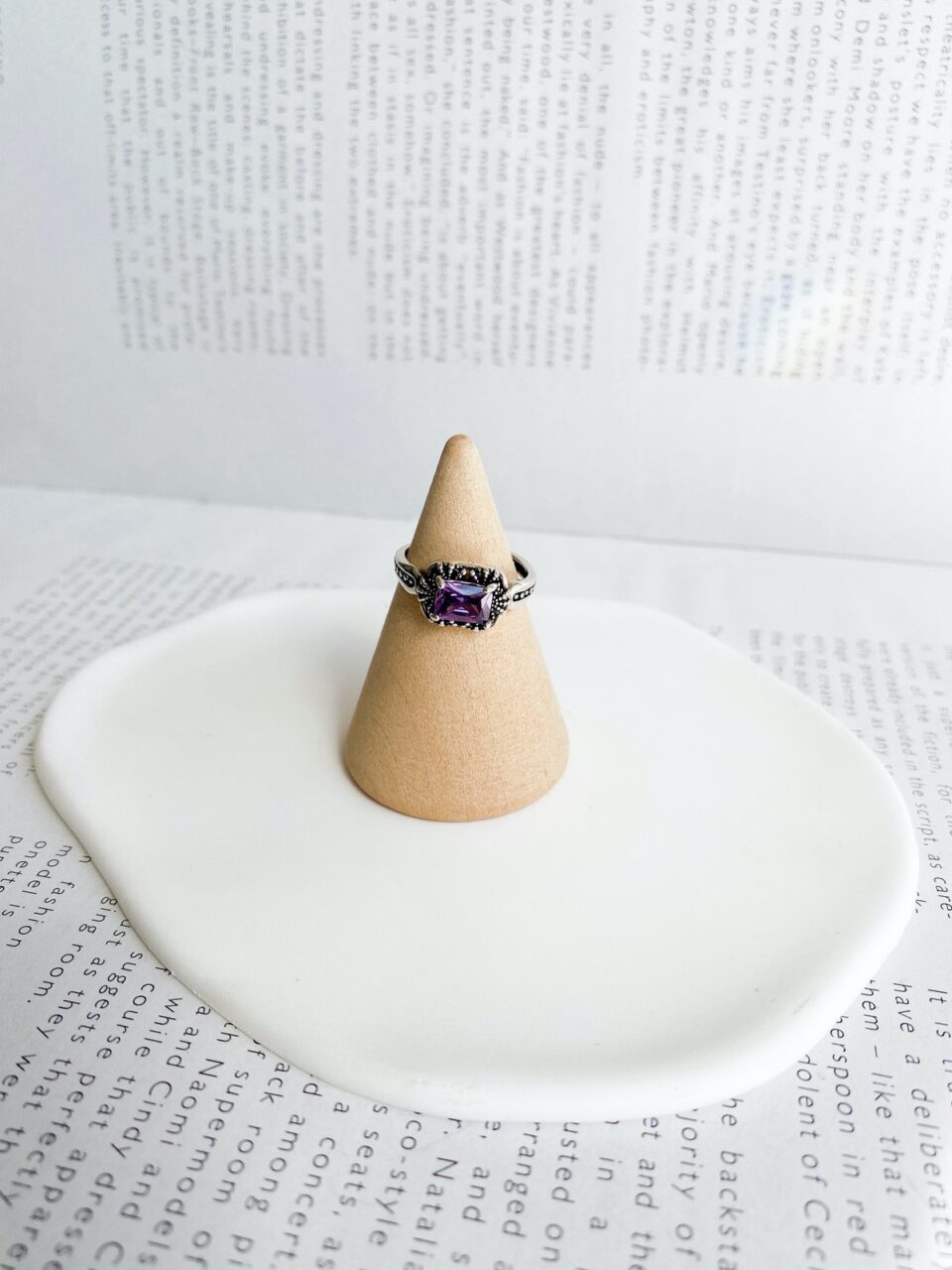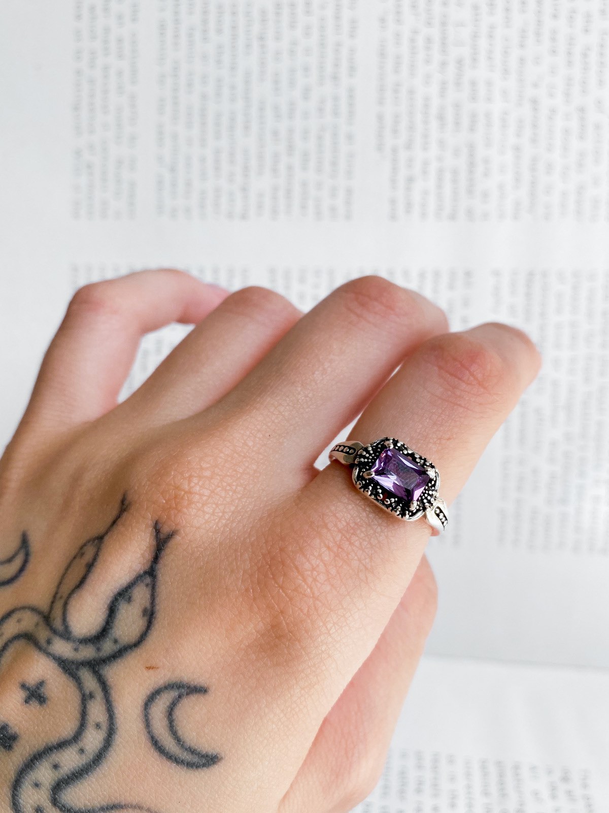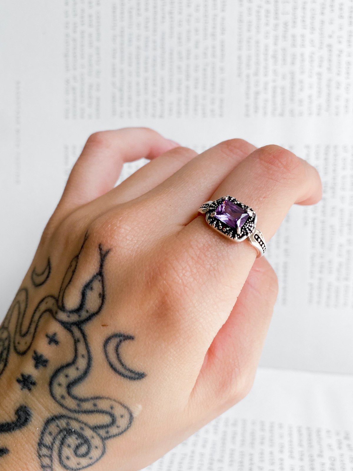 Anel Kate, formato retangular com pedra roxa e banho em prata 925