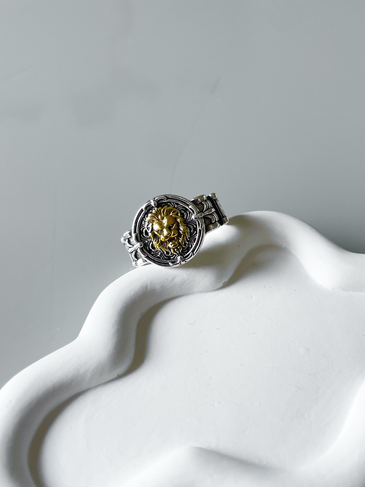 Anel Lion, formato redondo com rosto de leão dourado e banho em prata 925