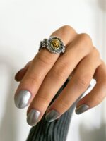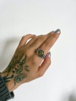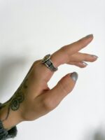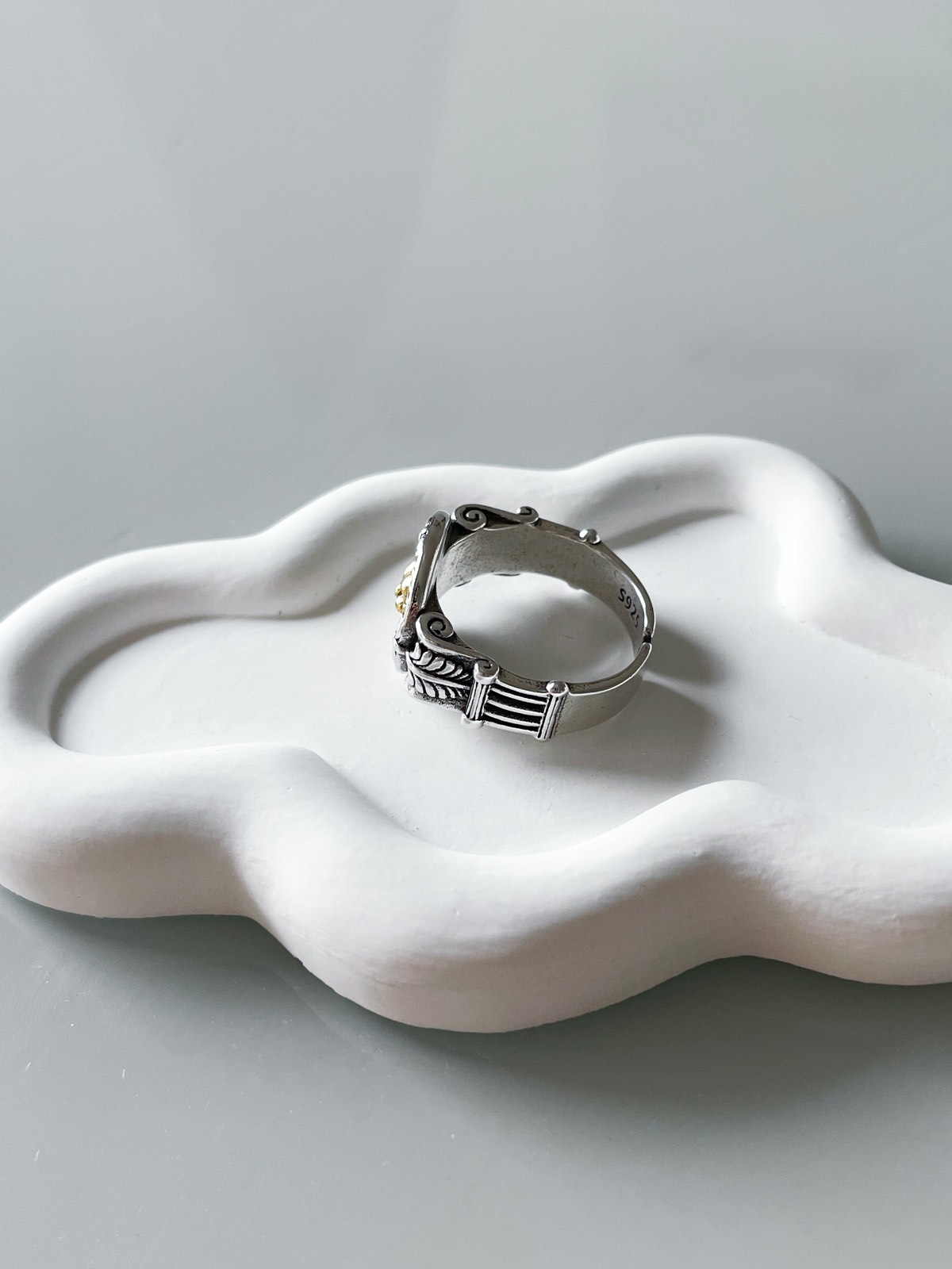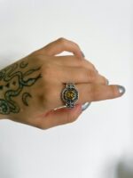 Numa vibe mais medieval, o anel Lion tem esse o leão em dourado na base prata que dá todo o charme à peça, e ainda na lateral podemos ver detalhes que deixam o anel mais perfeito ainda: os arabescos. Ele é de um tamanho médio e fica perfeito usado com outros anéis juntos. Se trata de uma peça sem gênero e possui regulagem.