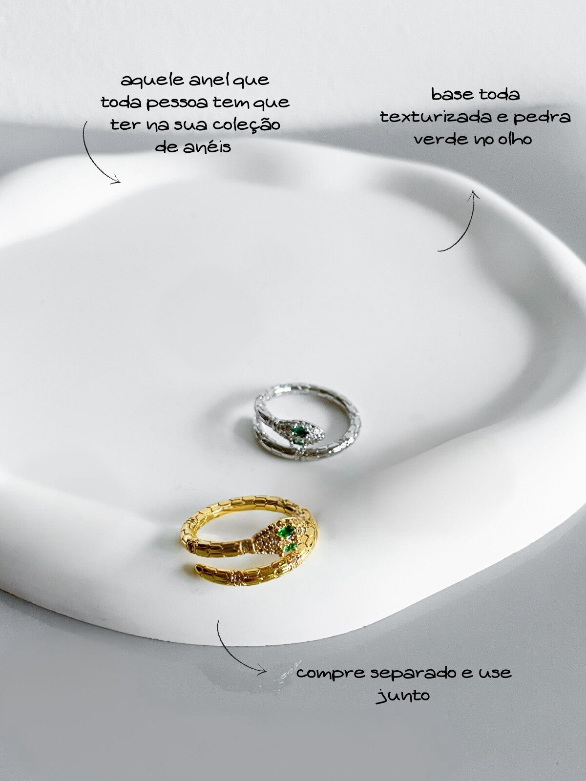 Muito amor pelas nossas peças com inspiração em cobra — sempre fazem o maior sucesso por aqui! E agora a novidade é essa versão incrível disponível em prata ou dourado, com a serpente toda detalhada envolvendo o dedo de um jeito super cool! O charme extra fica por conta do olhinho com pedrinha verde cravejada que dá aquele toque final. Super estiloso e divertido, é perfeito pra usar sozinho como destaque ou até misturar com outros modelos em prata, criando um mix cheio de atitude. Unissex, ajustável e com acabamento impecável. ENJOY!