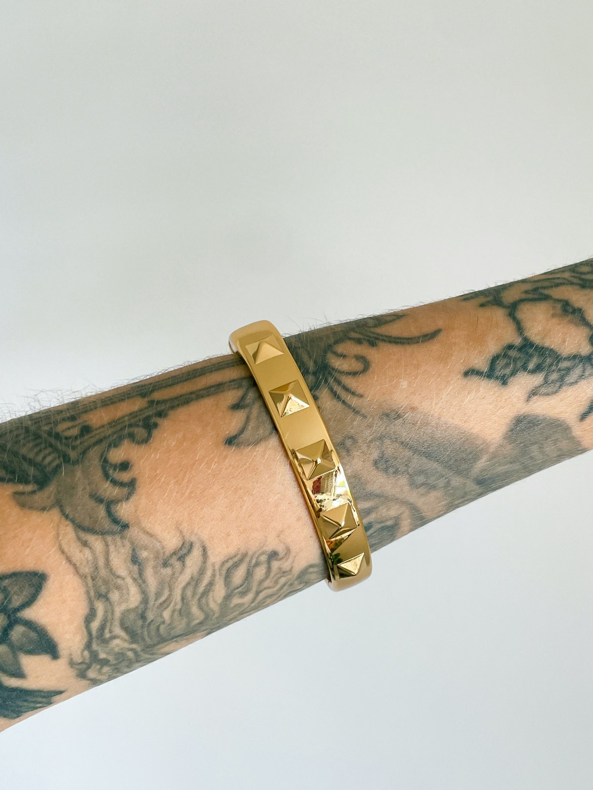 Bracelete Kim, super estiloso para os seus melhores looks: ele tem pirâmides em alto relevo que formam belíssimos spikes