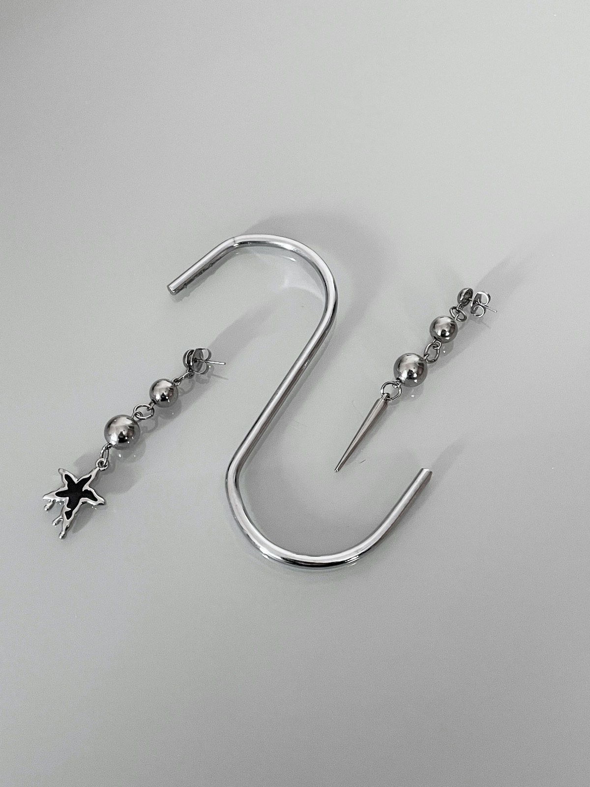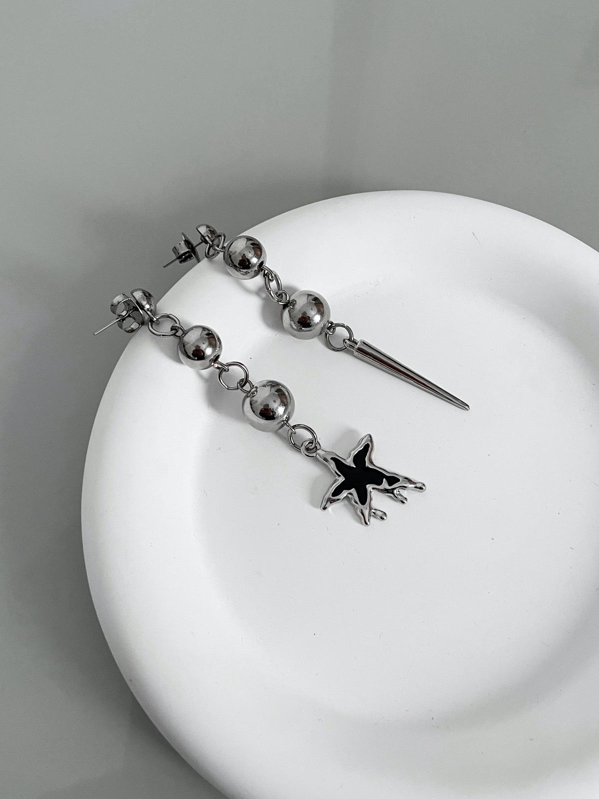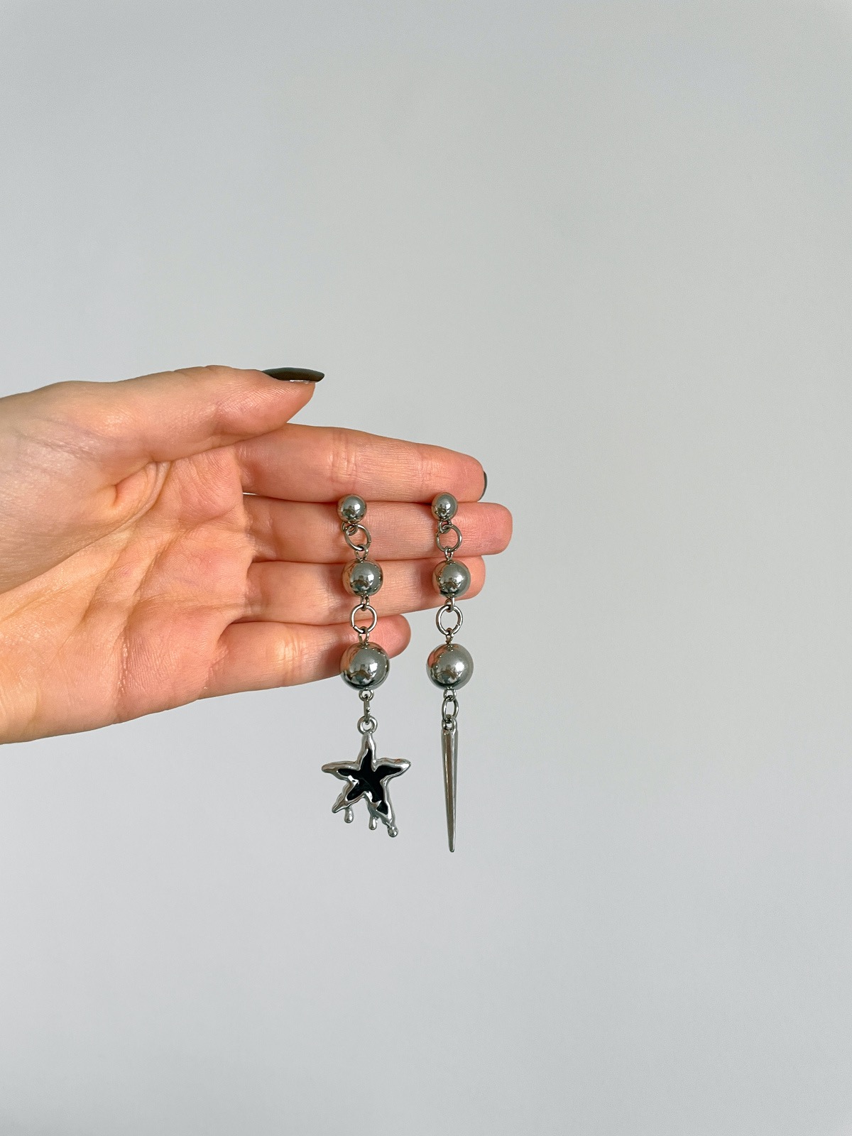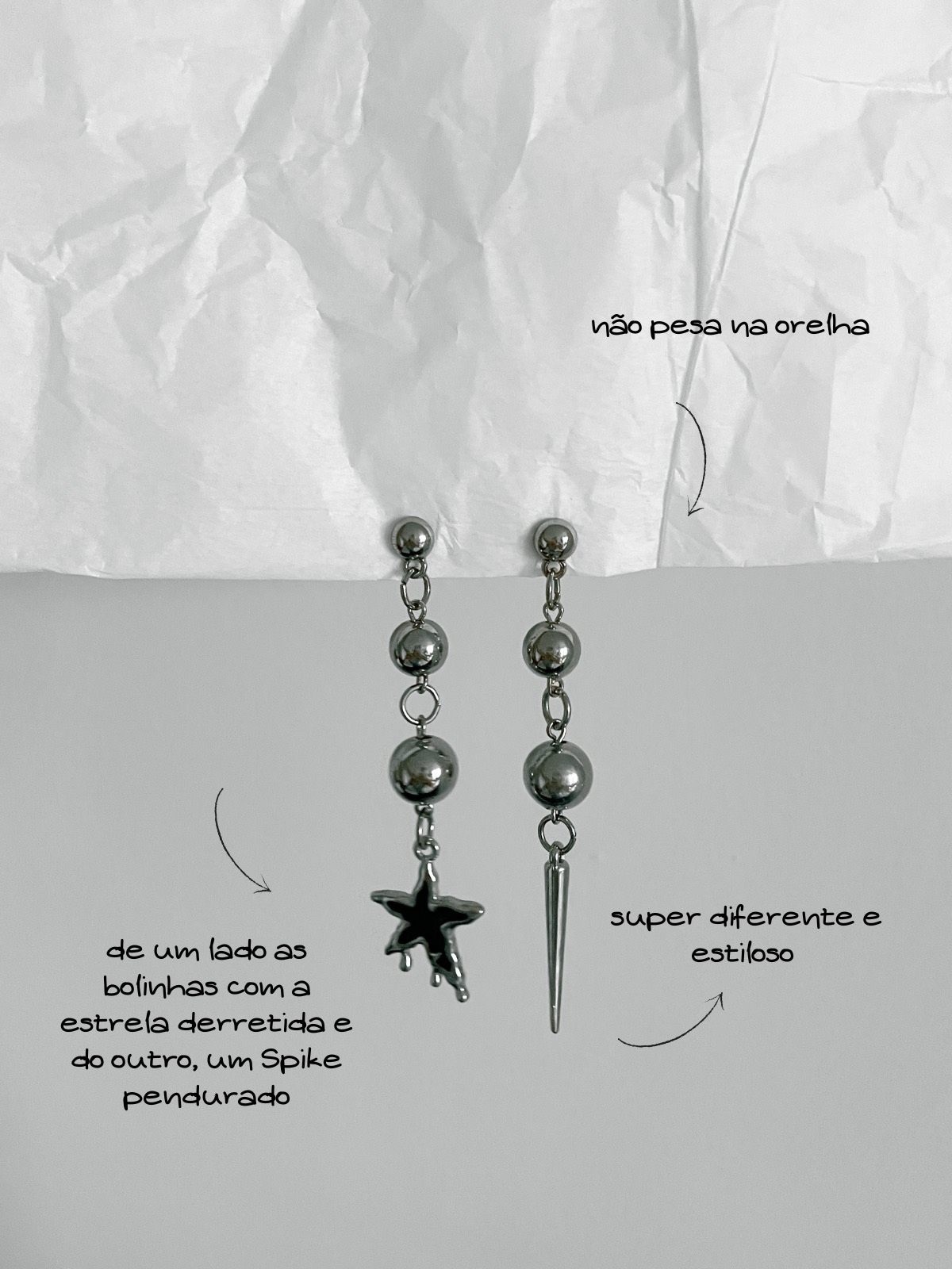 Um brinco divetido e com uma vibe futurista ao mesmo tempo, com essa estrela ”derretida” em resina preta e bolas de metal de diferentes tamanhos e do outro lado, as mesmas bolas de metal com um spike no final, deixando essa vibe assimétrica que amamos muito!