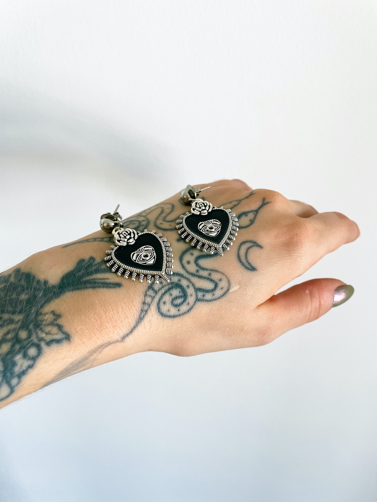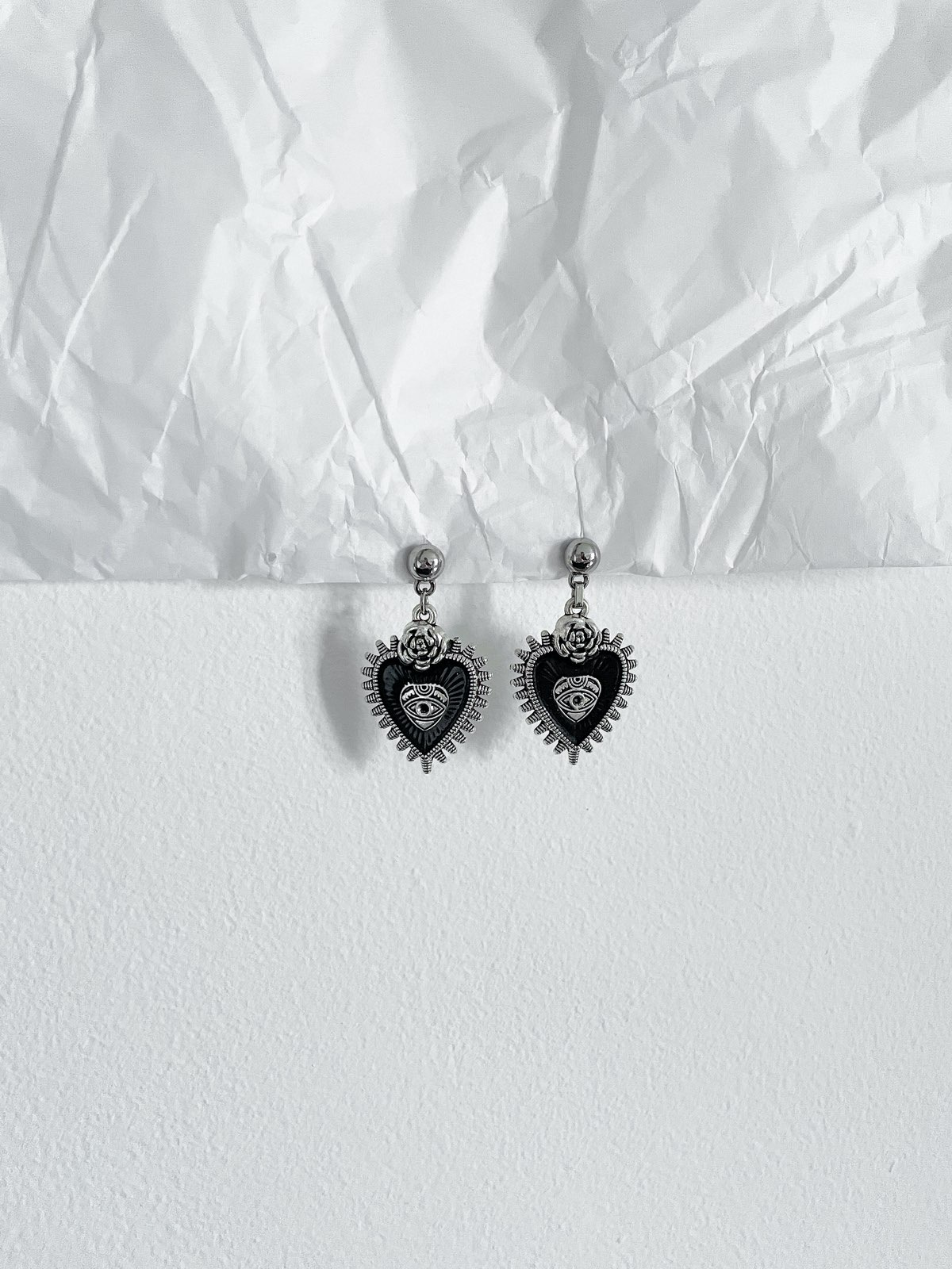 Brinco Cool Crush, feito com pingente coração sagrado esmaltado com resina preta