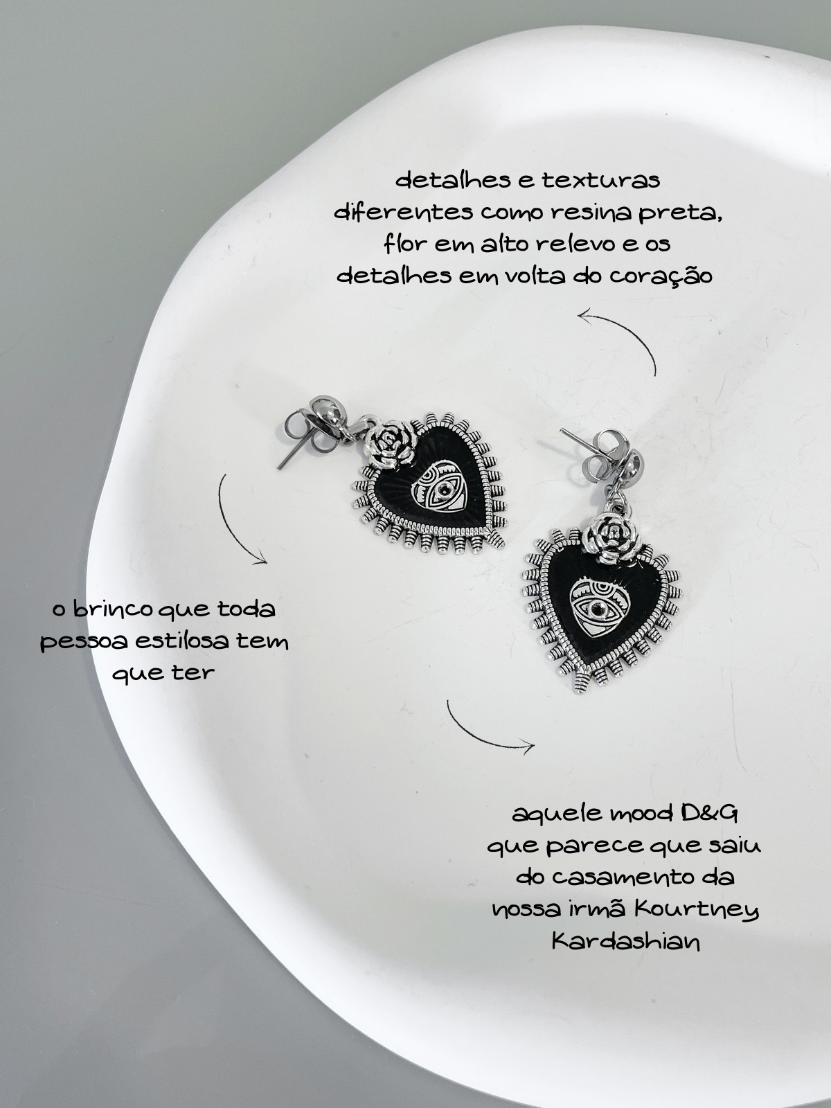 Na vibe D&G, olha que tudo esse brinco que parece ter saído diretamente do casamento da Kourtney Kardashian, a nossa irmã! Ele tem um olho no centro do coração e uma parte preta em resina que deixa o brinco super diferente e estiloso. Além disso, tem os raios em volta do coração e em cima perto da base, uma rosa incrível. É bem levinho e não pesa na orelha. Perfeito para complementar seus melhores looks. Clique aqui para comprar a versão prata envelhecido.