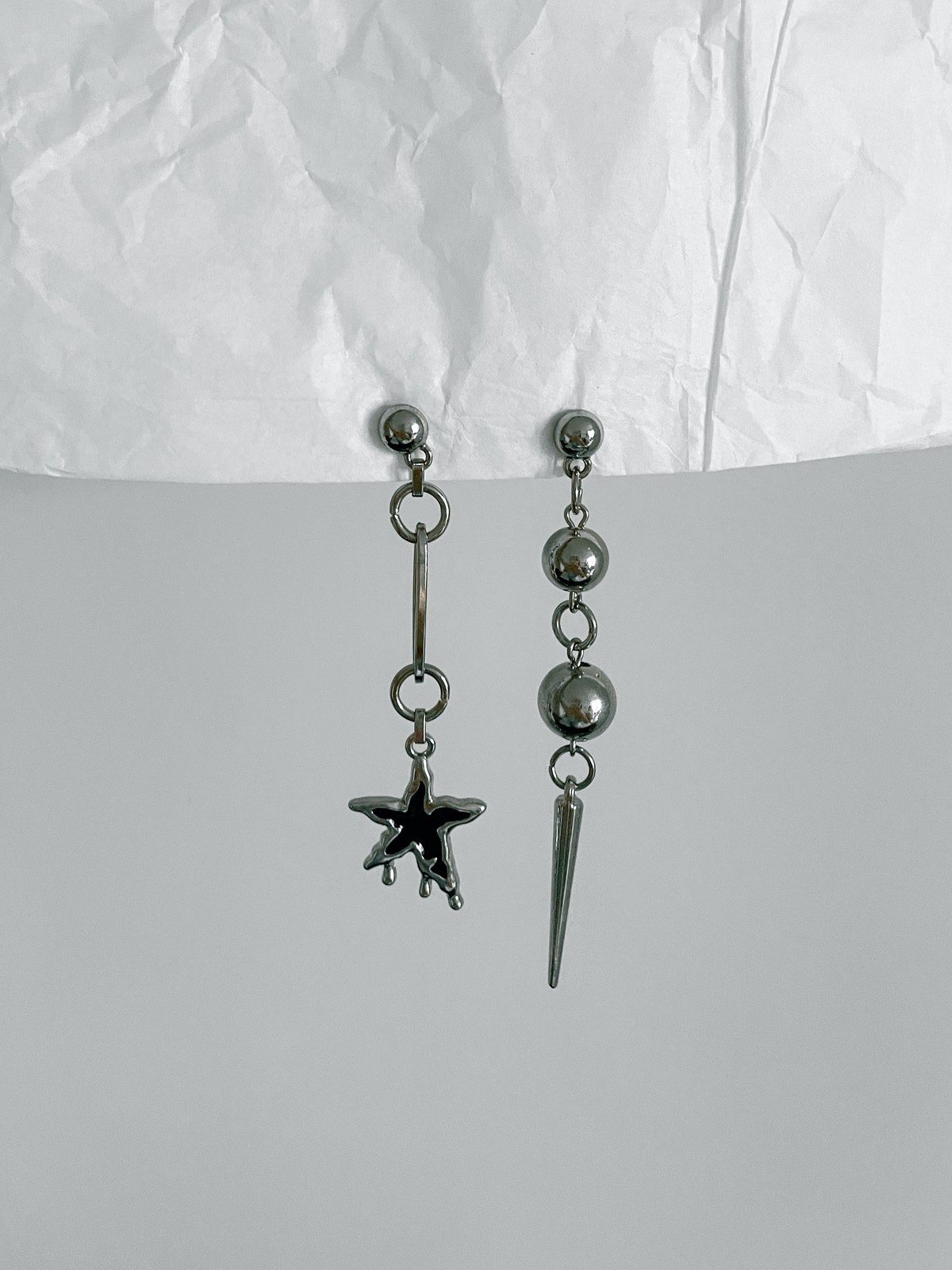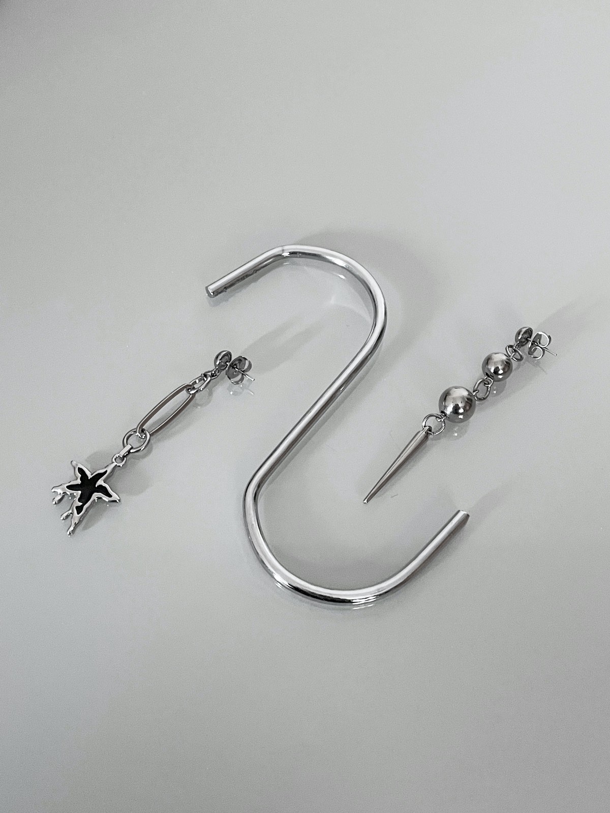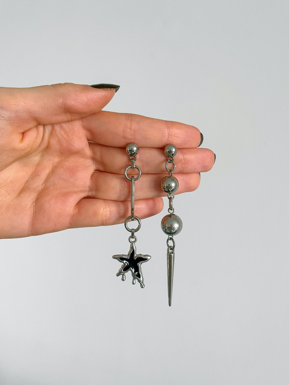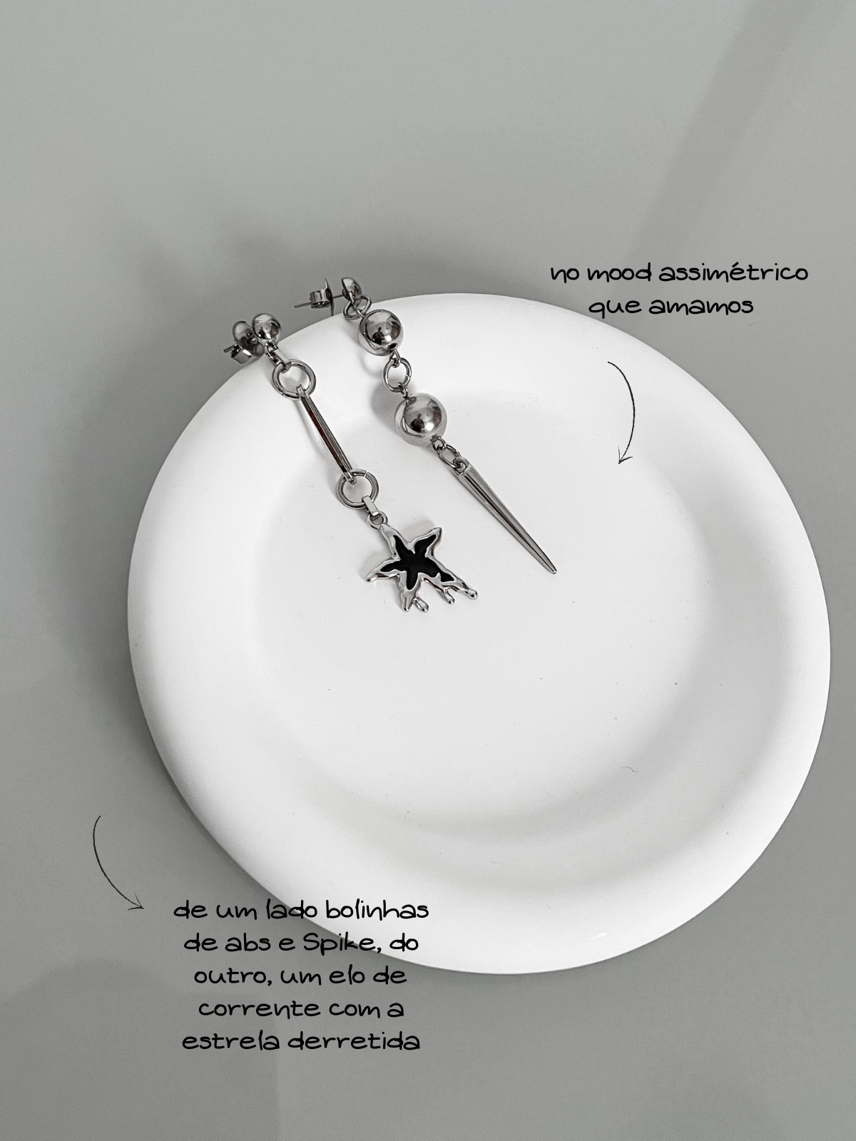Aquele mood assimétrico que amamos! De um lado, a estrela ”derretida” com um elo de corrente e do outro, o spike com bolas de metal em diferentes tamanhos. Uma peça super estilosa para os seus melhores looks.
