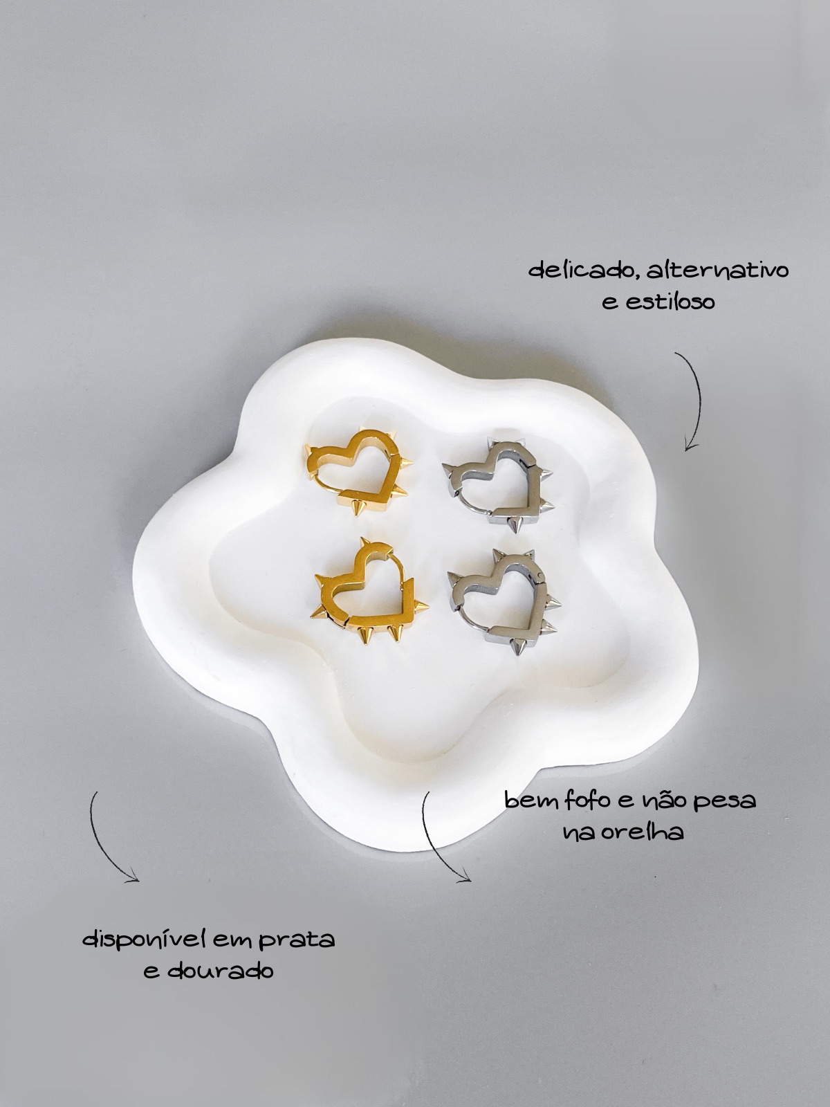 Olha que amor esse brinquinho de coração com mini spikes. Ele fica de lado na orelha e é aquele brinco perfeito para usar no dia a dia, sem deixar seu look sem graça. Disponível no prata e no dourado e aqui vai uma dica de amiga: que tal comprar o prata e o dourado e usar um de cada? Fica super estiloso e fora do óbvio.