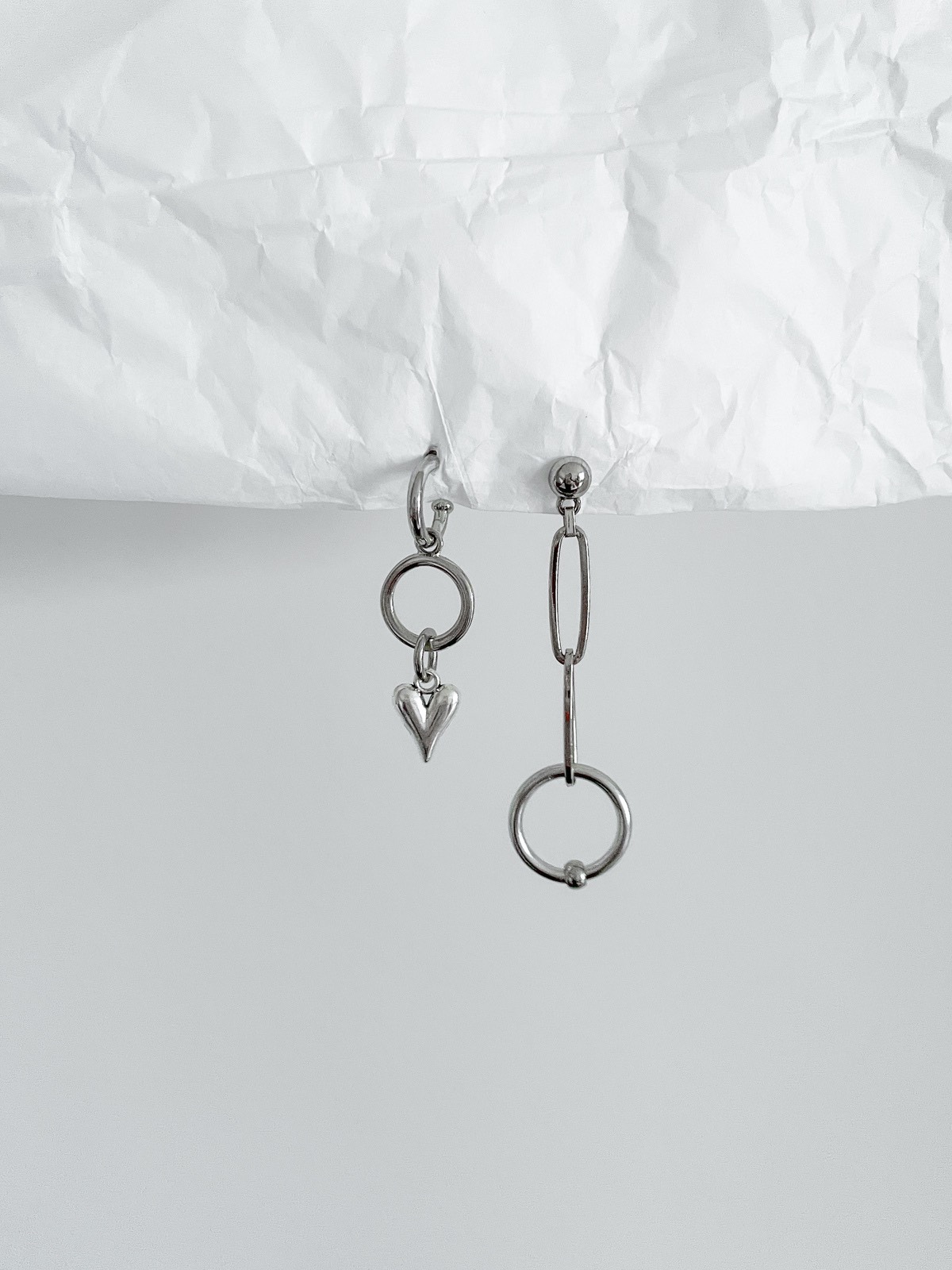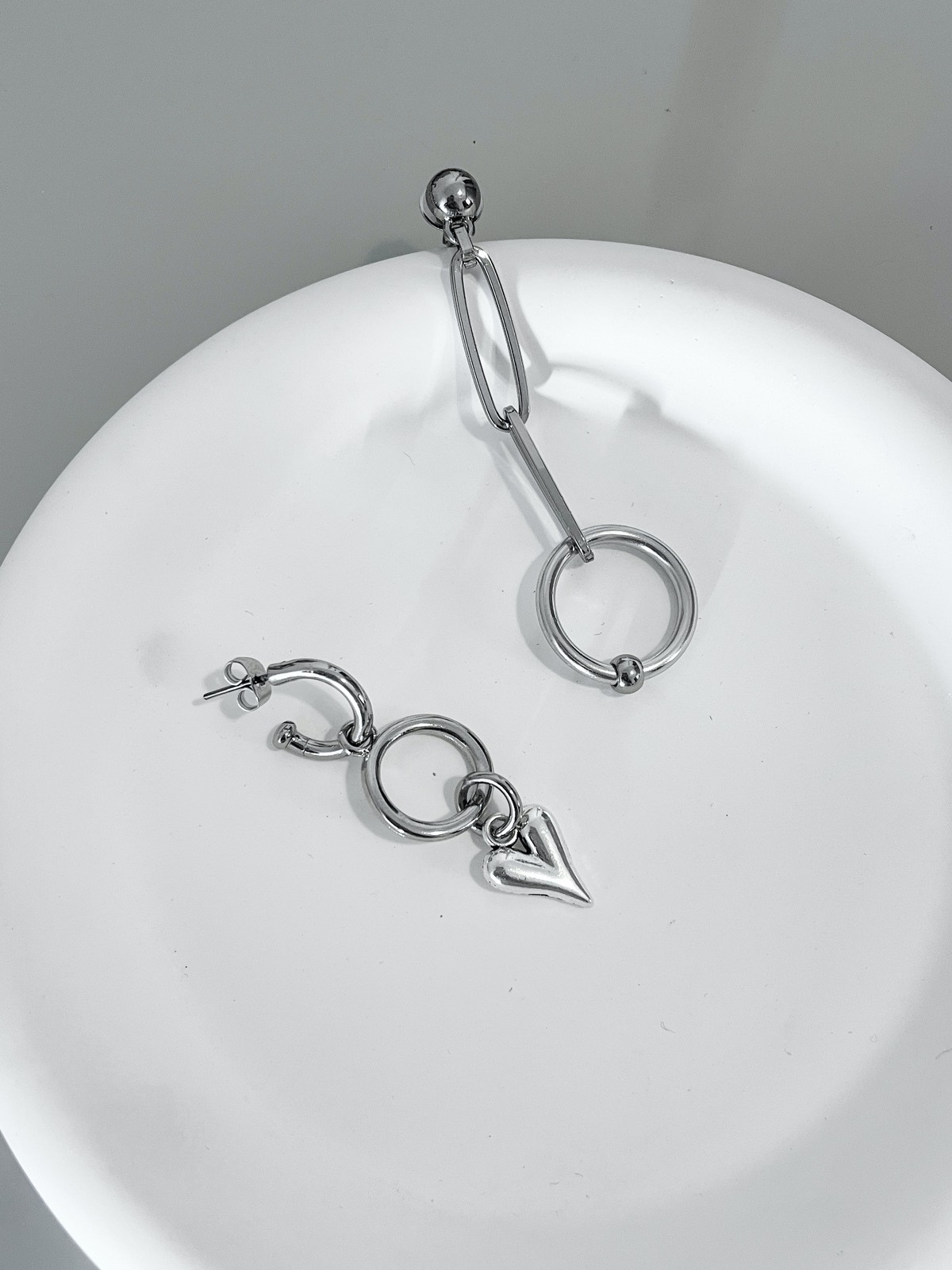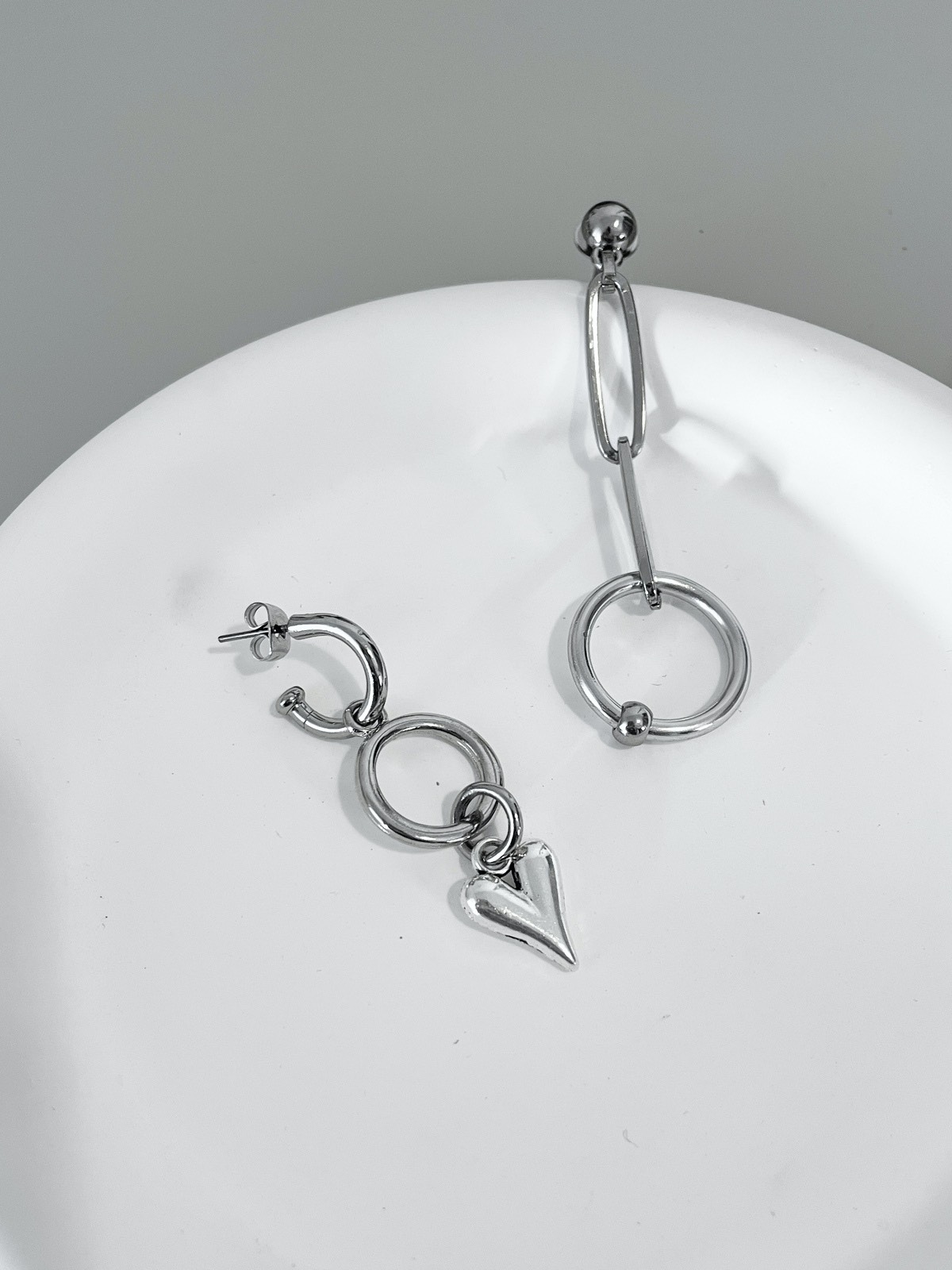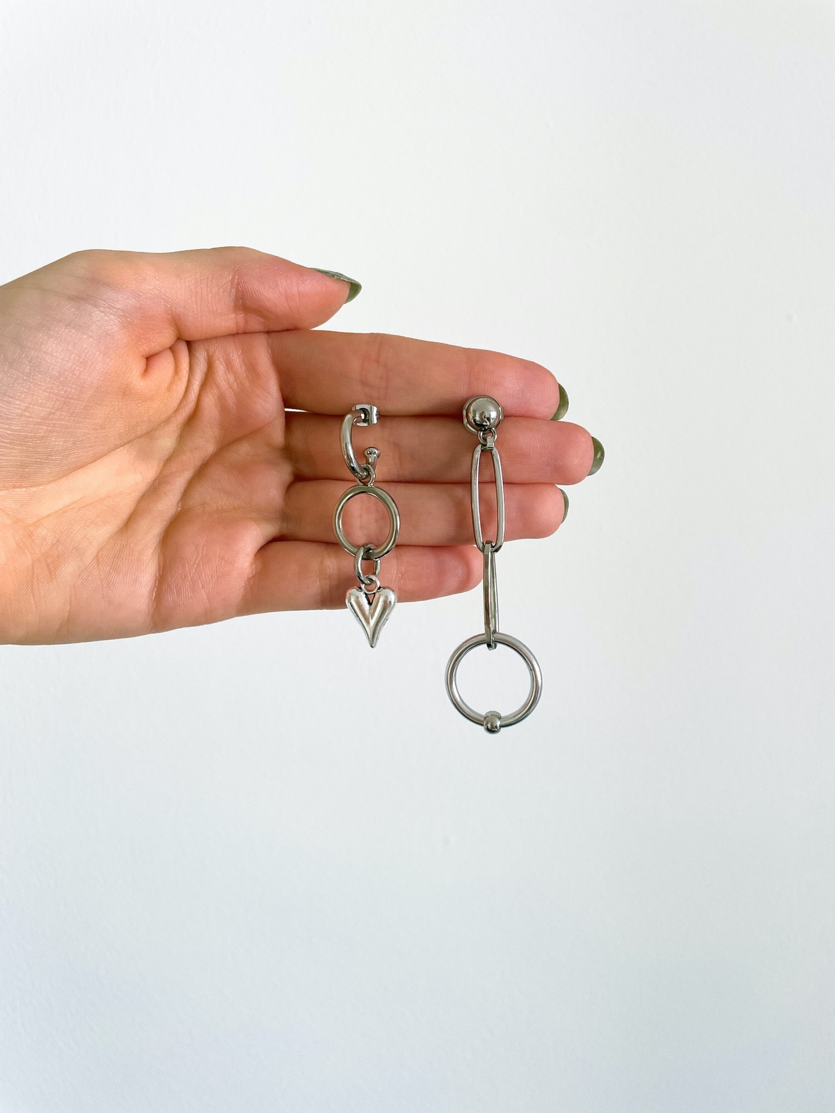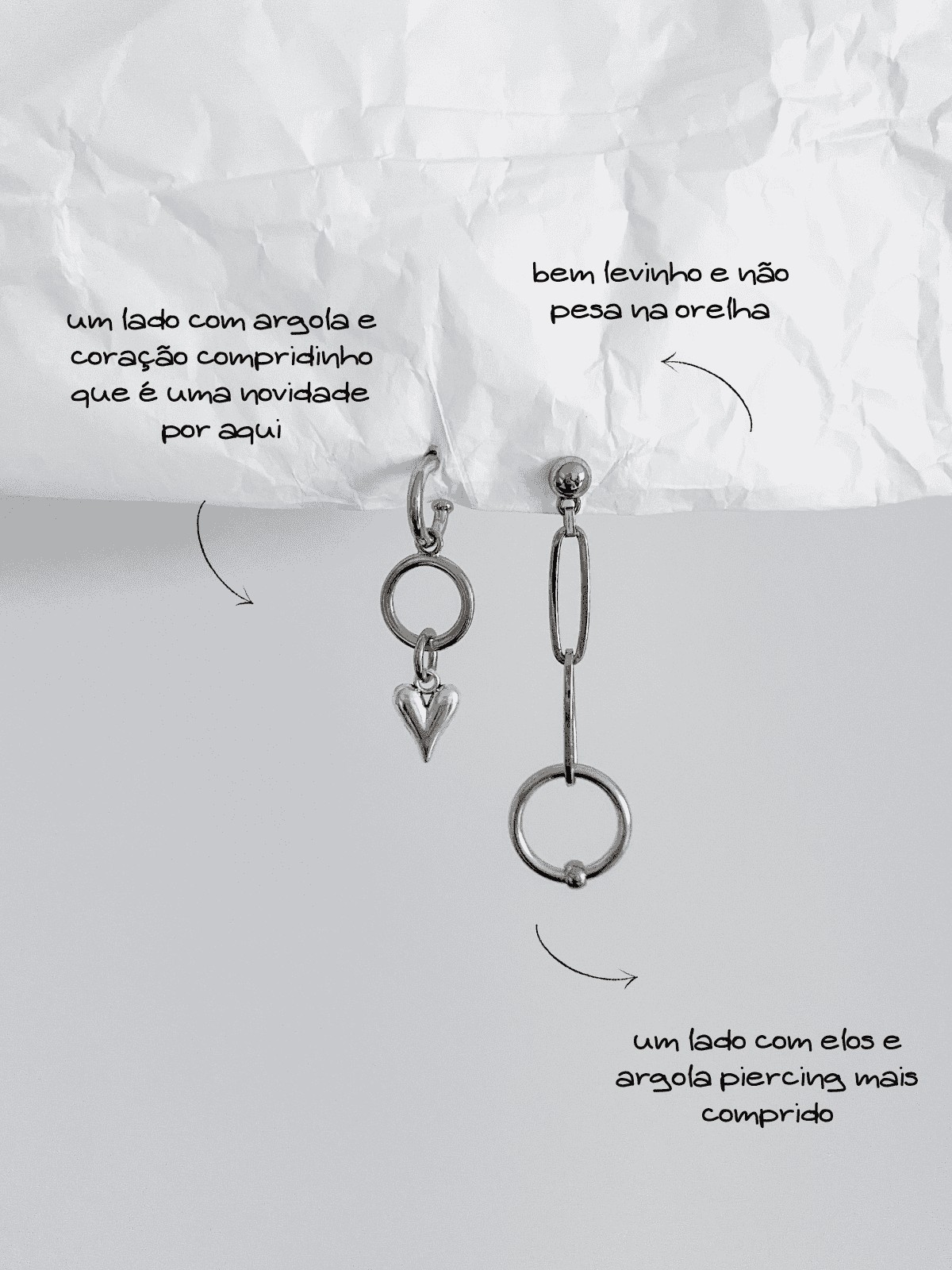 Um modelo diferente de tudo que já tivemos por aqui: você vai se apaixonar! Ele tem assimetria, tem elementos alternativos como os elos de corrente e a argola piercing, e ainda tem esse coração bem diferente e estiloso trazendo uma vibe mais romântica. E o mais legal é que até base é assimétrica. De um lado temos a argolinha e do outro, a base de bolinha, deixando o brinco ainda mais cool.