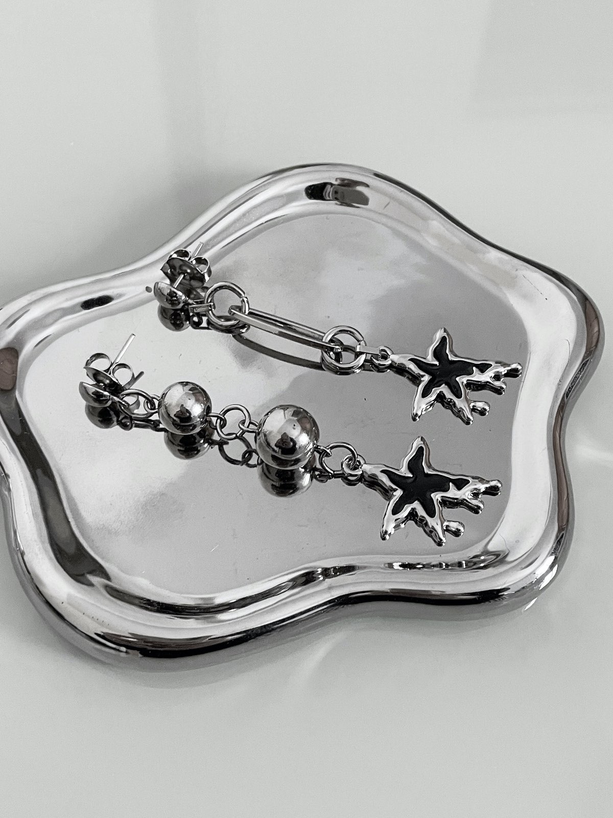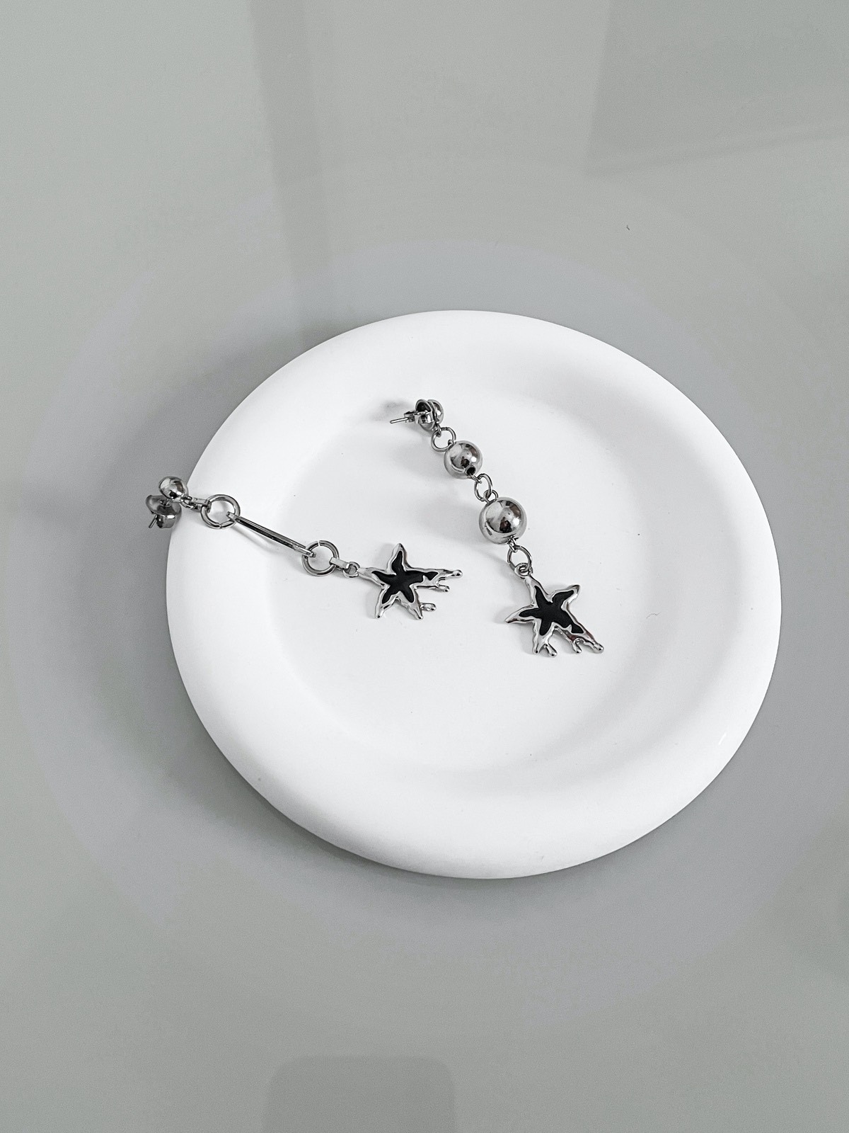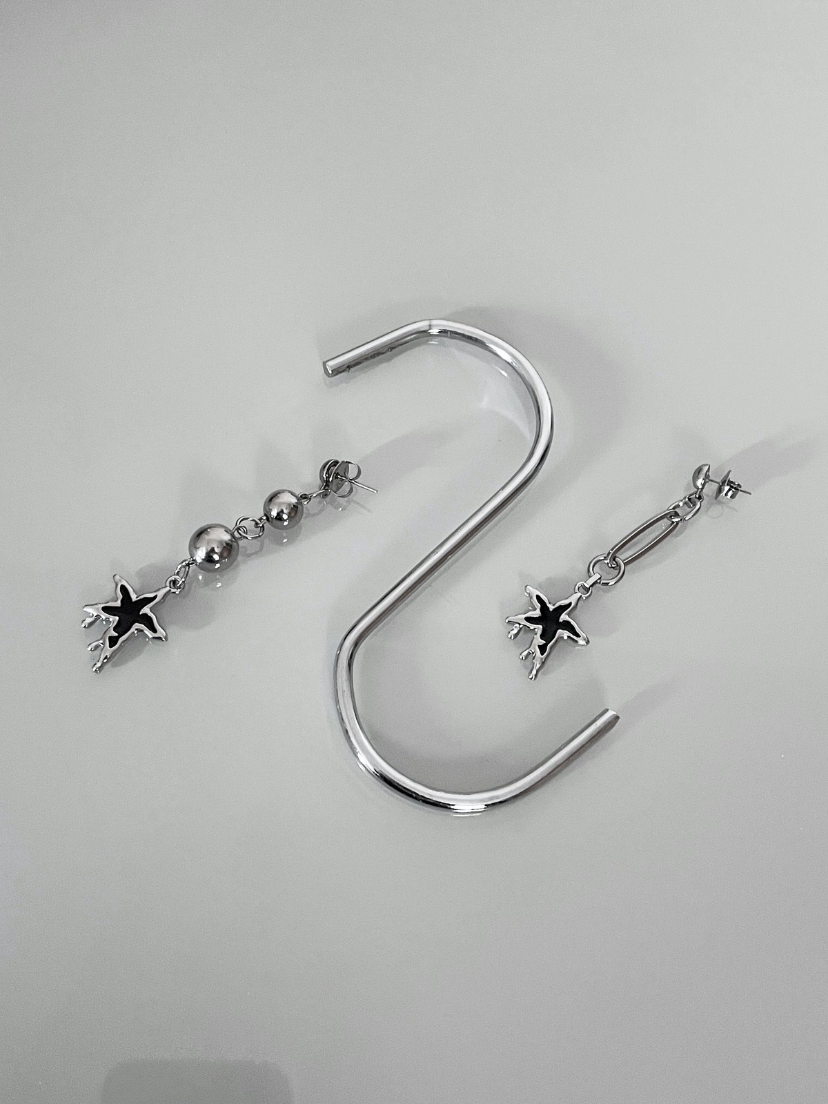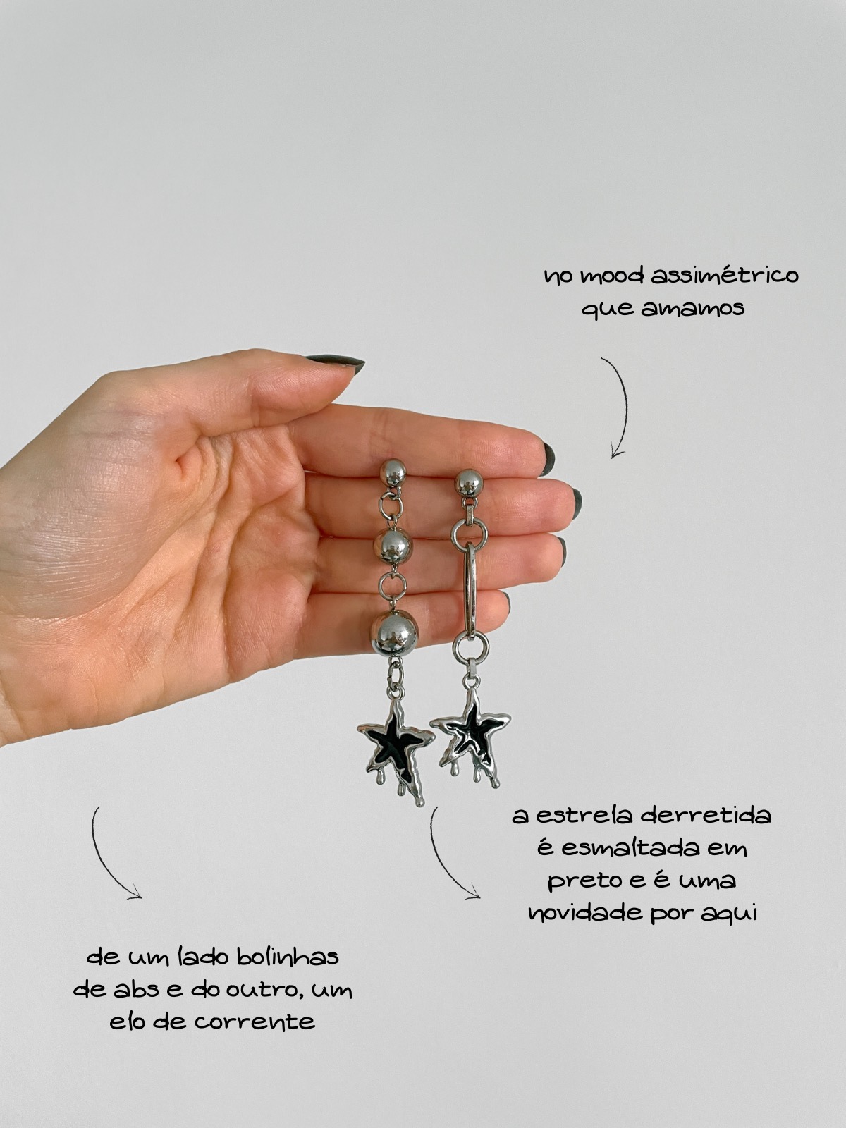 AAA que amor! Olha que fofinha essa estrela ”derretida” em resina preta assimétrica. De um lado, a estrela acompanha bolas de metal em diferentes tamanhos e do outro, um elo de corrente super diferente e divertido. Bem levinho e não pesa na orelha, além de ser muito estiloso.
