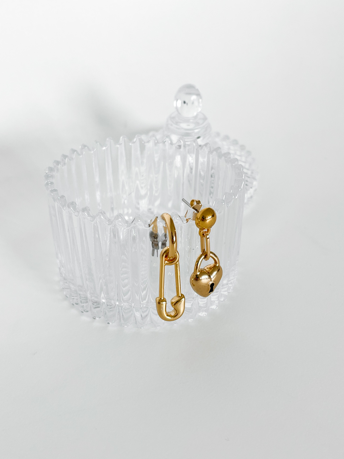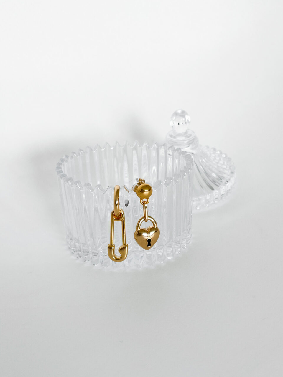 Os assimétricos que amamos e dessa vez mega fofo e cheio de atitude. O coração é uma super trend do momento e o alfinete é um queridinho por aqui. Quem aí ama nossas peças em dourado? Enjoy.