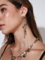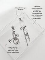 OMG! Apresentamos a vocês uma das maiores tendências do momento em acessórios: o pingente em forma de prego, peças de engrenagem e construção, parafusos e muito mais. Até a Lady Gaga já aderiu e você não vai querer ficar de fora babe! Esse brinco assimétrico conta com um lado de ponto de luz, elo transparente mega diferente de tudo que já trouxemos aqui, um piercing grande, bolinhas de metal, pingente sparkle, gota de cristal e a corrente bubble mini penduradinha que amamos. Já do outro lado temos o babadeiro pingente de ”prego”, elo em metal e uma argola piercing que amamos. Bapho né?!