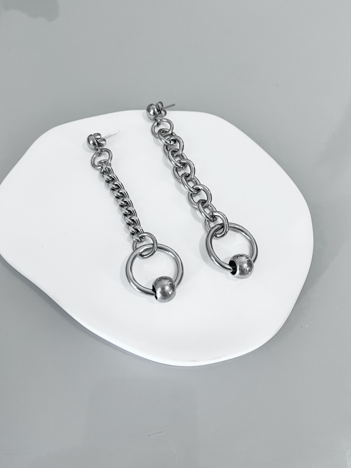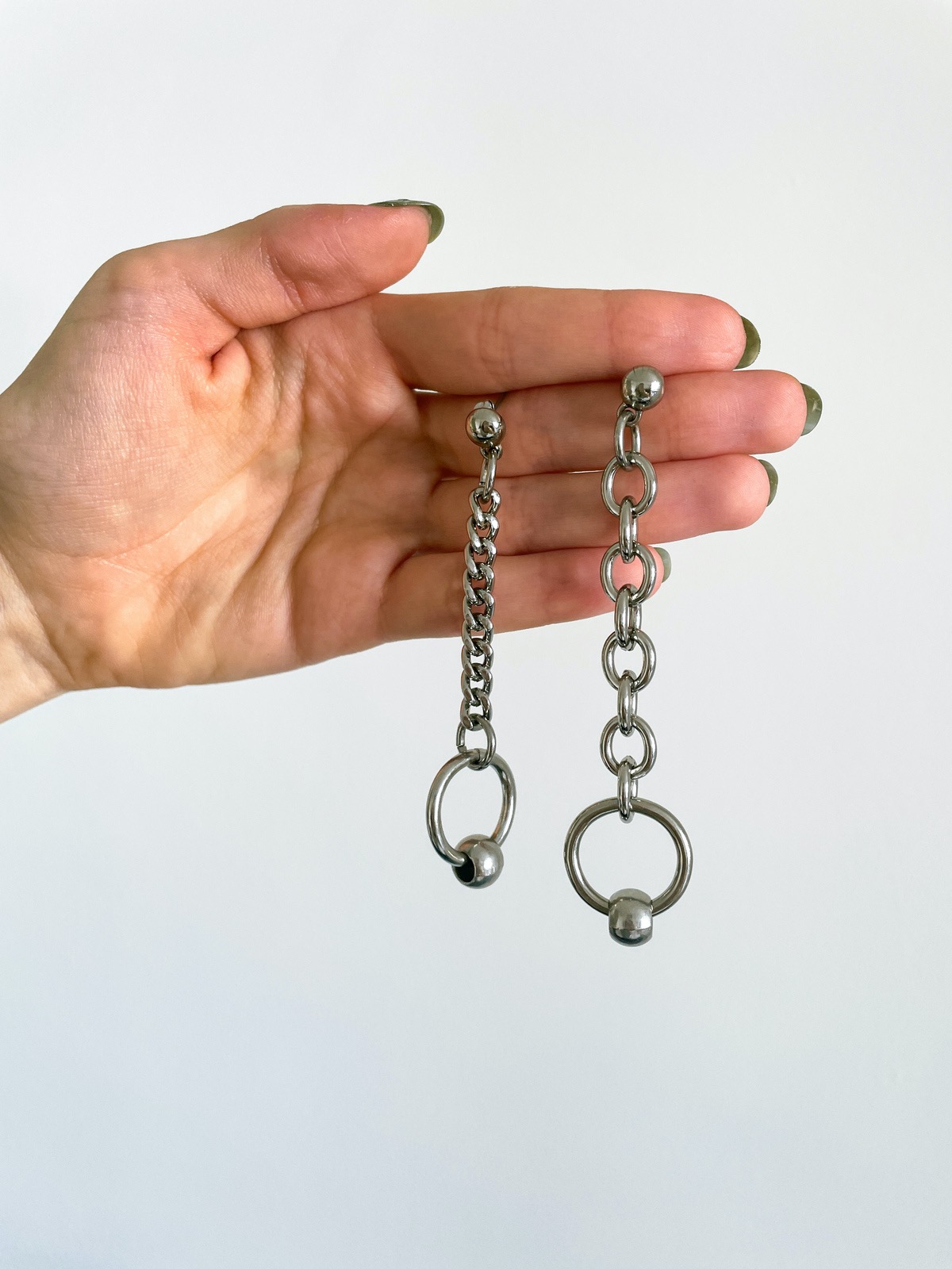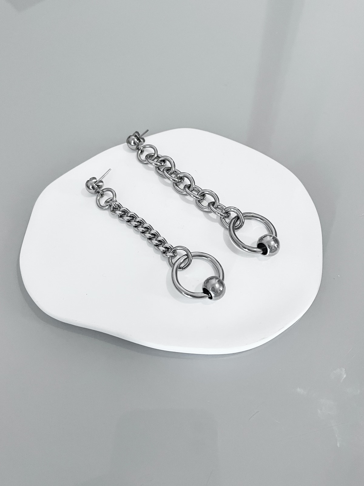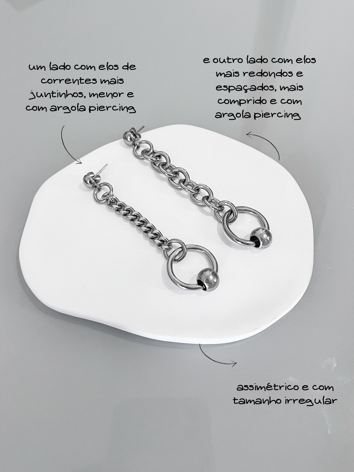 Aquele clássico alternativo e assimétrico que amamos e é super atemporal: aquele brinco que toda coleção merece ter! Ele tem correntes e argolas piercing dos dois lados mas um lado é mais comprido e mais grosso do que o outro, o que deixa a peça super fun.