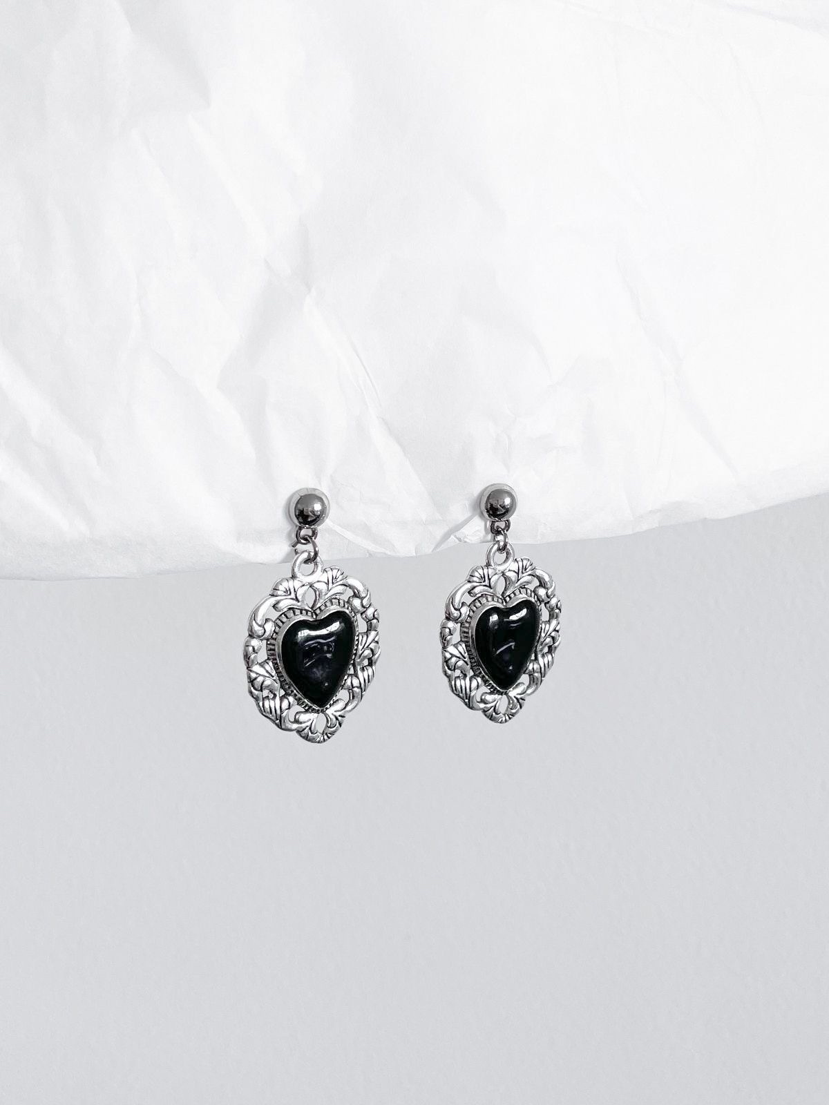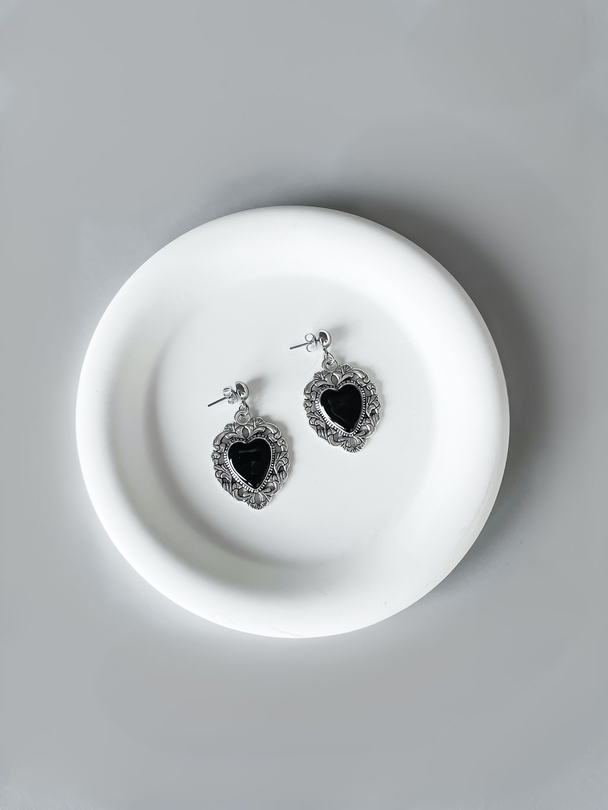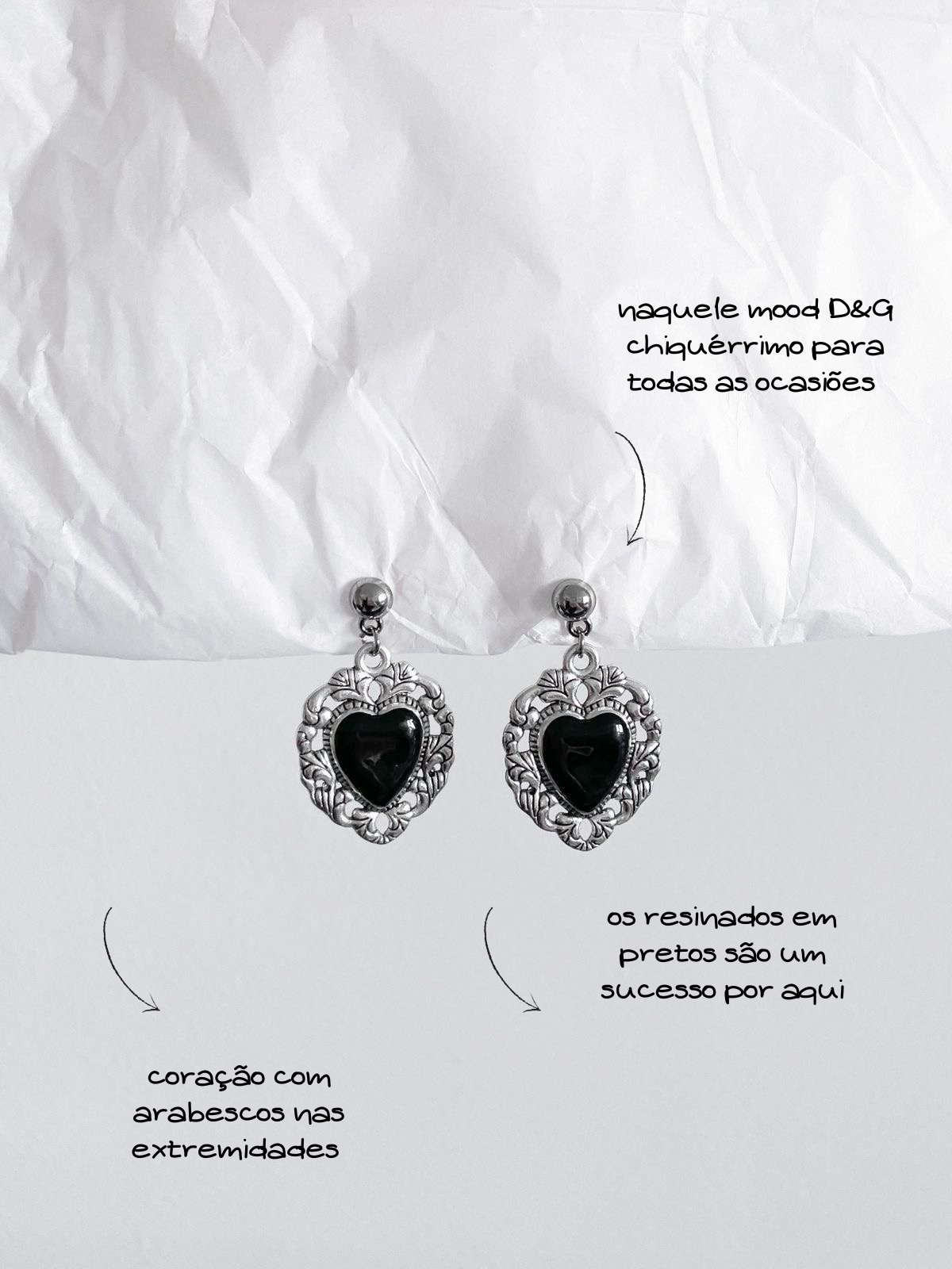 Brinco Velvet Love, feito com pingente de coração arabesco, esmaltado preto