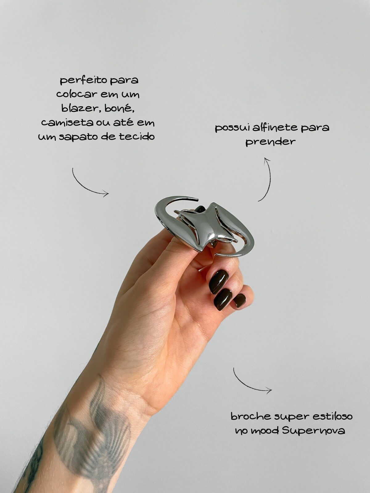 ALERTA DE OBSESSÃO! Ok, talvez você não esteja preparado pra isso: nossos broches mais estilosos e diferentões chegaram — e estão causando! Esse aqui tem uma vibe SUPERNOVA FUTURISTA, com design 3D que parece ter saído de outra galáxia. Feito em metal cromado espelhado, ele brilha muito e tem esse shape de estrela orgânica que está bombando nas trends. É o tipo de acessório que transforma qualquer look: vai bem em blazers, bolsas, bonés, tênis, gravatas, regatas básicas ou camisas oversized. Já pensou um mix desse com outros broches? Se você ama uma estética bold, maximalista e nada óbvia — esse broche foi feito pra você. Sparkle com atitude.