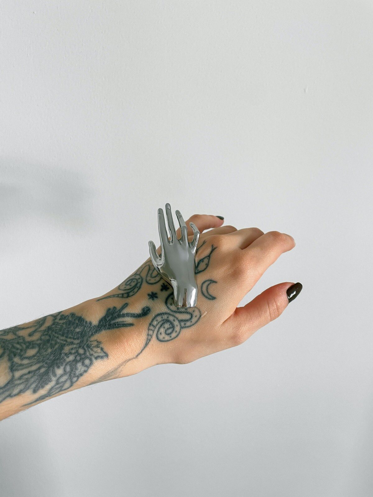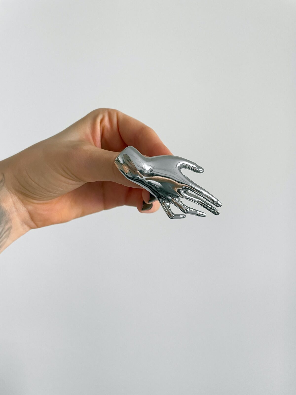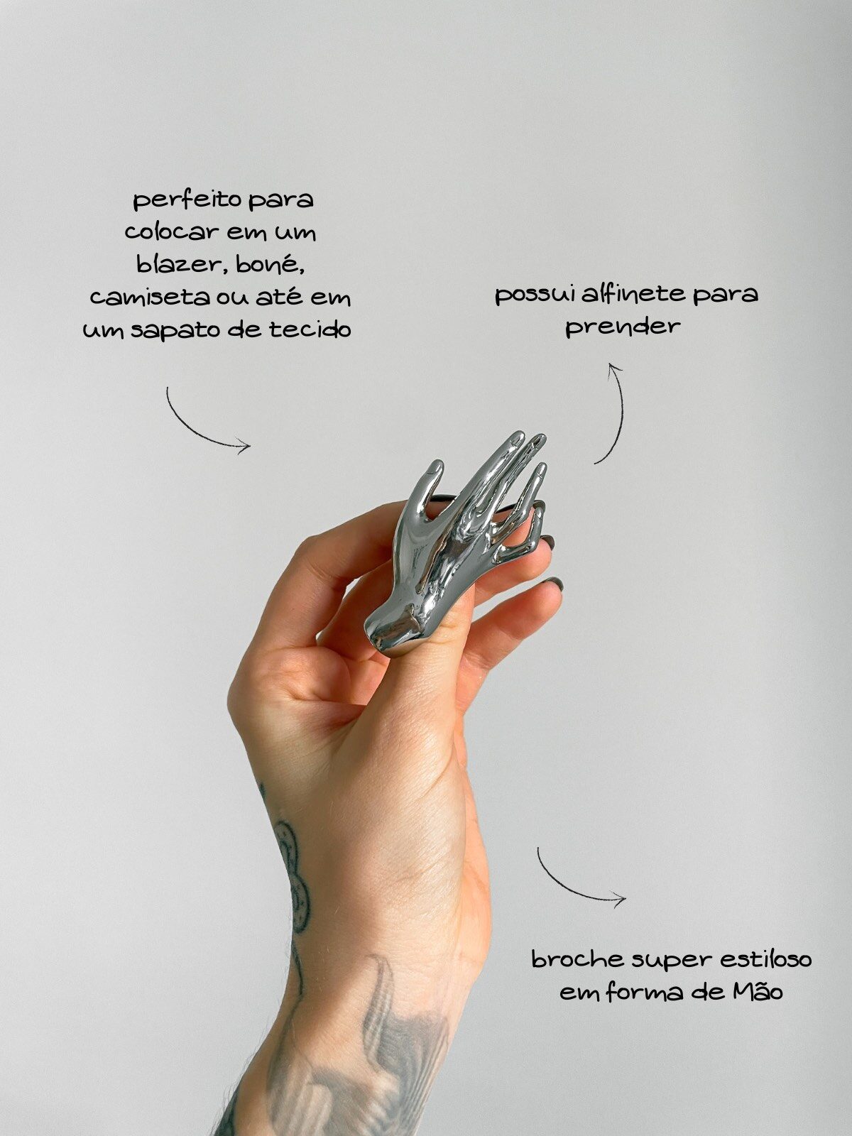 UM ESCÂNDALO DE BROCHE! Essa mão cromada em metal espelhado é, sem dúvida, um dos acessórios mais impactantes que já lançamos. O design futurista com toque surreal traz uma estética única e cheia de personalidade — como se uma mão prateada estivesse flutuando sobre o look. Chiquérrimo, dramático e com aquele ar misterioso que a gente ama, ele eleva qualquer produção: de uma camiseta básica a um blazer de alfaiataria. Dá pra usar em bolsas, lapelas, gravatas, golas ou até como detalhe inusitado em um penteado. Um broche statement e impossível de passar despercebido. Pegue o seu antes que suma das mãos!