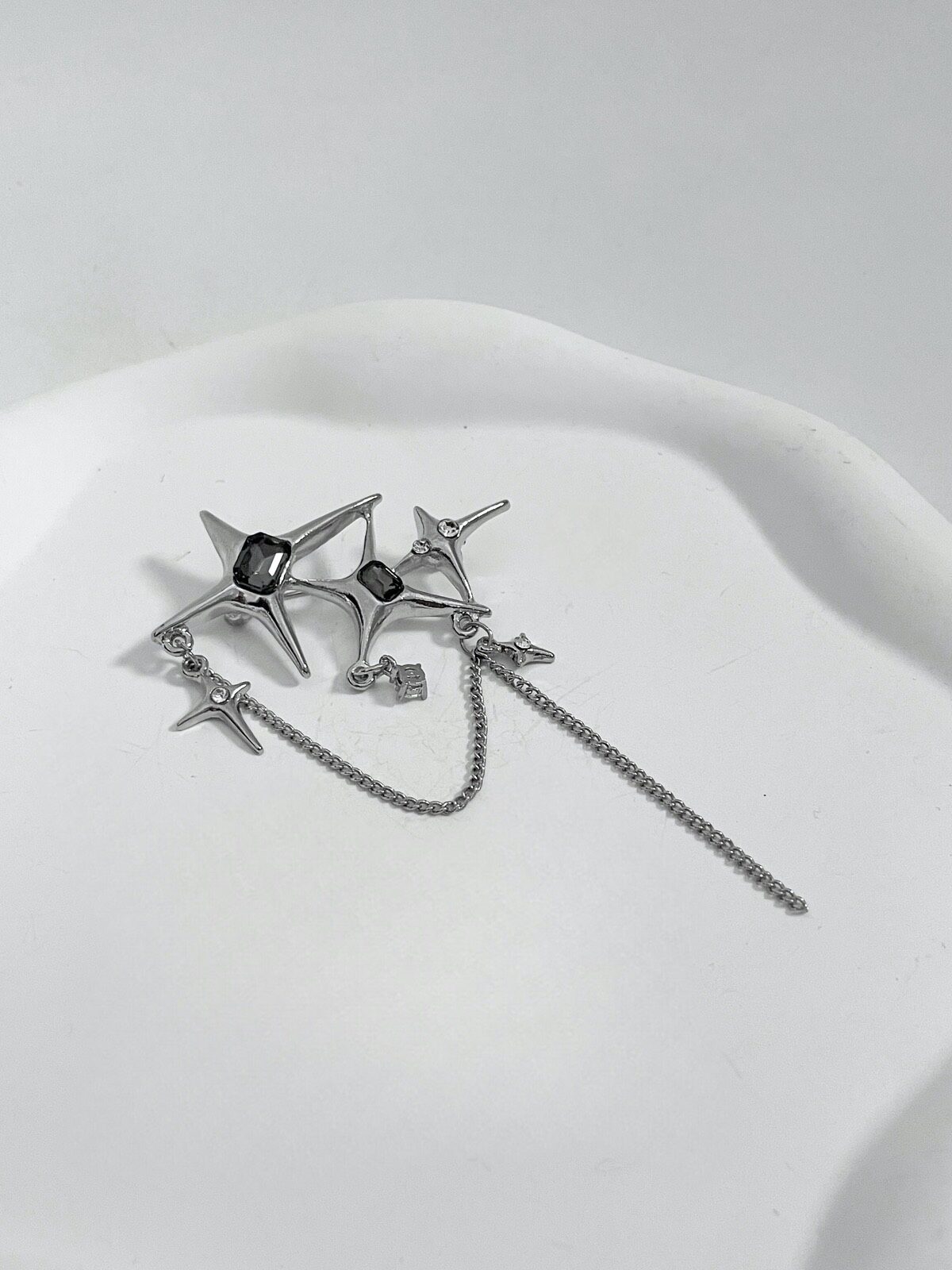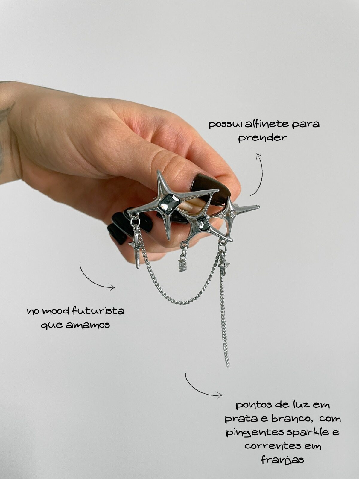 Broche Sparkle, super estiloso! Feito de metal prata, com formato de estrela sparkle e franjas de corrente