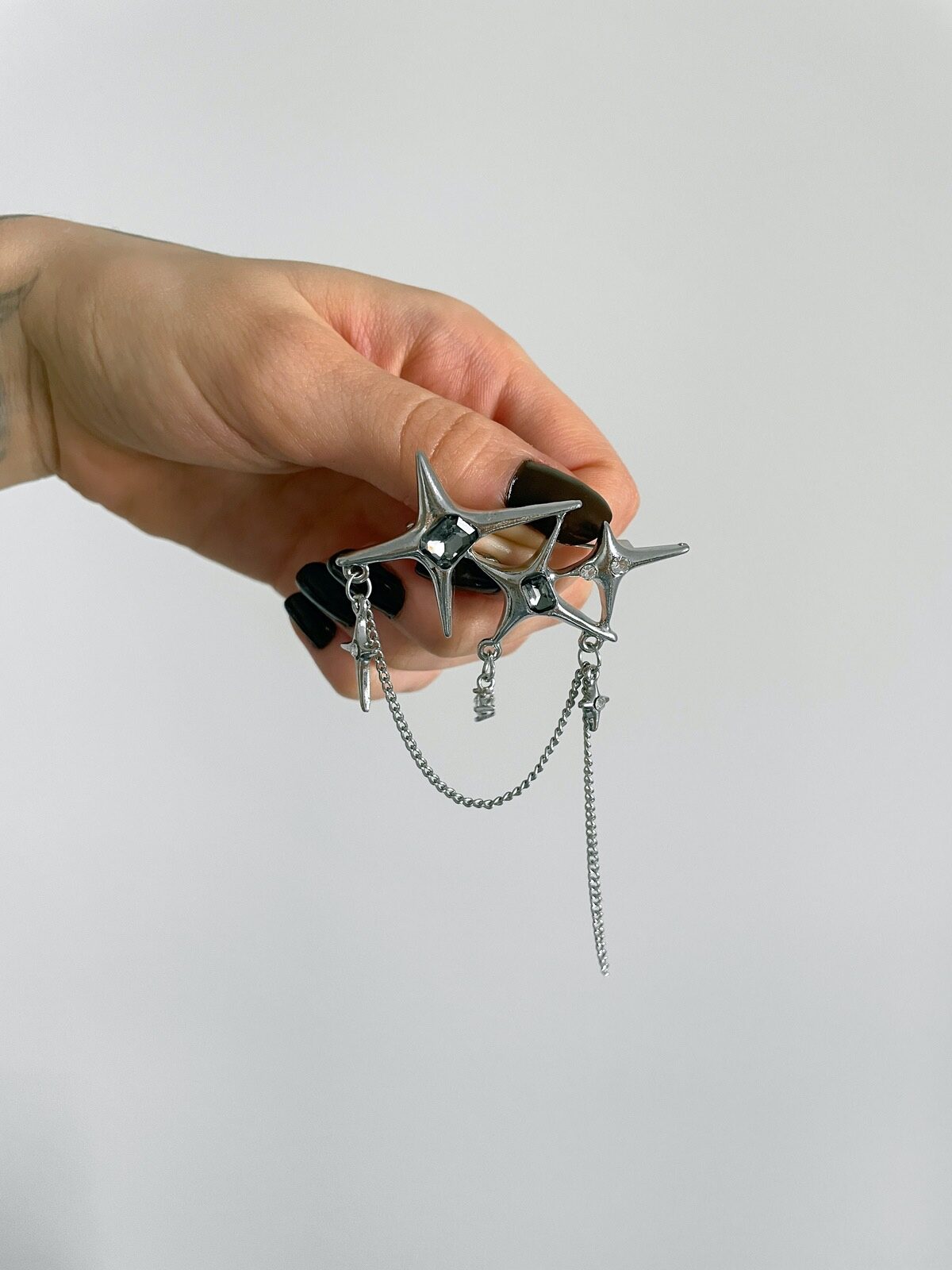 Whaaat? Sim, é isso mesmo que você viu! Agora temos broches super estilosos pra levar suas customizações a outro nível! Esse modelo tem uma composição surreal de estrelas com design orgânico e acabamento cromado espelhado, criando um visual futurista e tridimensional que brilha de qualquer ângulo. O toque final fica por conta dos detalhes: strass central com um sparkle hipnotizante, correntes penduradas em camadas, mini pingentes e franjas que trazem movimento e uma vibe Pinterest que a gente ama! Use em blazers, mochilas, bolsas, ou até pra dar aquele twist inesperado em uma camiseta básica. Um acessório cheio de personalidade que transforma qualquer look em statement.