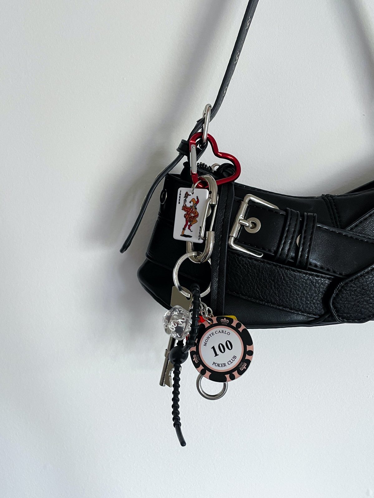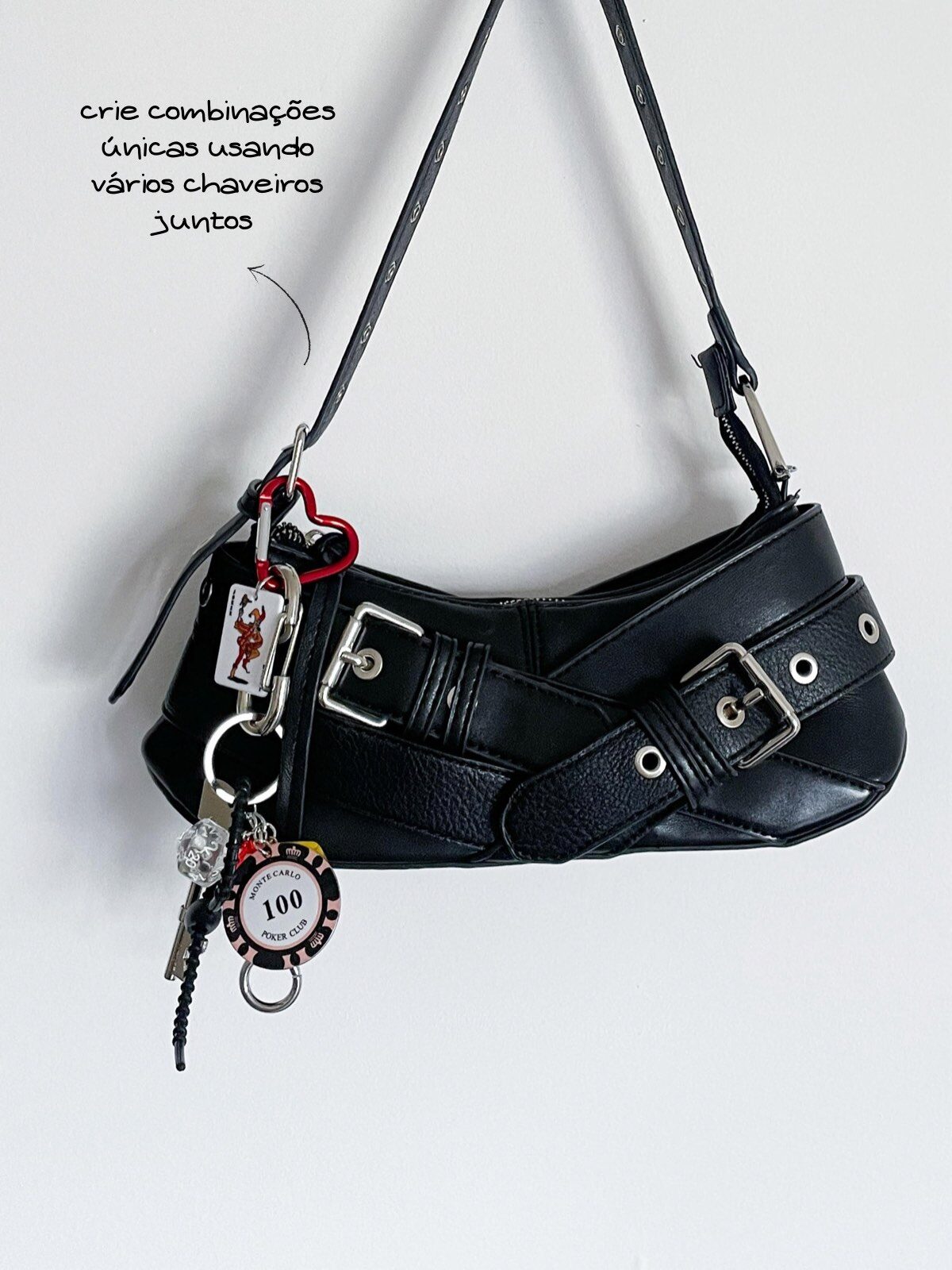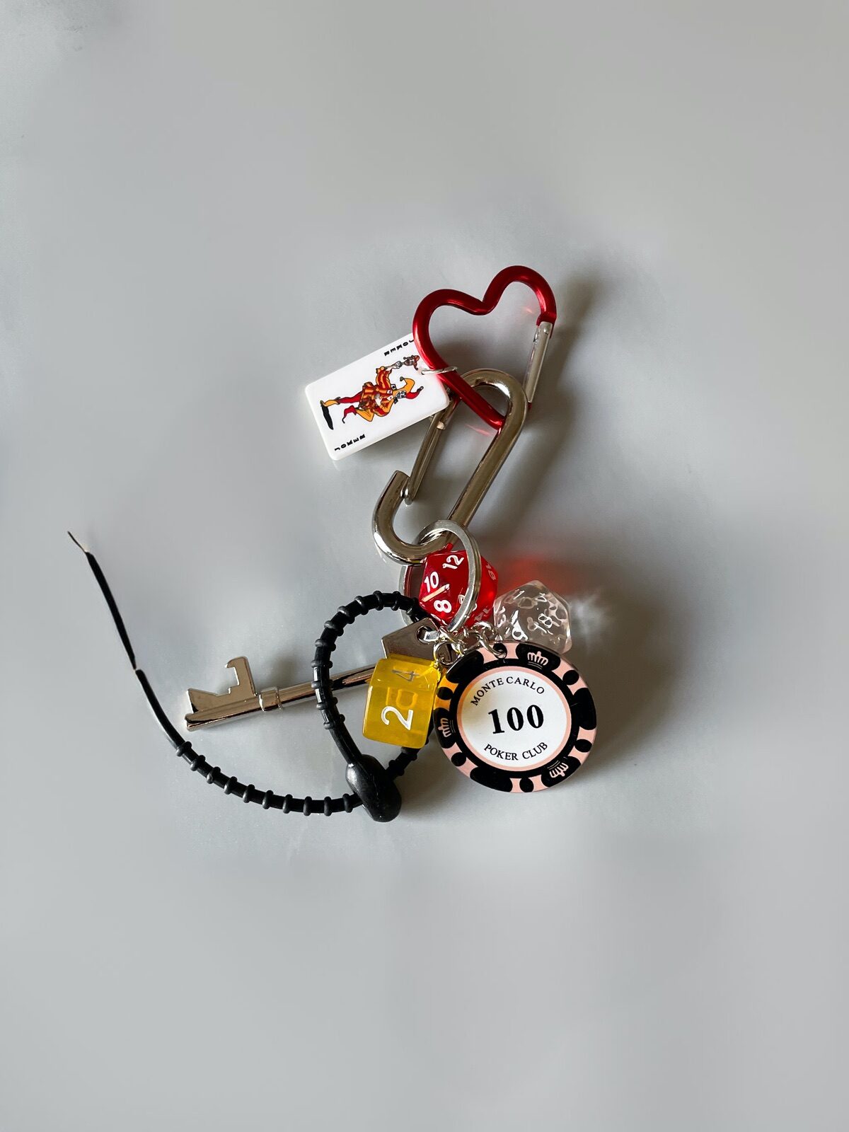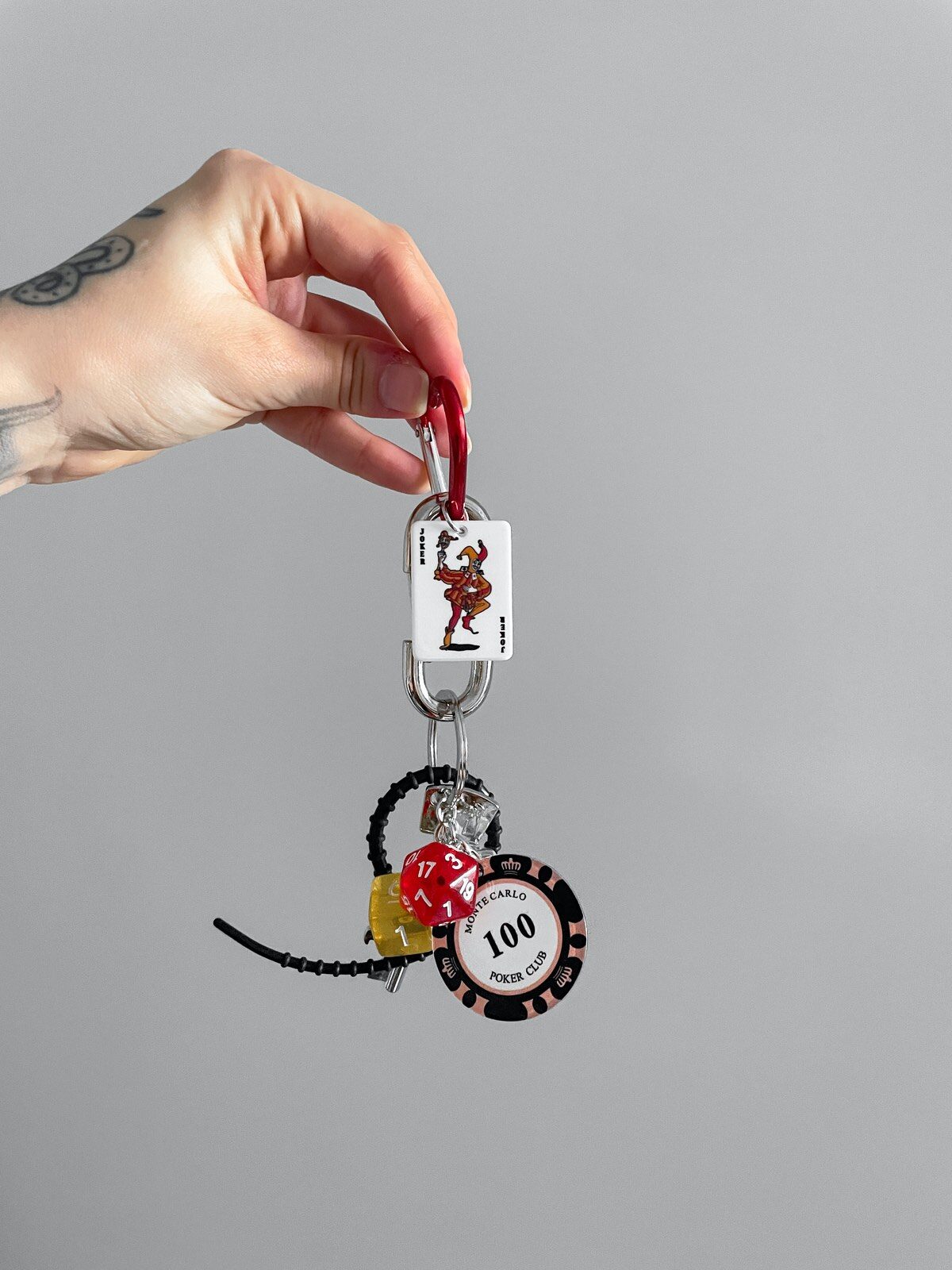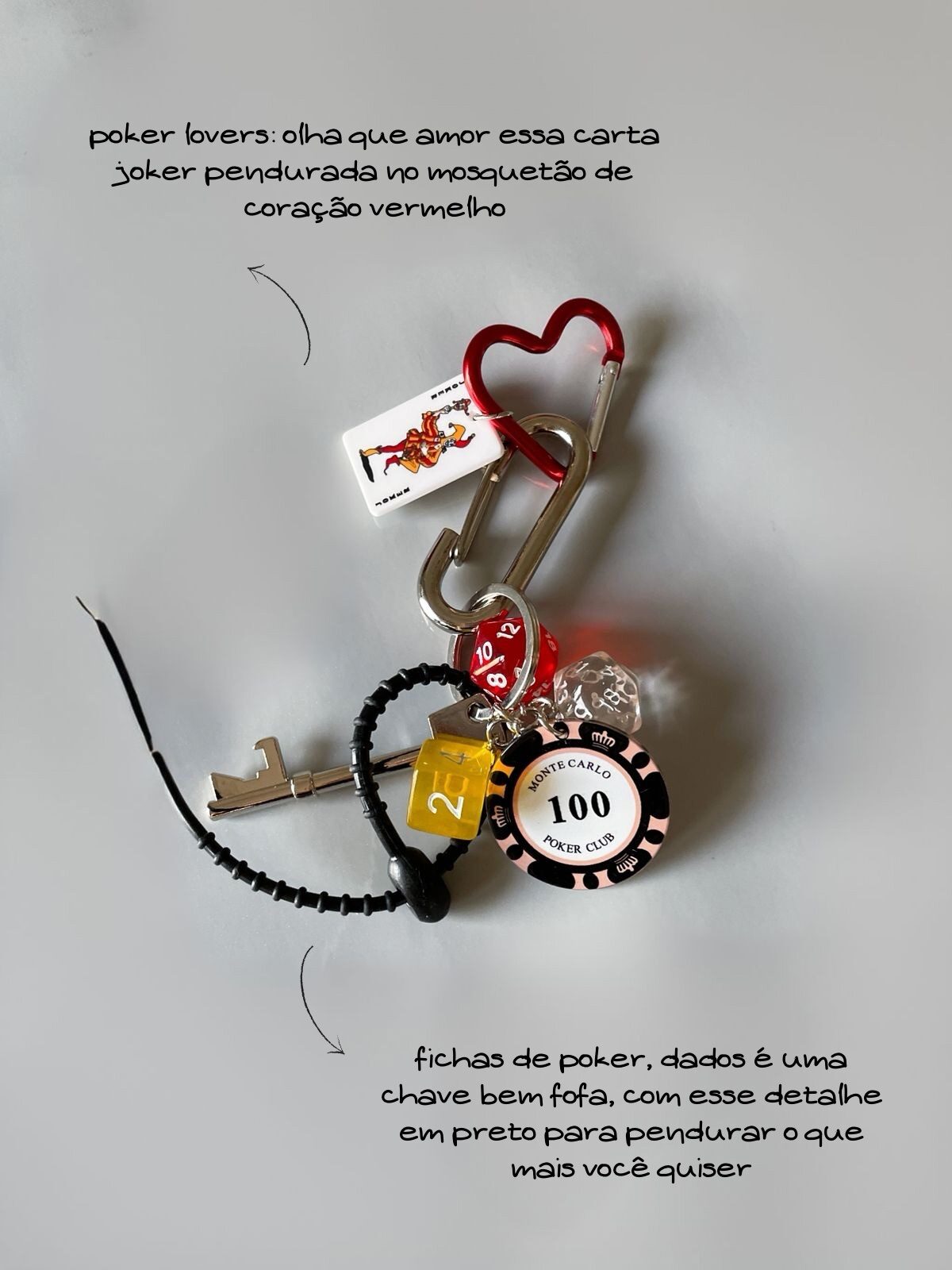 Já diria a Lady Gaga: pa-pa-poker charm! Esse chaveiro é cheio de atitude e vem para ser o detalhe que faz toda diferença no seu look. Dois mosquetões estilosos, um em formato de coração vermelho e outro em prata, dão a base perfeita para os elementos icônicos: a cartinha Joker super divertida, a ficha de poker Monte Carlo que traz a energia exclusiva dos cassinos, os dados coloridos que remetem à sorte e uma chave delicada que completa o mix de forma inesperada. O cordão preto finaliza tudo com contraste e versatilidade, permitindo pendurar onde quiser — bolsa, calça, mochila ou chaveiro. Um acessório versátil, colecionável e feito para despertar olhares curiosos com aquele inevitável “onde você comprou?”.