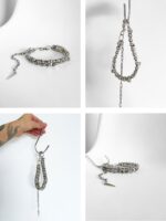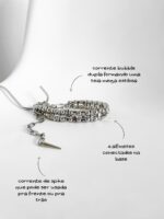 Uau! Olha que tudo esse modelo que pode ser usado como colar ou choker, todinho de corrente bubble dupla e 3 grandes alfinetes por todo o colar. Ele tem vários detalhes que amamos: além de tudo que já mostramos, ele ainda tem o fecho mosquetão que pode ser usado pra frente ou pra trás e a corrente com spike na ponta também. E ah, as argolas piercing dão um super charme pra peça. Enjoy!
