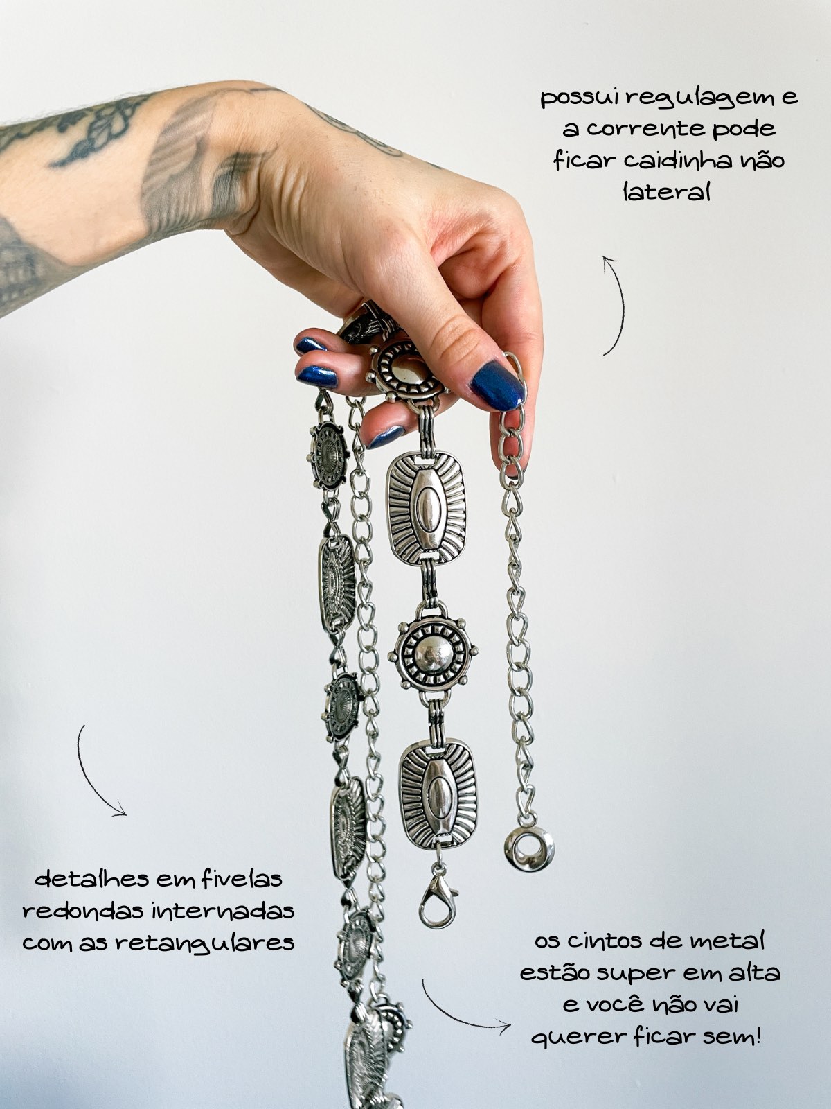 Os cintos de medalha no mood Boho estão super em alta e você não vai querer ficar sem. Esse modelo conta com medalhas em forma de fivelas redondas e retangulares, cheias de detalhes desenhadinhos e intercaladas de uma forma mega estilosa. Ainda tem uma corrente pendurada que dá mais charme ao look e serve também como regulagem. Fica perfeito para ajustar um look ou marcar a cintura em um vestido, além de deixar seu look ainda mais ousado se você misturar ele com outros modelos de cintos. Maravilhoso, né?