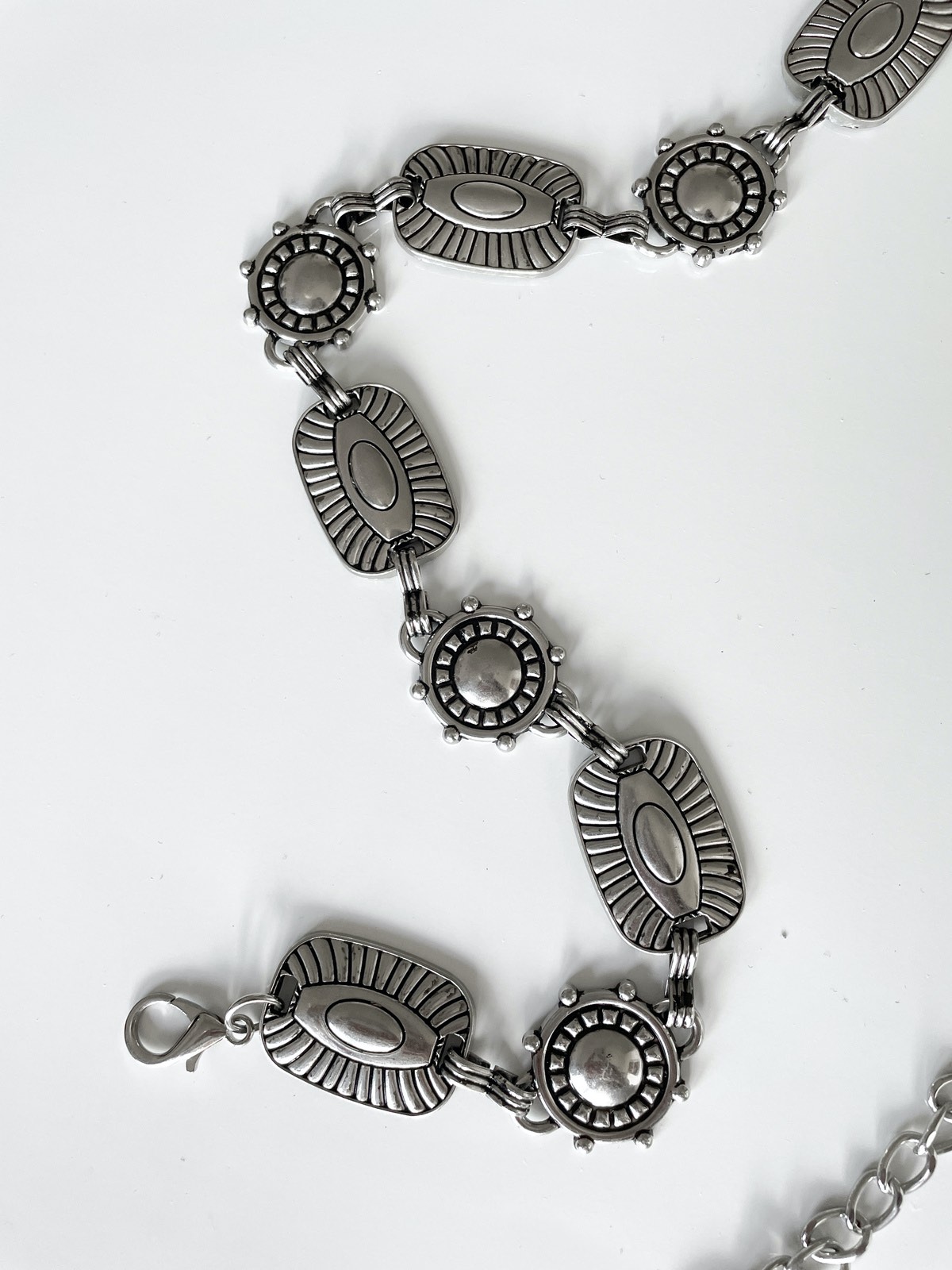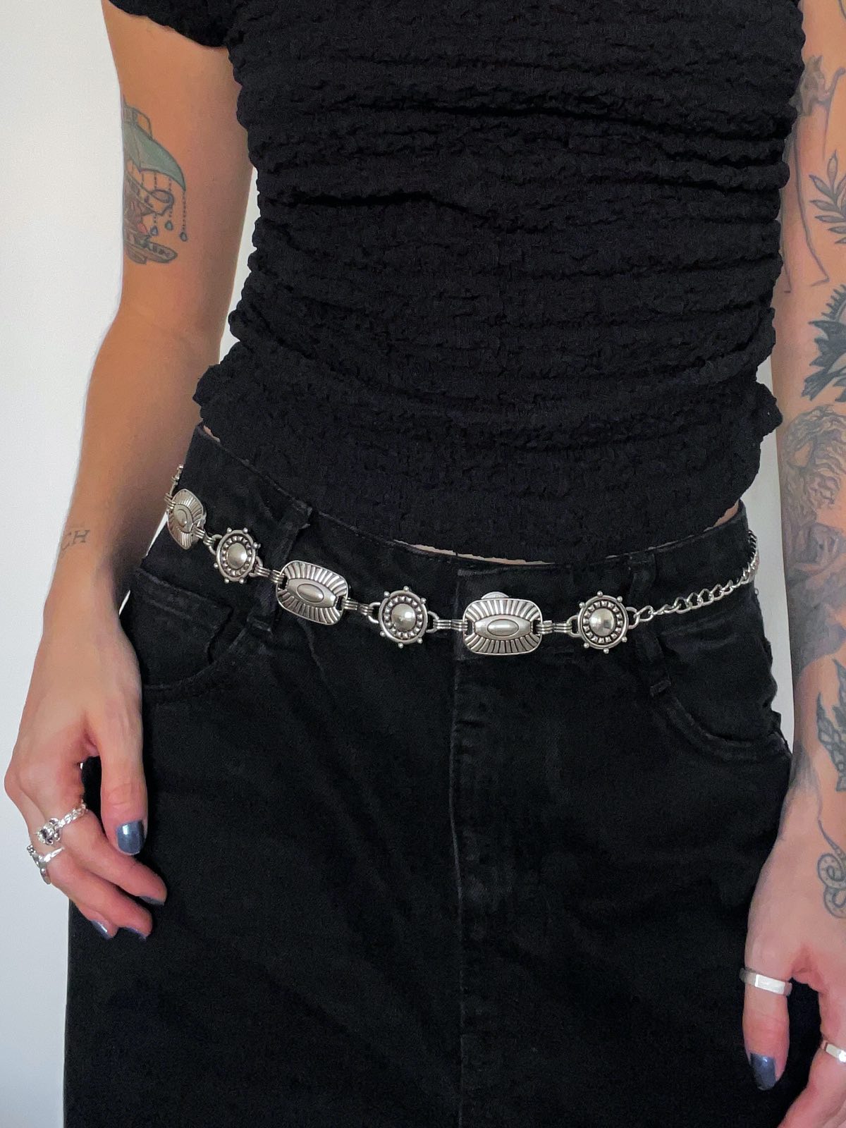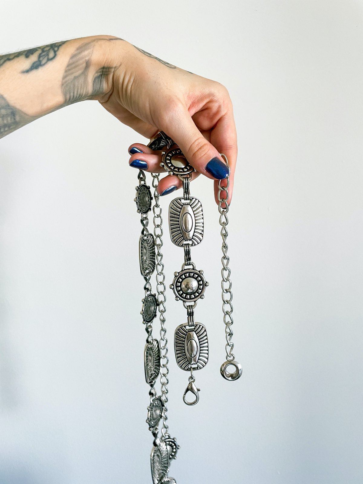 Cinto Boho, de metal super estiloso, feito com medalhas prata envelhecida