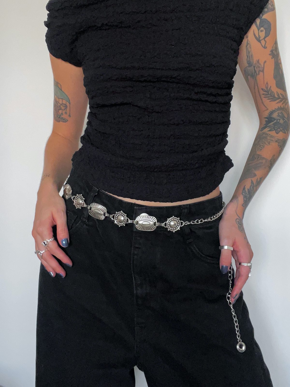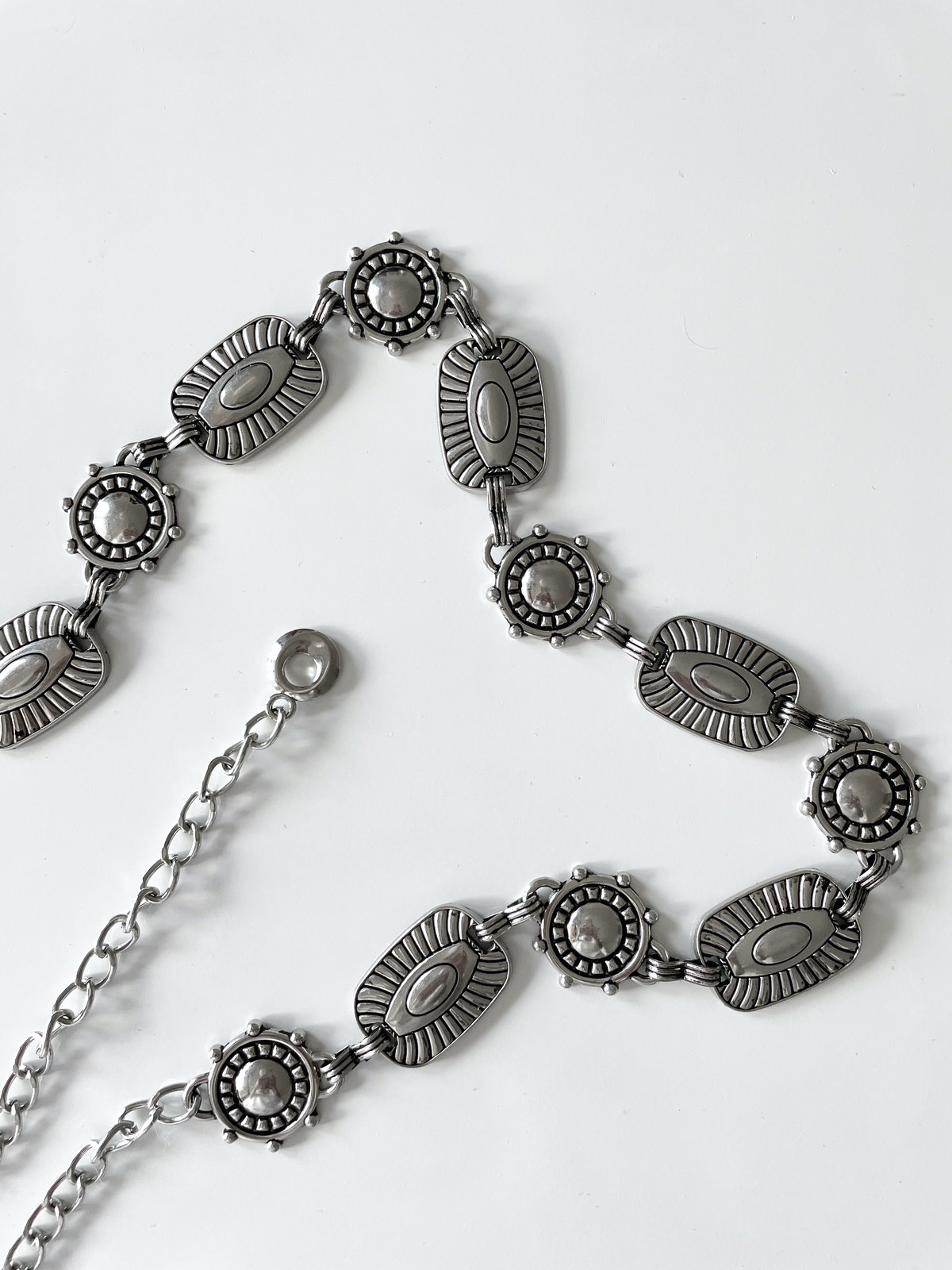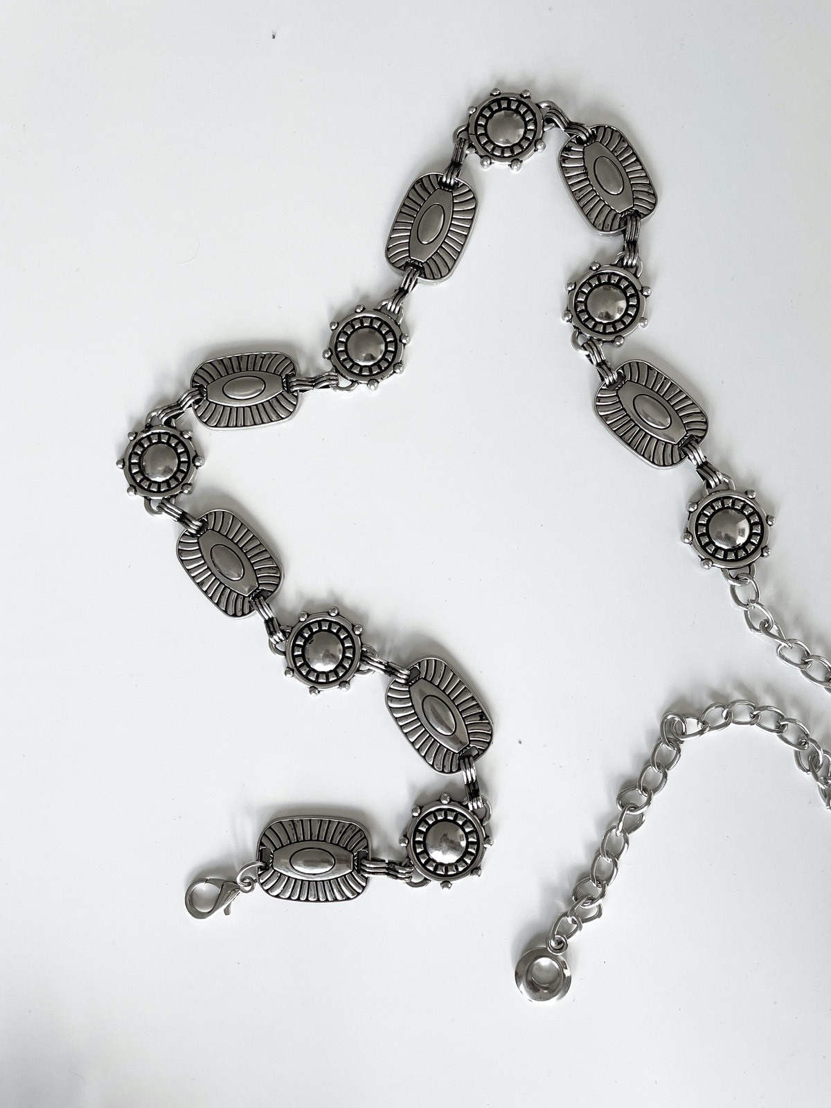 Cinto Boho, de metal super estiloso, feito com medalhas prata envelhecida