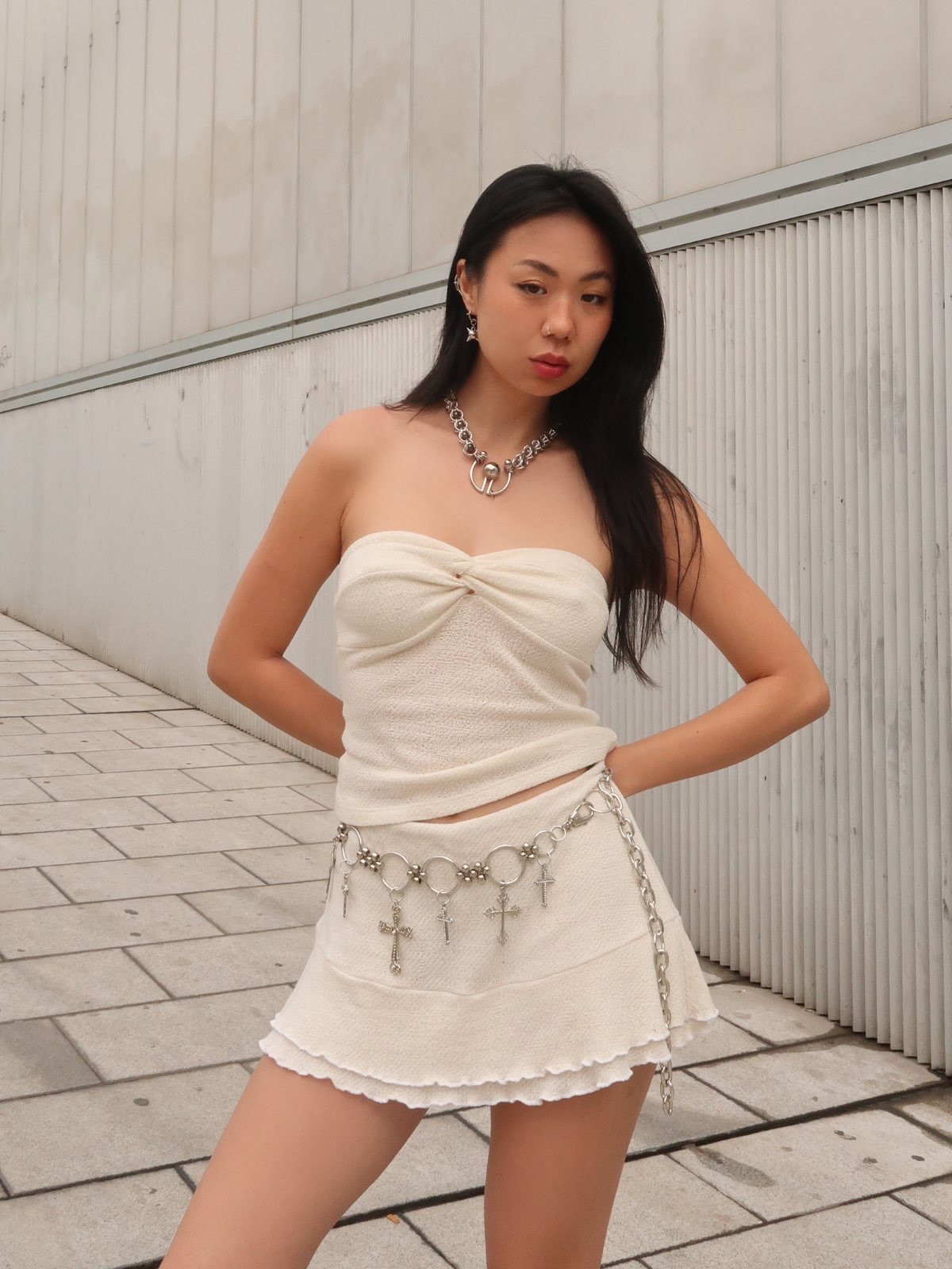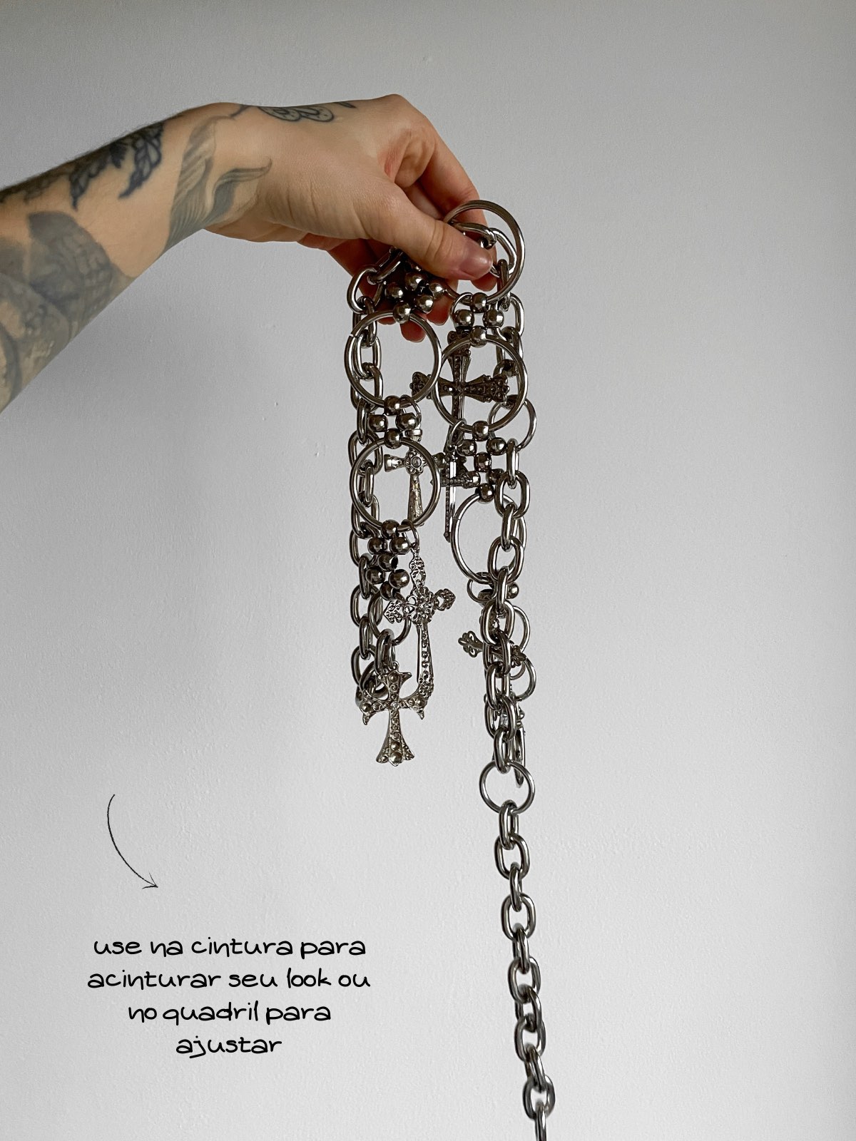 Aquele clássico que combina com todos os looks. As cruzes são super atemporais e trouxemos esse cinto perfeito para as suas melhores produções. Um cinto de corrente babadeiro que conta com diferentes pingentes de cruz de diversos tamanhos, conectados por argolas e mini tramas em macramê de bolinhas de metal. Ainda tem a corrente da regulagem que você pode usar caída que fica um charme.