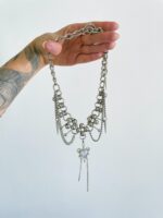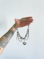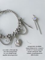 Versatilidade em forma de colar do jeitinho que nós amamos. Aquele modelo com várias formas de uso que a nossa designer faz como ninguém. Com diferentes elementos e uma trama em macramê artesanal, ele conta com diferentes elos de correntes na base e nas franjas, piercings, spikes nas extremidades trazendo mais estilo à peça, mais de 30 argolas e mini argolas dispostas de formas diferentes e incríveis compondo a estrutura e ainda carrega a opção de 2 pingentes de coração: um bem grande e alternativo e outro mais delicado no mood lisérgico derretido e holográfico para você trocar quando quiser já que ambos são removíveis e o colar ainda pode ser usado sem pingente nenhum que também fica lindo. Feito artesanalmente com horas de produção, perfeito para os seus melhores looks.