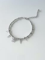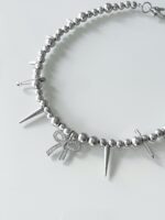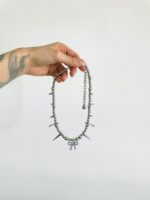 Colar Cute But Psycho, feito bolinhas prata, spikes, alfinetes e pingente de laço com strass