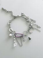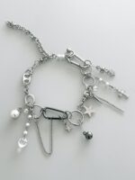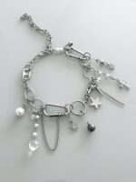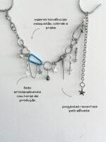 Colar Gallaxy, feito com mix de pingentes e correntes. Pérolas, estrela de strass, cristais, piercings e muito mais