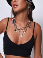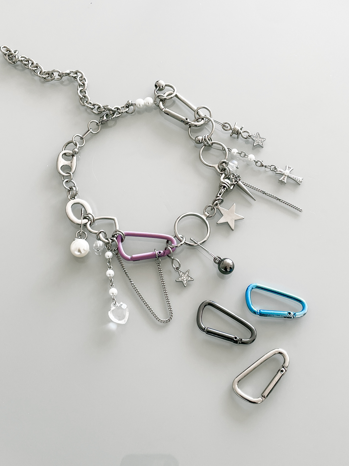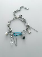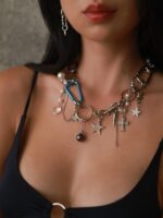 Para tudo! Olha esse baaaapho de colar. Uma combinação incrível dos pingentes mais cool ever: o detalhe em azul do mosquetão está suuuper em alta e essa é uma das maiores trends do momento. Além do azul, tem também o mosquetão prata, argolas piercing, estrelas brilhantes, arame farpado, cruz com pérolas, pérolas maiores e menores, corações, lacres grandes, cristais em forma de coração, correntinhas penduradas, spikes, bolas ônix e furta cor, estrelas grandes e alfinetes removíveis que você pode plugar em qualquer parte do colar ou usar sem. Ele foi feito artesanalmente com horas de trabalho e pensado para ser o seu novo colar favorito que deixei seus looks ainda mais estilosos. Além de tudo, ele tem uma corrente no fecho com estrela pendurada que pode ser usada pra frente ou pra trás. Enjoy!
