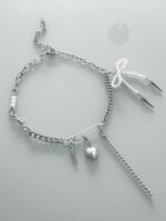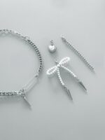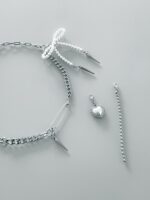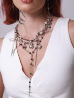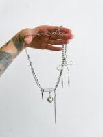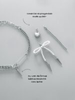Olha que tudo esse colar que tem a mistura da delicadeza das pérolas com a vibe alternativa das correntes de metal. Nessa versão, ele traz 3 pérolas laterais, um arame farpado, elos diversos de correntes, um spike fixo pendurado, um alfinete que leva o coração em pérola removível e ao lado, uma mini corrente bubble removível e um pingente de pérolas em forma de laço com spikes nas pontas que está super em alta – também removível. Nós amamos trazer versatilidade às nossas peças e você também vai amar.