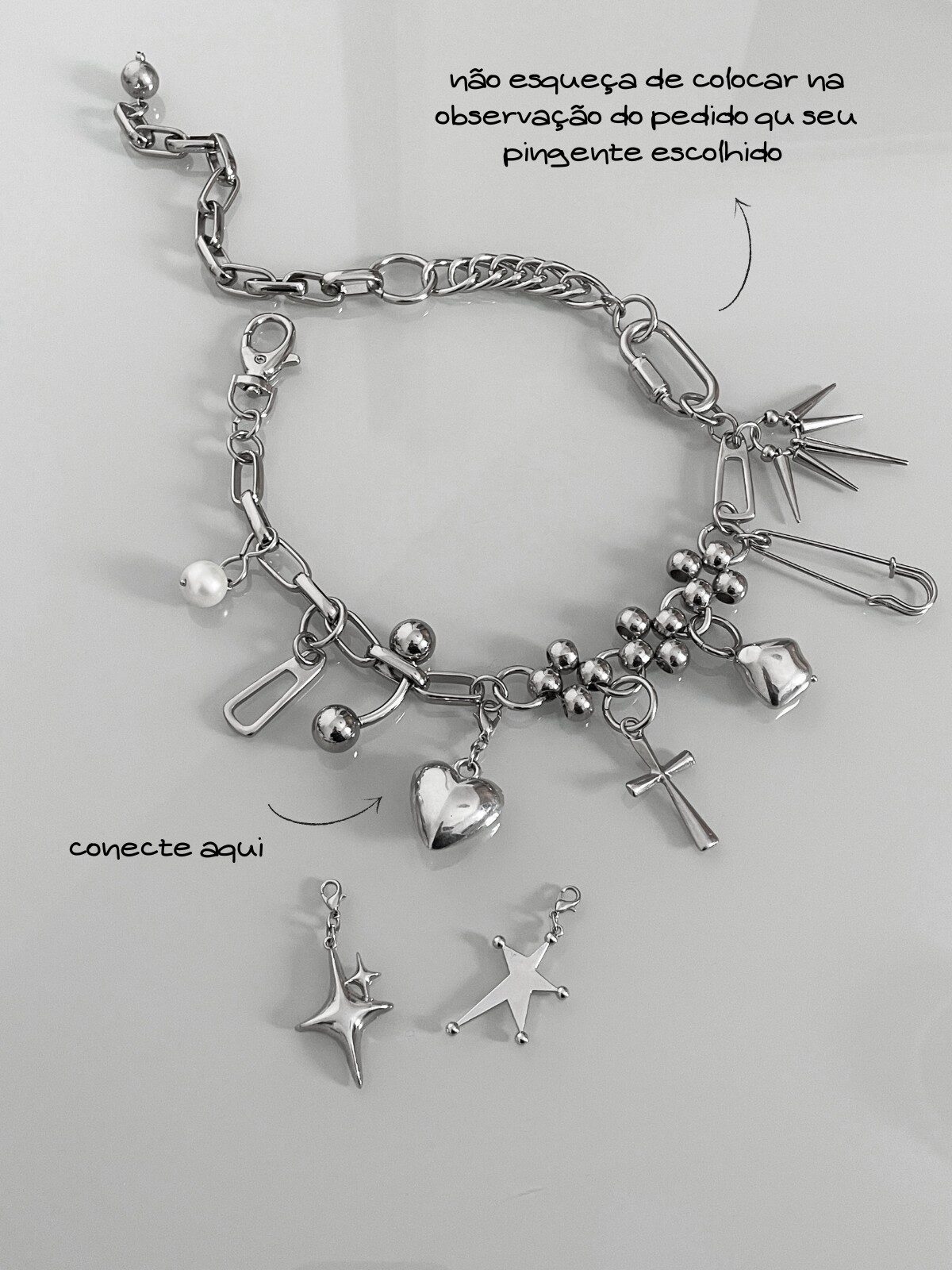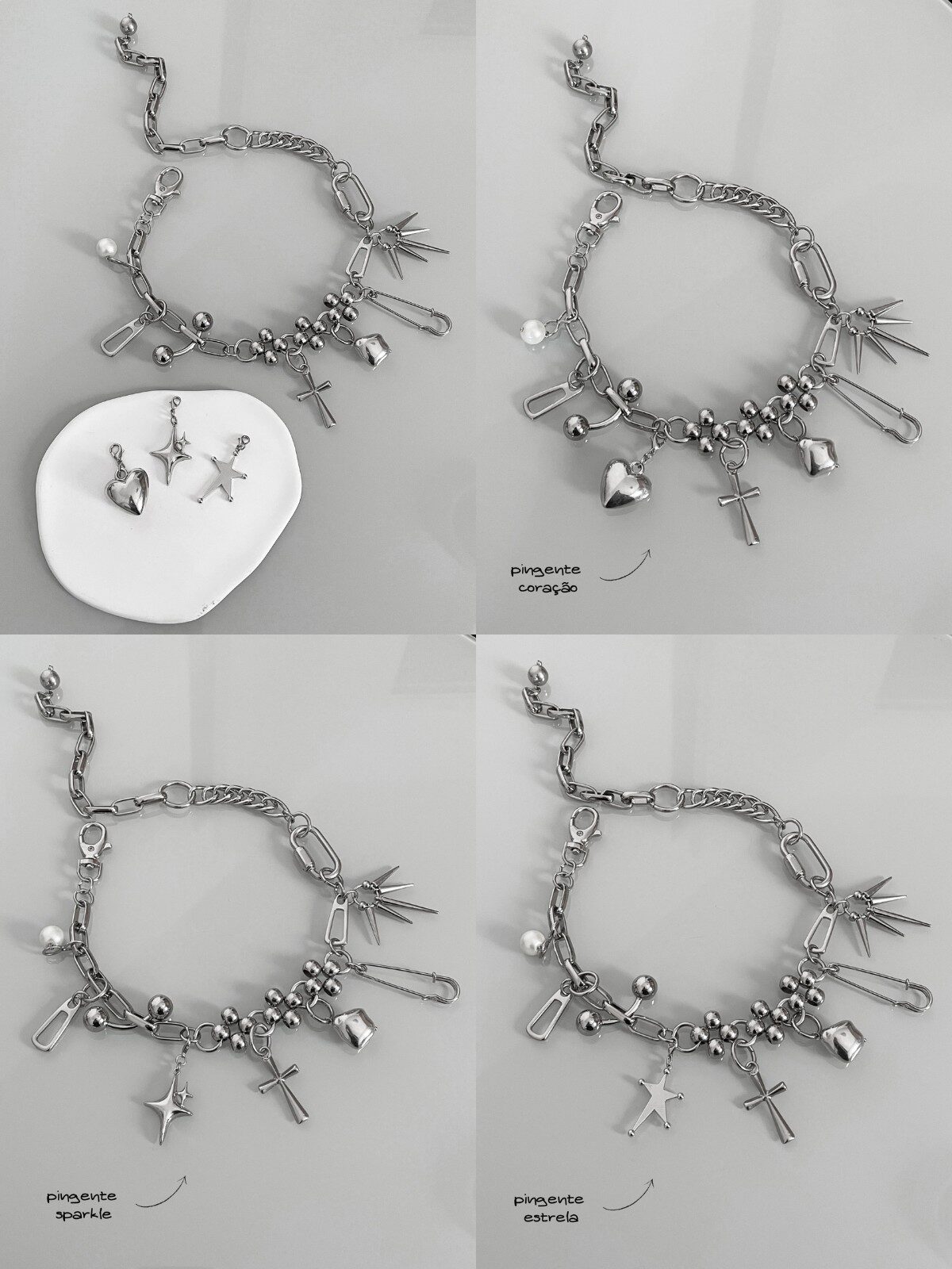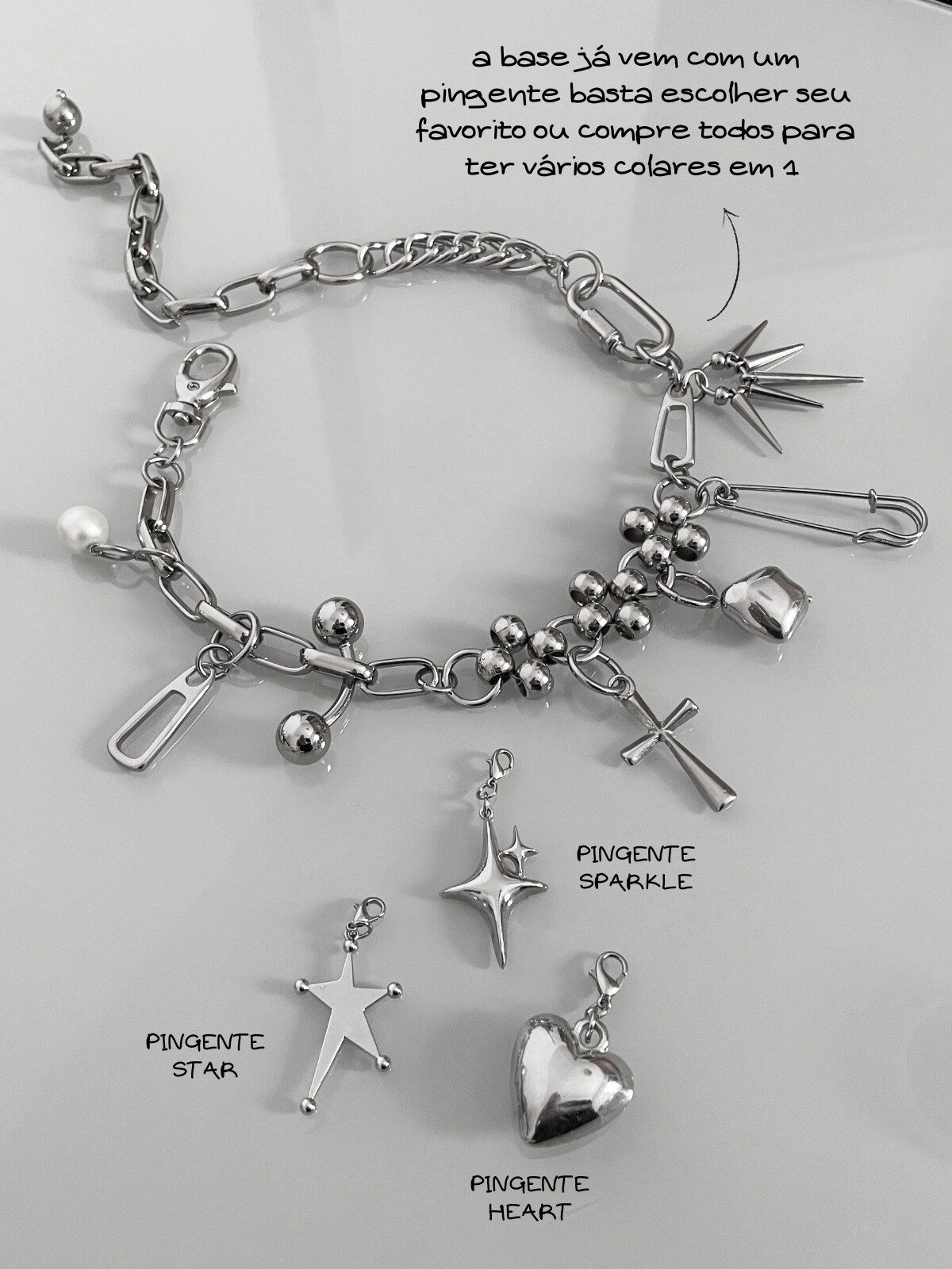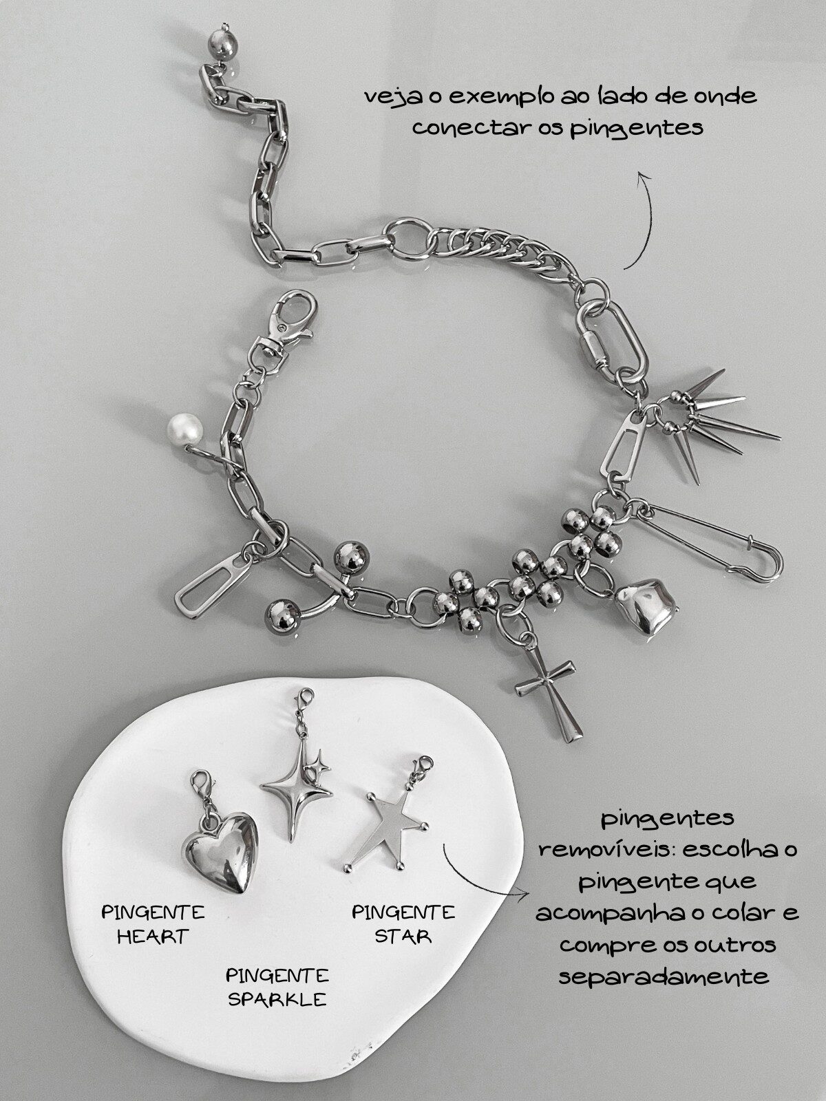 E o melhor: o colar já acompanha um pingente removível à sua escolha – coração bold, sparkle ou estrela assimétrica. Caso queira, você também pode comprar os outros pingentes para customizar do seu jeito. Use um, dois ou todos juntos e crie combinações únicas!