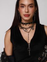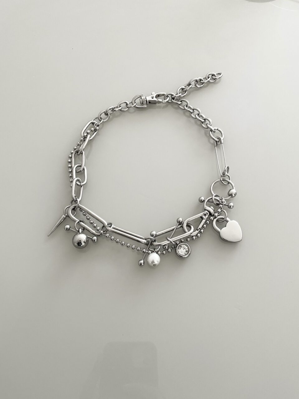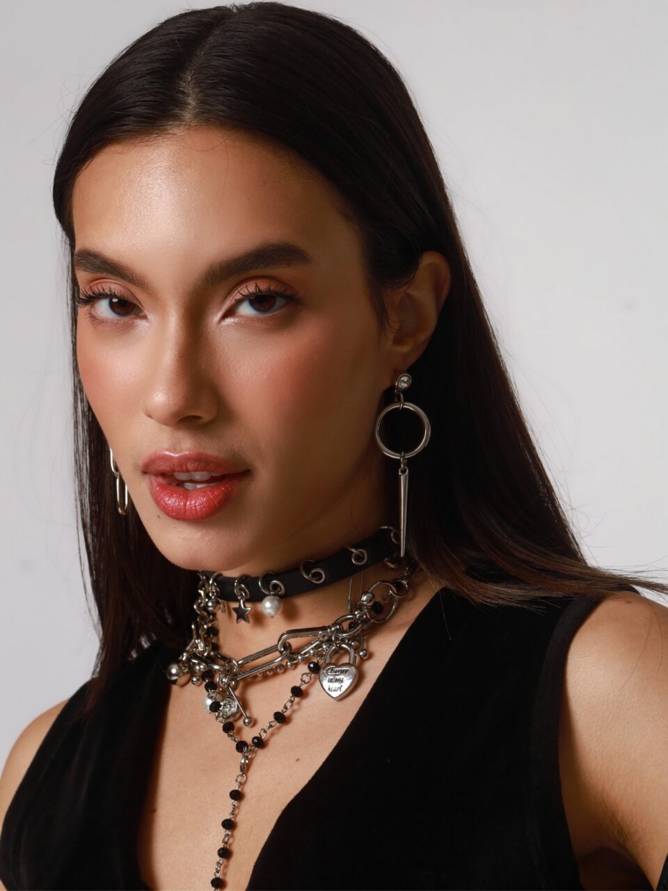 Colar Kira, feito com mix de correntes, pingentes de spike, pérolas, pontos de luz, alfinetes, corrente bubble e piercings