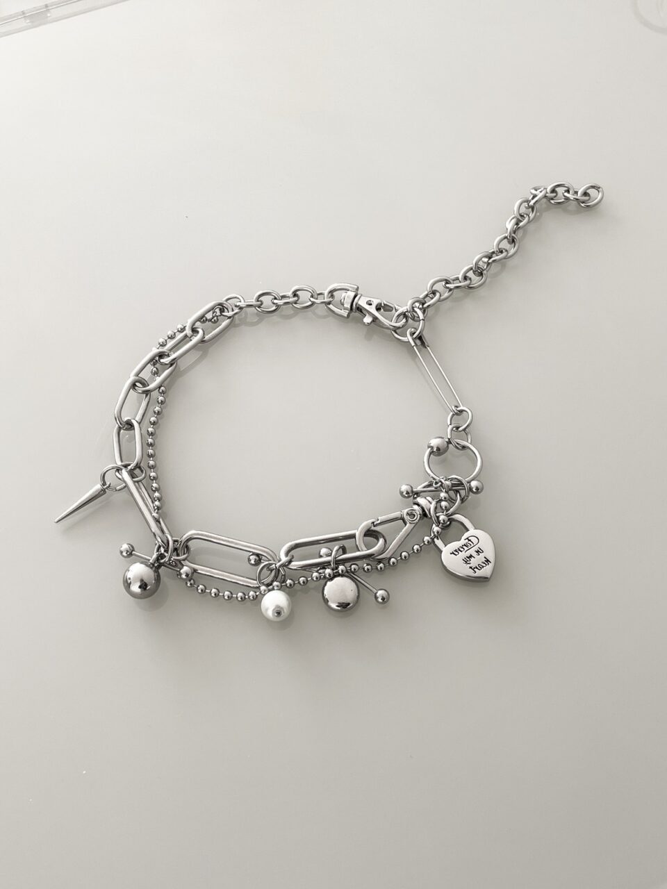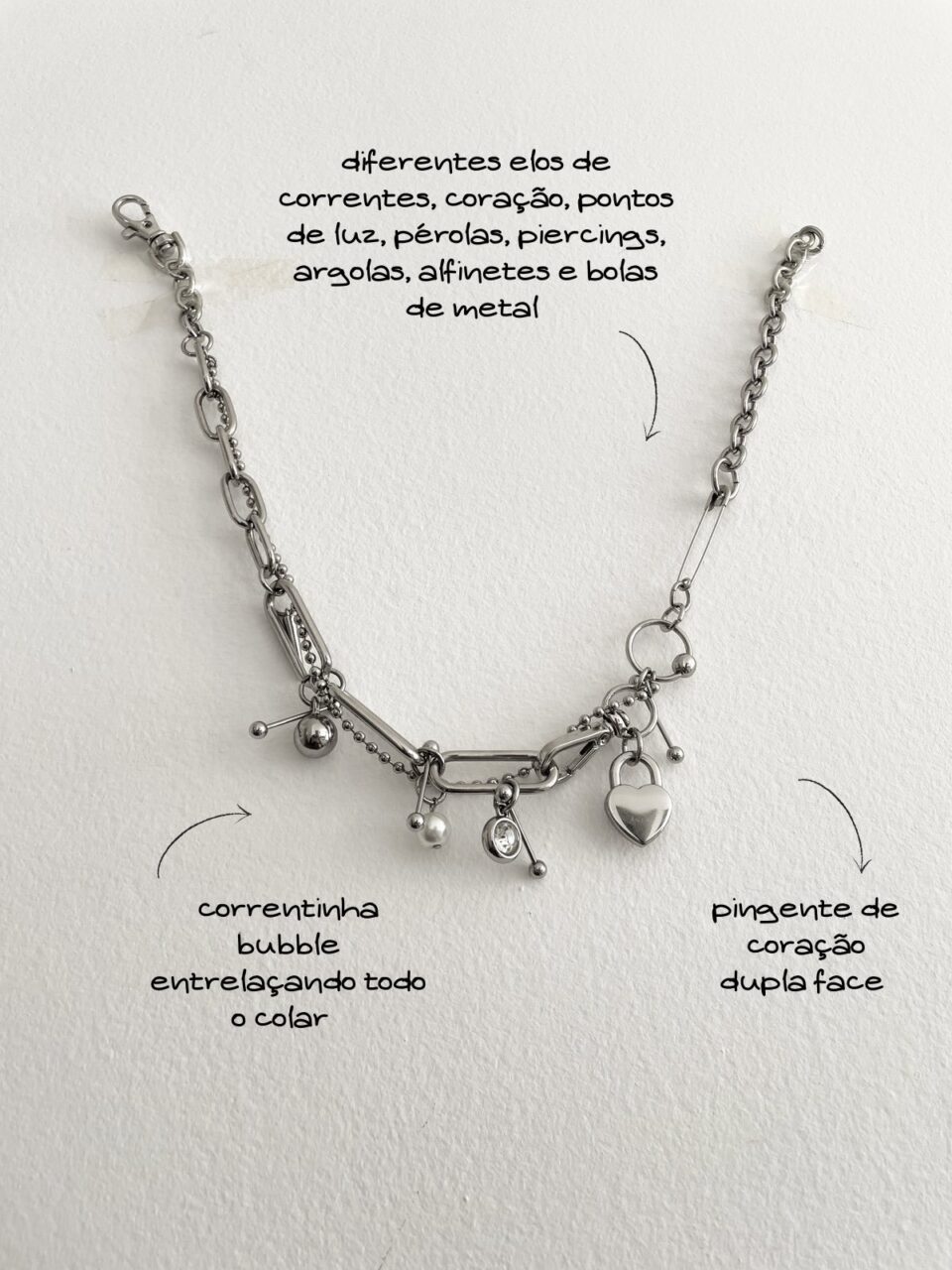 Oh my heart! Seu novo colar favorito chegou e nós vamos te provar: são 3 tipos diferentes de elos de correntes alternados dando a assimetria que amamos para o colar, uma mini corrente bubble entrelaçando todo o colar que fica penduradinha, tornando uma “fita dupla” incrível, pingentes e argolas piercing que são uma aposta de trend muito forte, pingentes de pérolas, spikes, bolas de metal, pontos de luz em strass e um coração babadeiro que fica na lateral do colar, deixando a peça supercool e fora do convencional. Ainda temos um fecho mosquetão para abrir e fechar, e um fecho na parte da lateral que liga as partes do colar e ainda carrega o pingente de coração, além de um alfinete super estiloso que colocamos ali no cantinho. E aí, já amou?