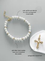 Colar Nice Pearl Gold, feito com pérolas grandes, tubos dourados e pingente de cruz removível