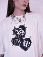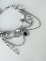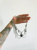 Colar Obsession, super estiloso, feito com mix de materiais: como pérolas, bolinhas prata, alfinetes, correntes e pingente de coração resinado preto