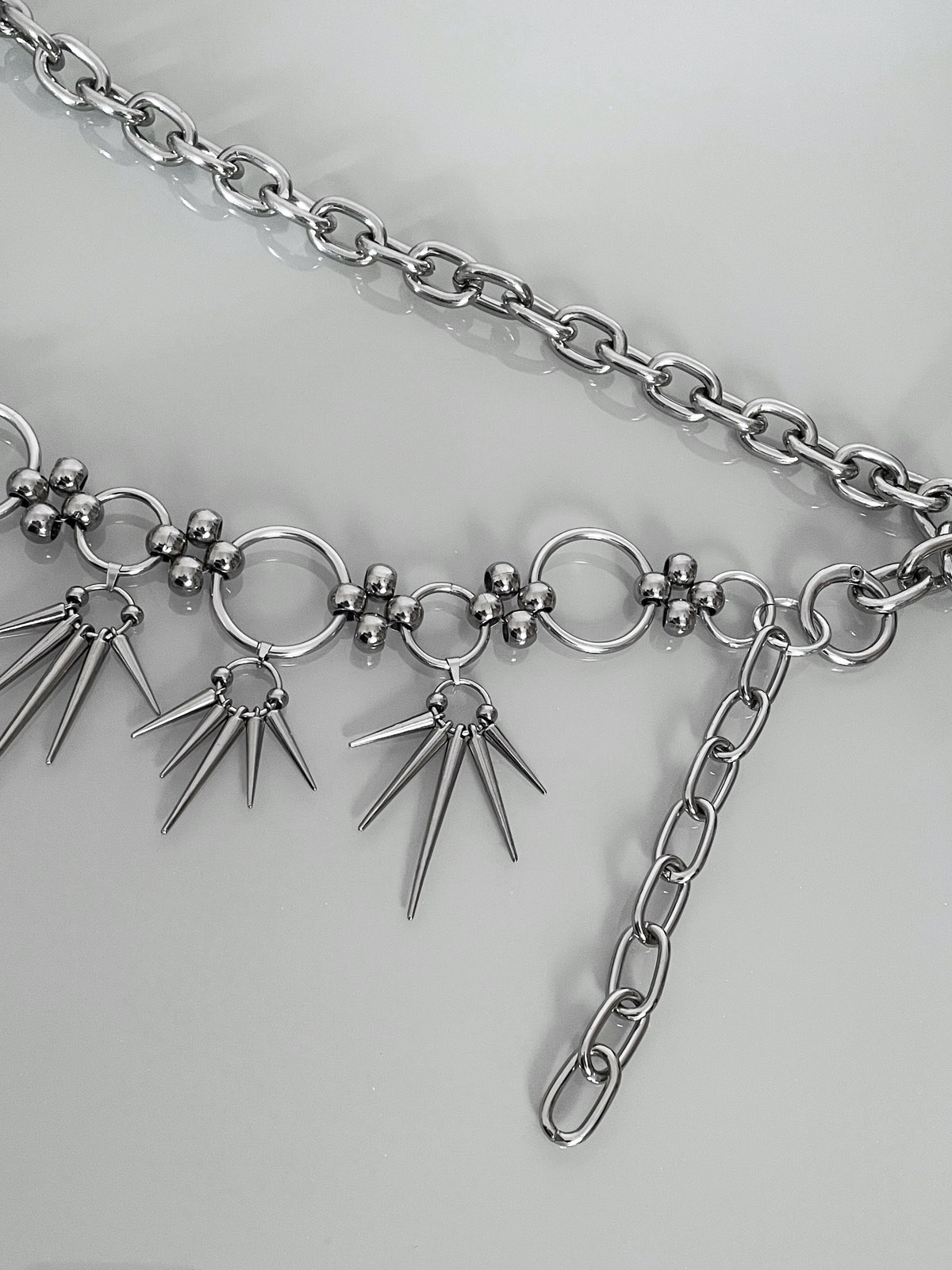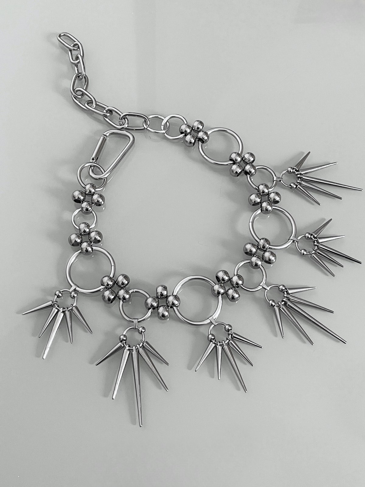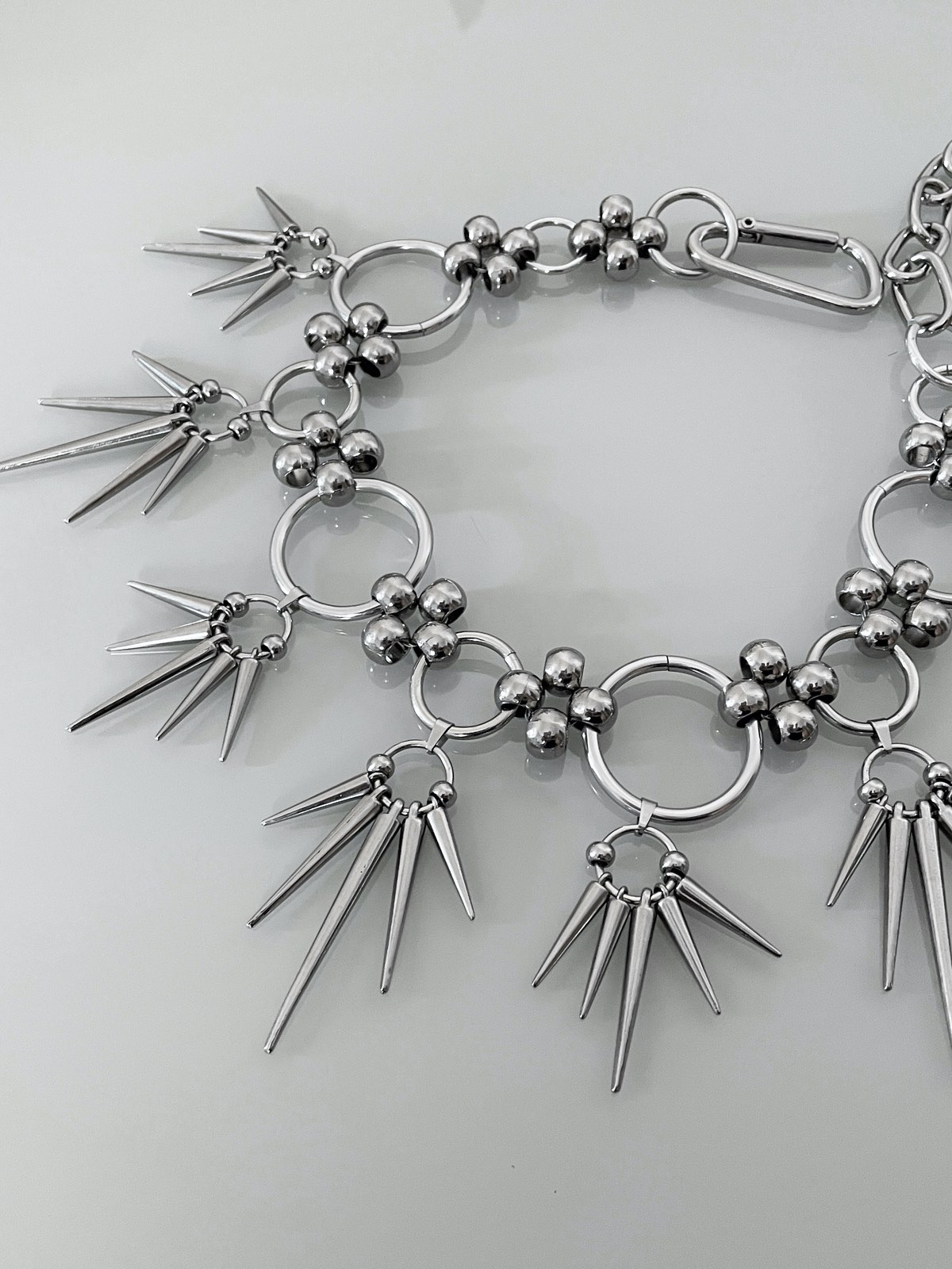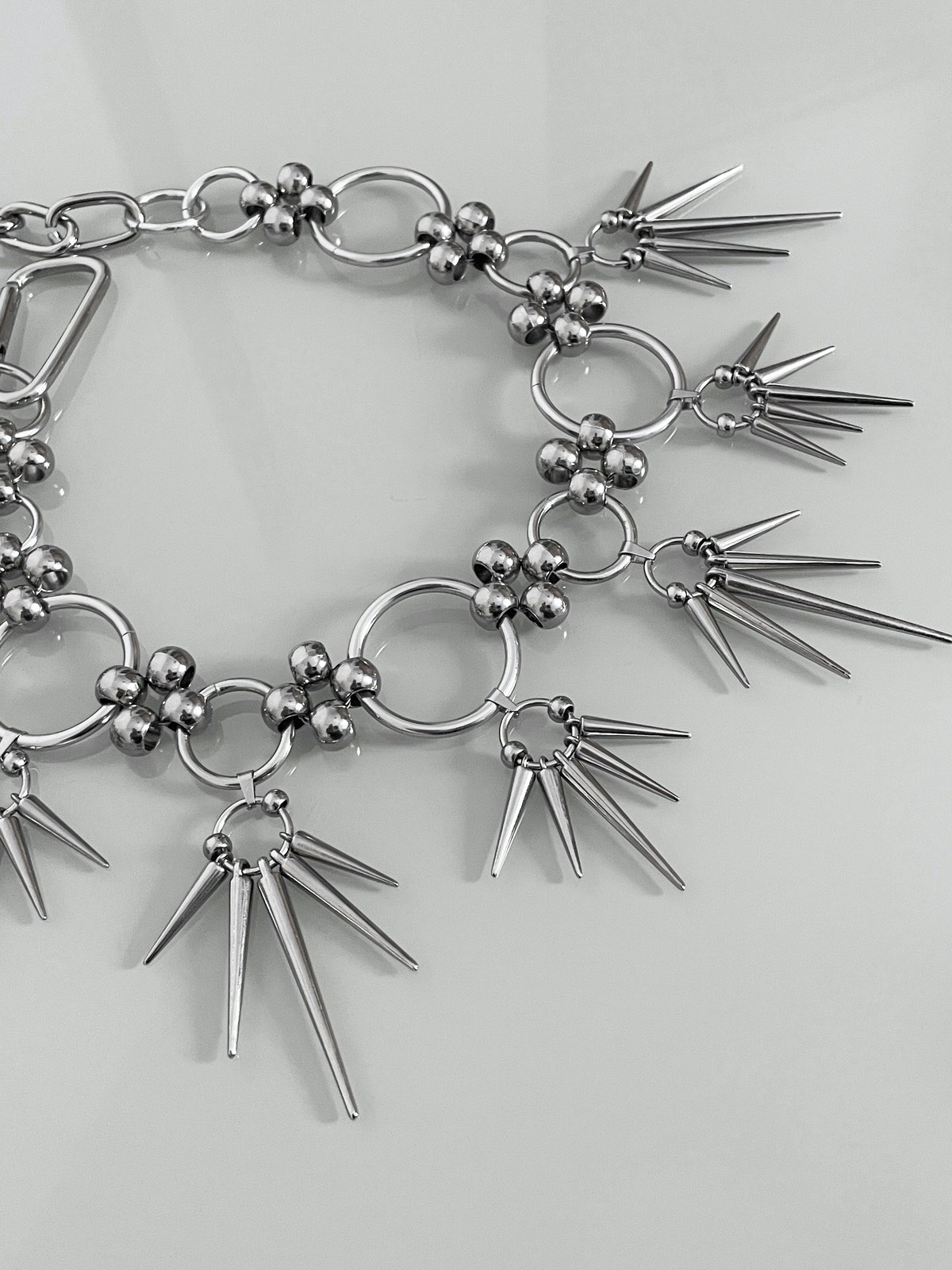 Colar Ozzy, feito com argolas, mini tramas em macramê de bolinhas de metal e spikes pendurados
