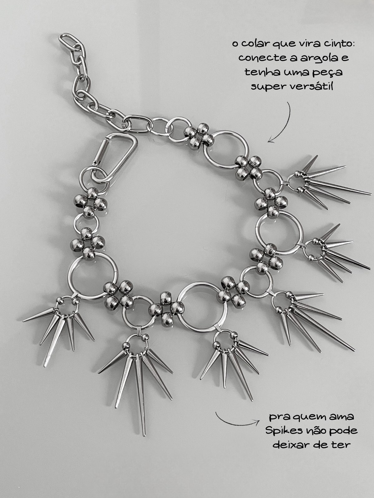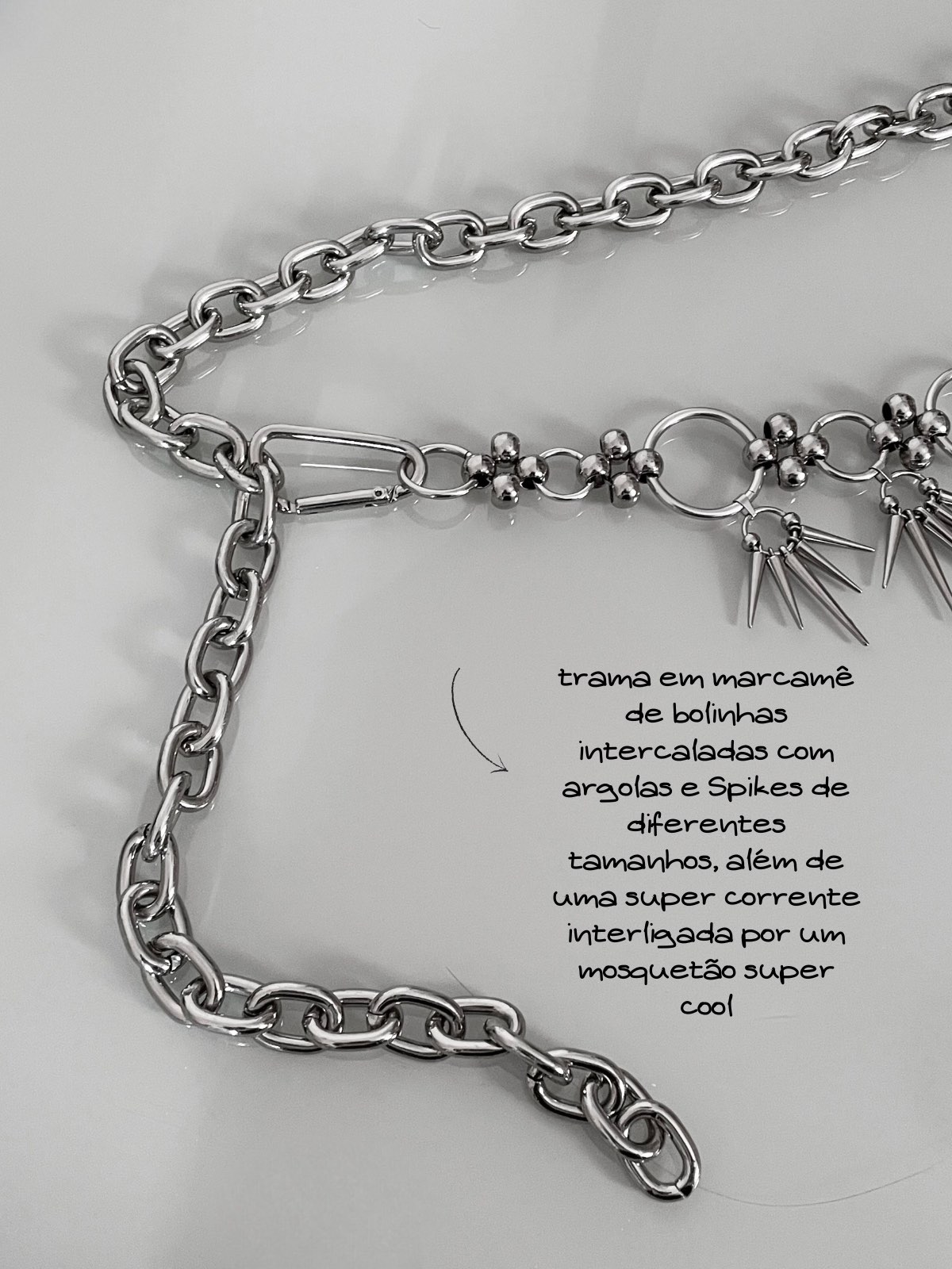 Uaaau! Olha a perfeição desse colar: cheio de argolas em tamanhos diferentes interligadas por mini tramas em macramê de bolinhas de metal, com spikes pendurados formando o desenho perfeito para o melhor caimento. O fecho em mosquetão é mega diferente e estiloso e pode ser usado pra frente ou pra trás. E o melhor de tudo é que ele vira um cinto super estiloso: basta conectar as extremidades do colar na argola das correntes. E ah, as peças são vendidas separadamente e você precisa escolher e selecionar dentro do produto se quer só o colar ou o colar com o cinto ok?!