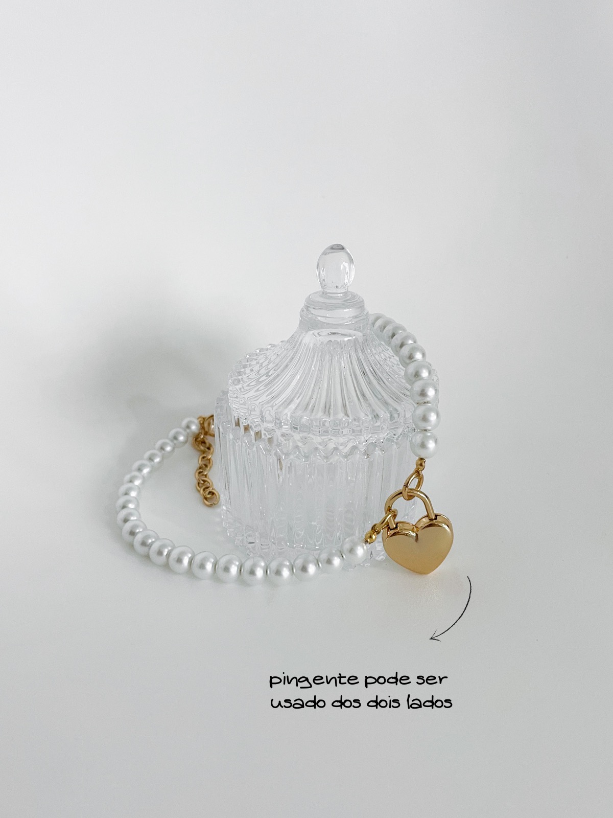 Olha que amor esse novo coração cadeado! Ele combina perfeitamente com as pérolas e ainda pode ser usado com o pingente na versão básica virando ao contrário ou na versão cadeado. Qual a sua favorita? E ah… não precisa se preocupar: a base dele é feita com fio de aço, evitando que o colar arrebente e tenha uma longa duração.