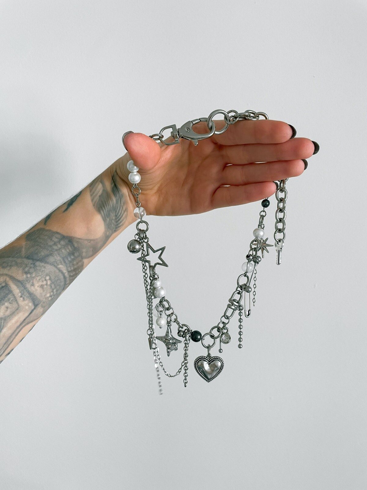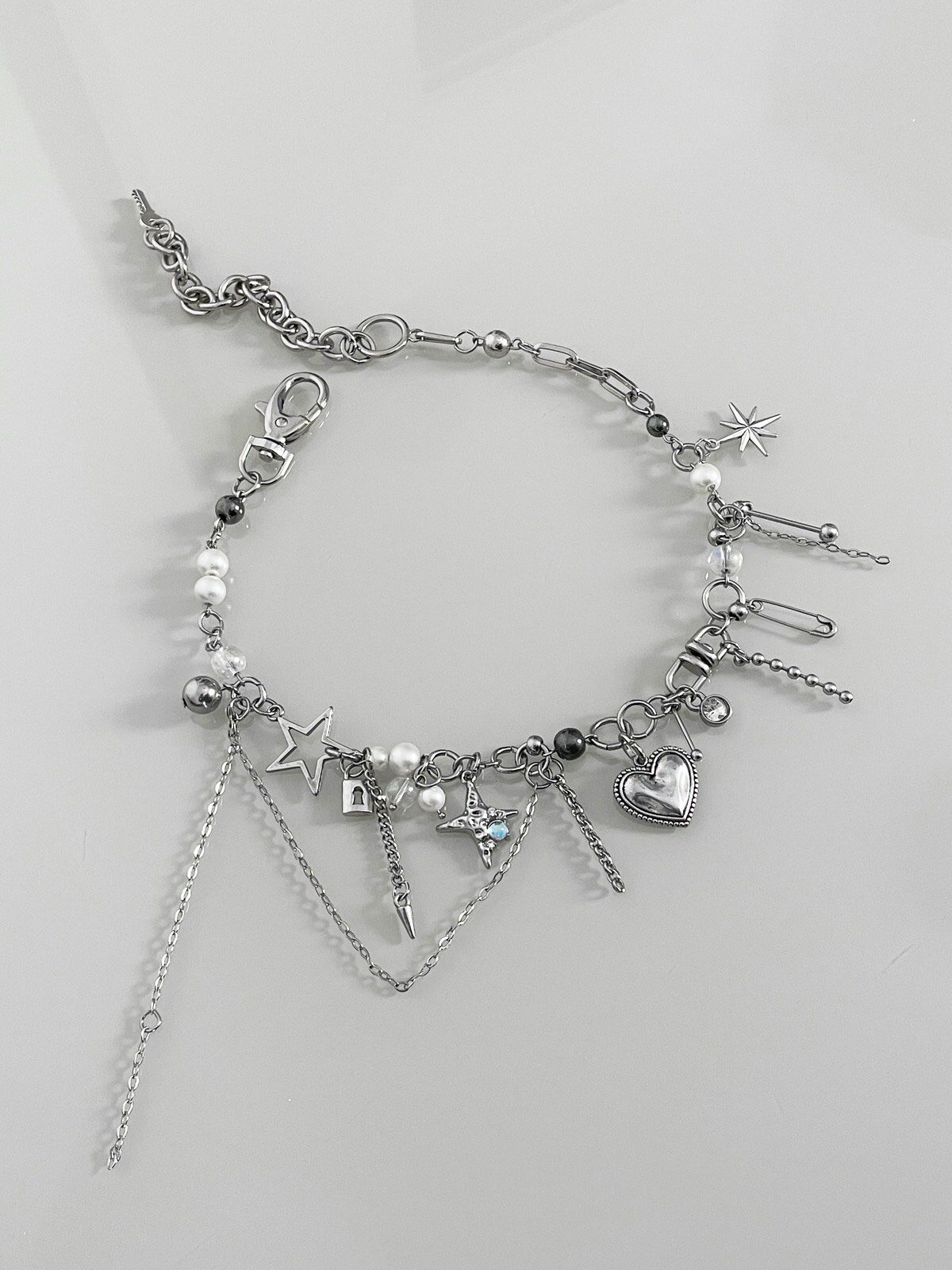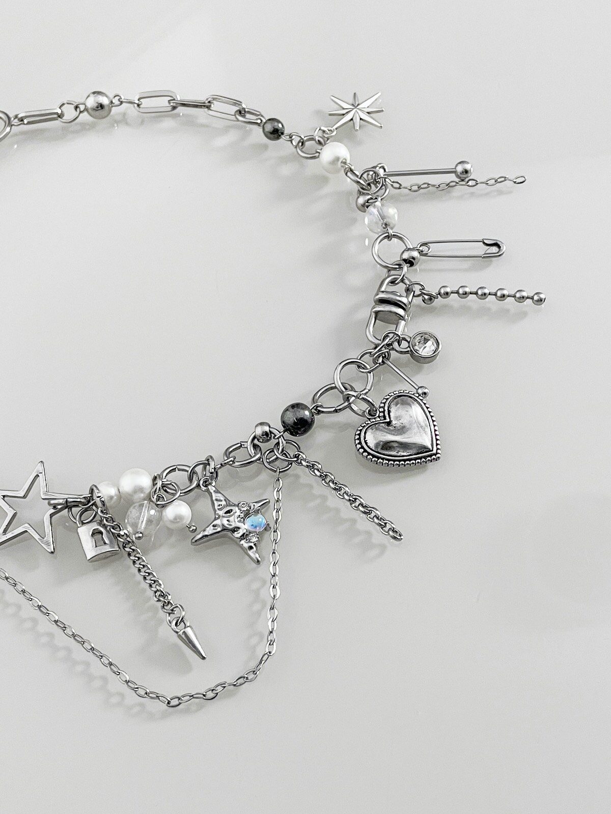 Colar Secret Love, feito vários elementos estilosos: cristais, pérolas, franjas de corrente, strass, bolinhas de metal, e pingente de coração prata