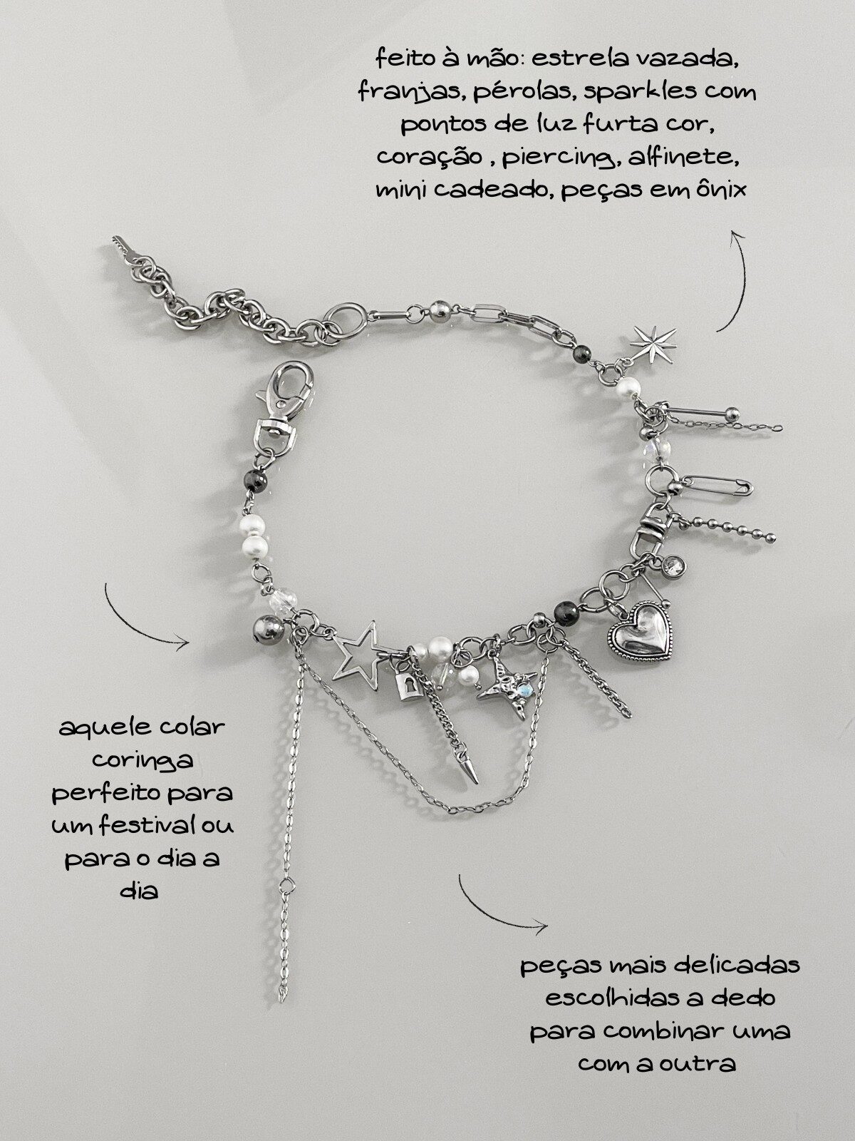 Entre os destaques: estrela vazada oversized, mini cadeado, spikes, correntinhas penduradas, pingente sparkle cravejado, coração em relevo com bordas trabalhadas, alfinetes, piercing delicado e estrela celestial cheia de atitude. Os cristais pontuais garantem o brilho inesperado.