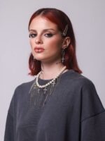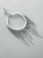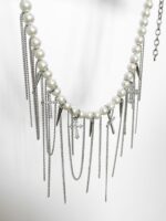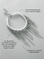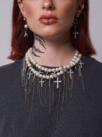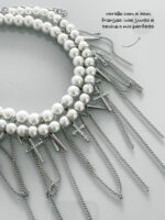 Colar Shine Cross Franjas, feito com pérolas, cruz de strass, franjas e spikes