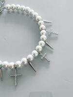 Colar Shine Cross,  feito com pérolas, spikes e cruz de strass