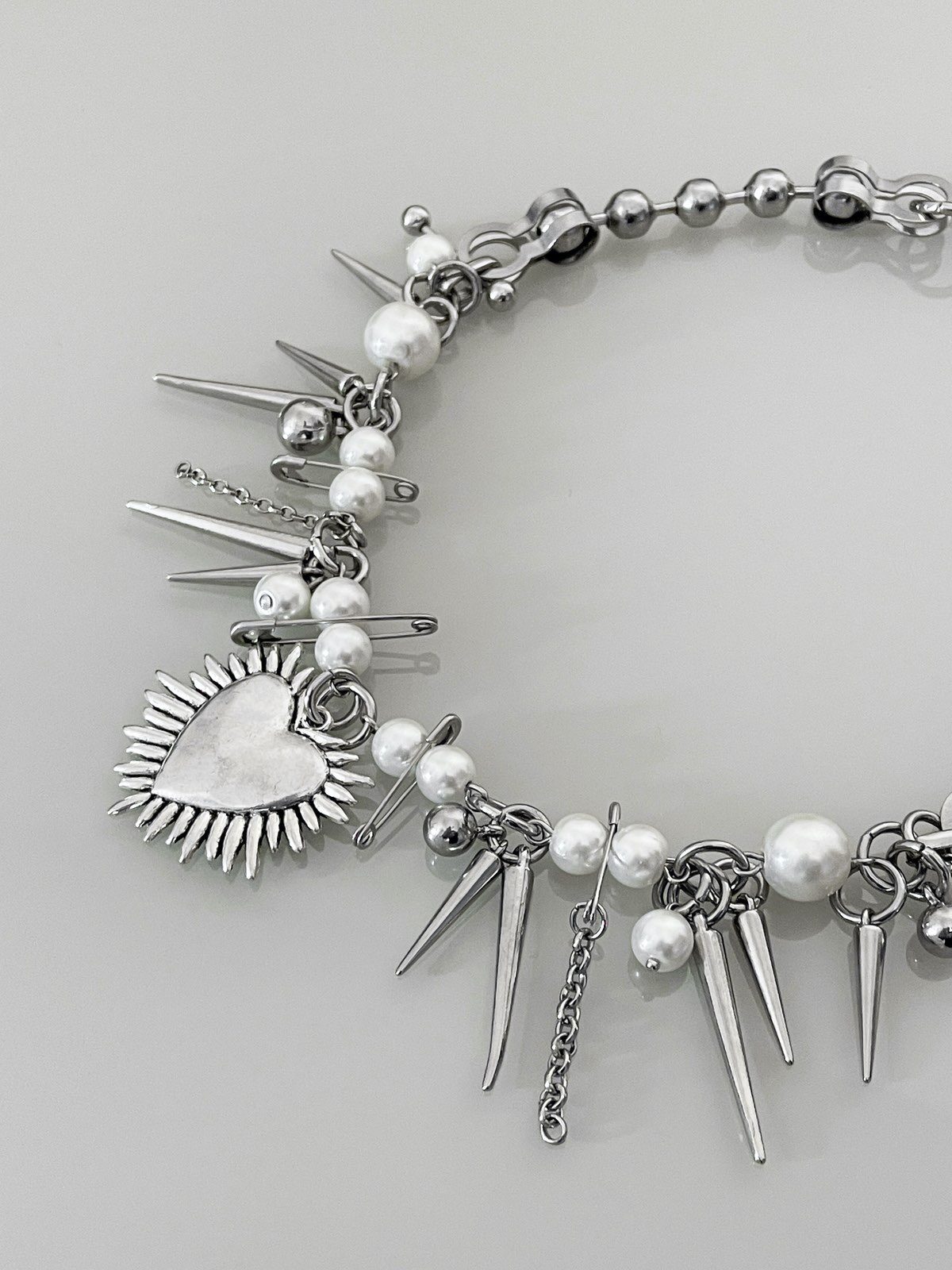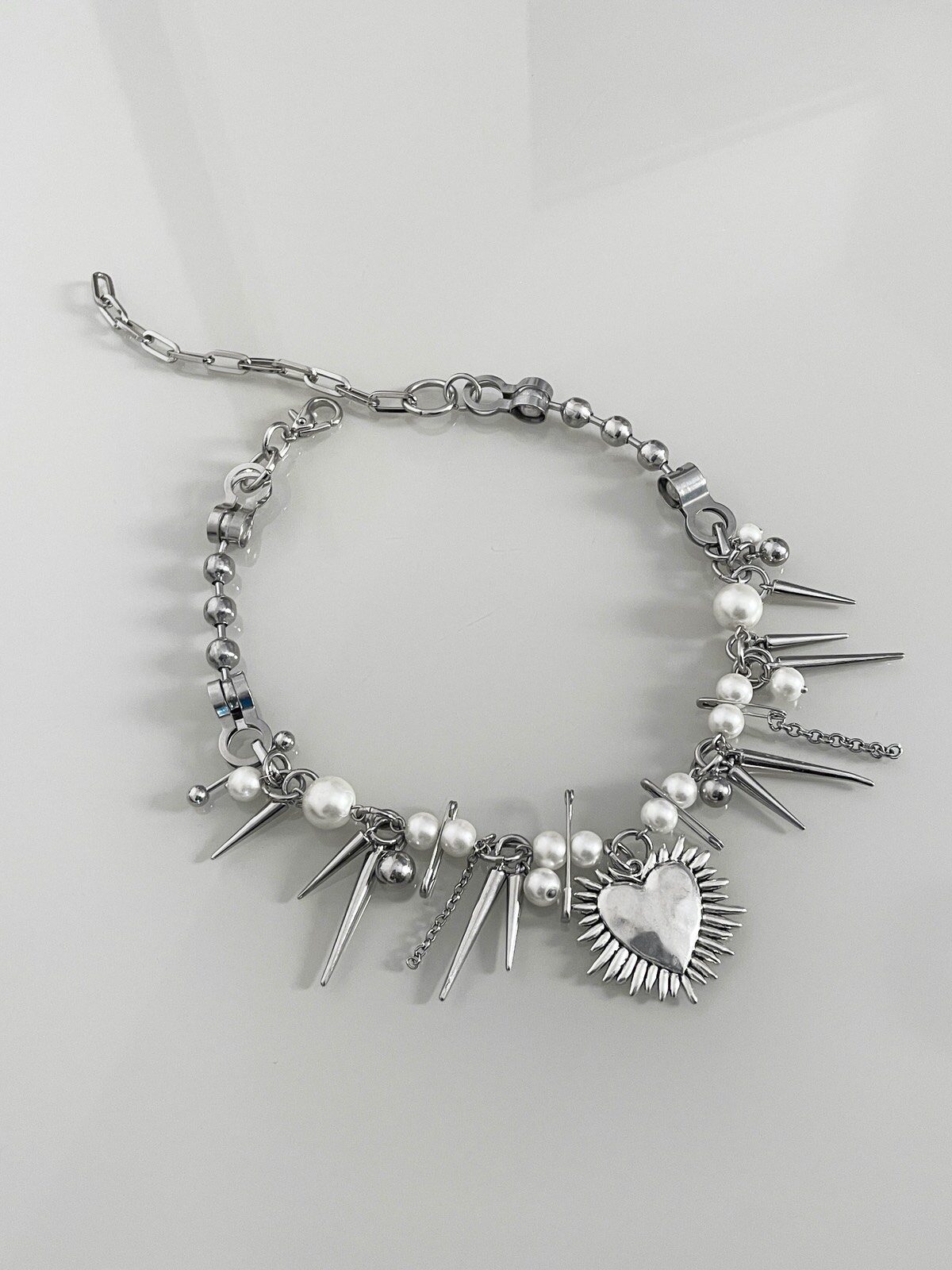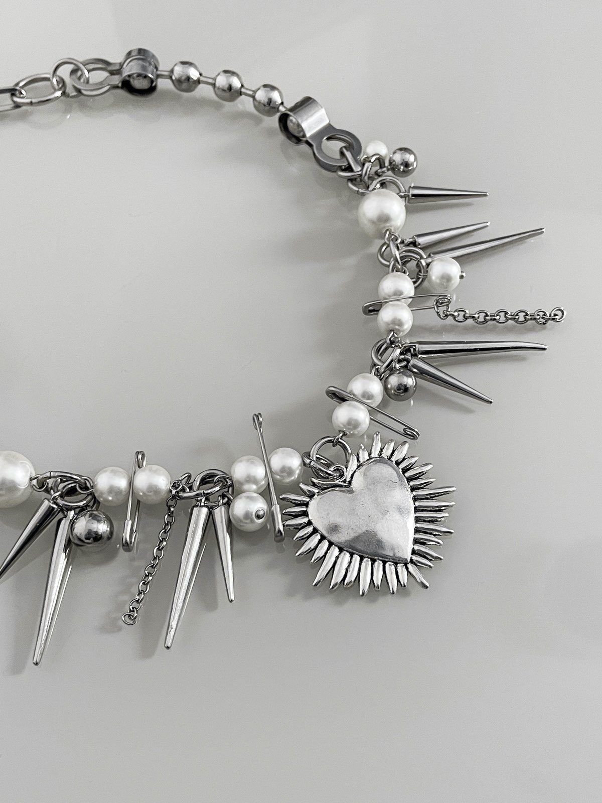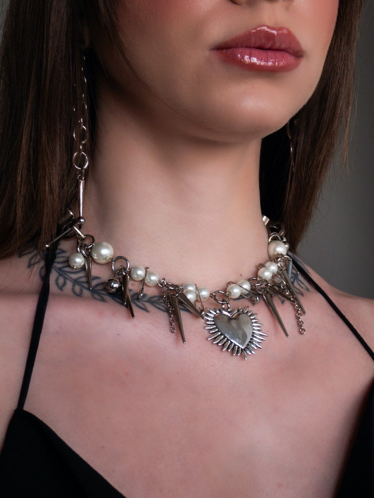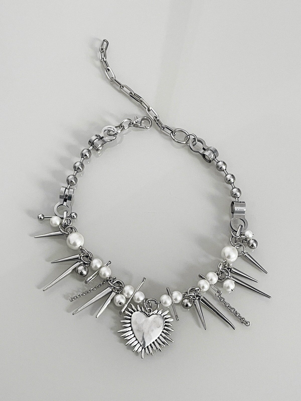 Colar Spike Heart, feito pérolas, spikes em diferentes tamanhos e pingente de coração prata