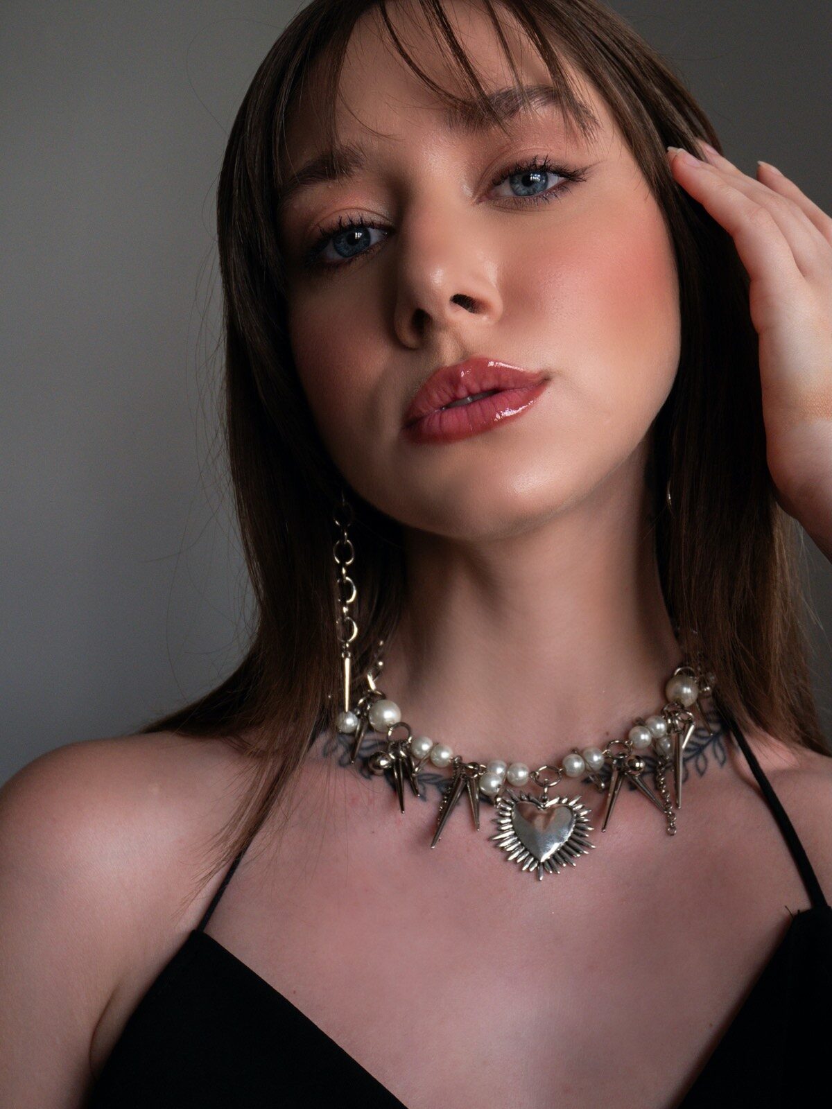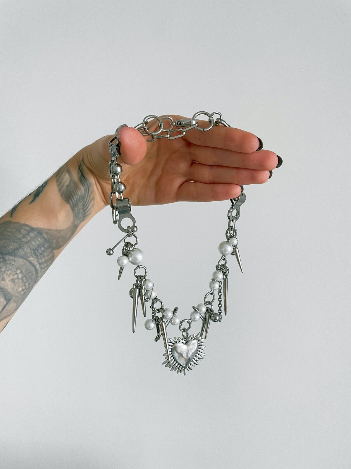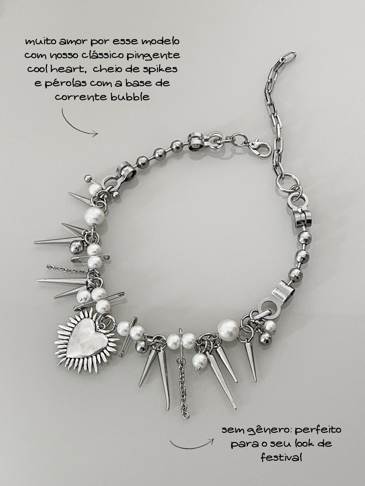 Um verdadeiro ícone em forma de colar. Feito artesanalmente, com horas de produção, ele traz uma corrente bubble, piercing e detalhes industriais que se misturam a 10 spikes em tamanhos diferentes, 13 pérolas luminosas e 4 alfinetinhos delicados. A franjinha em corrente dá movimento, enquanto o pingente de coração cravejado por espinhos se torna o centro de todas as atenções – é impossível passar despercebida com ele.