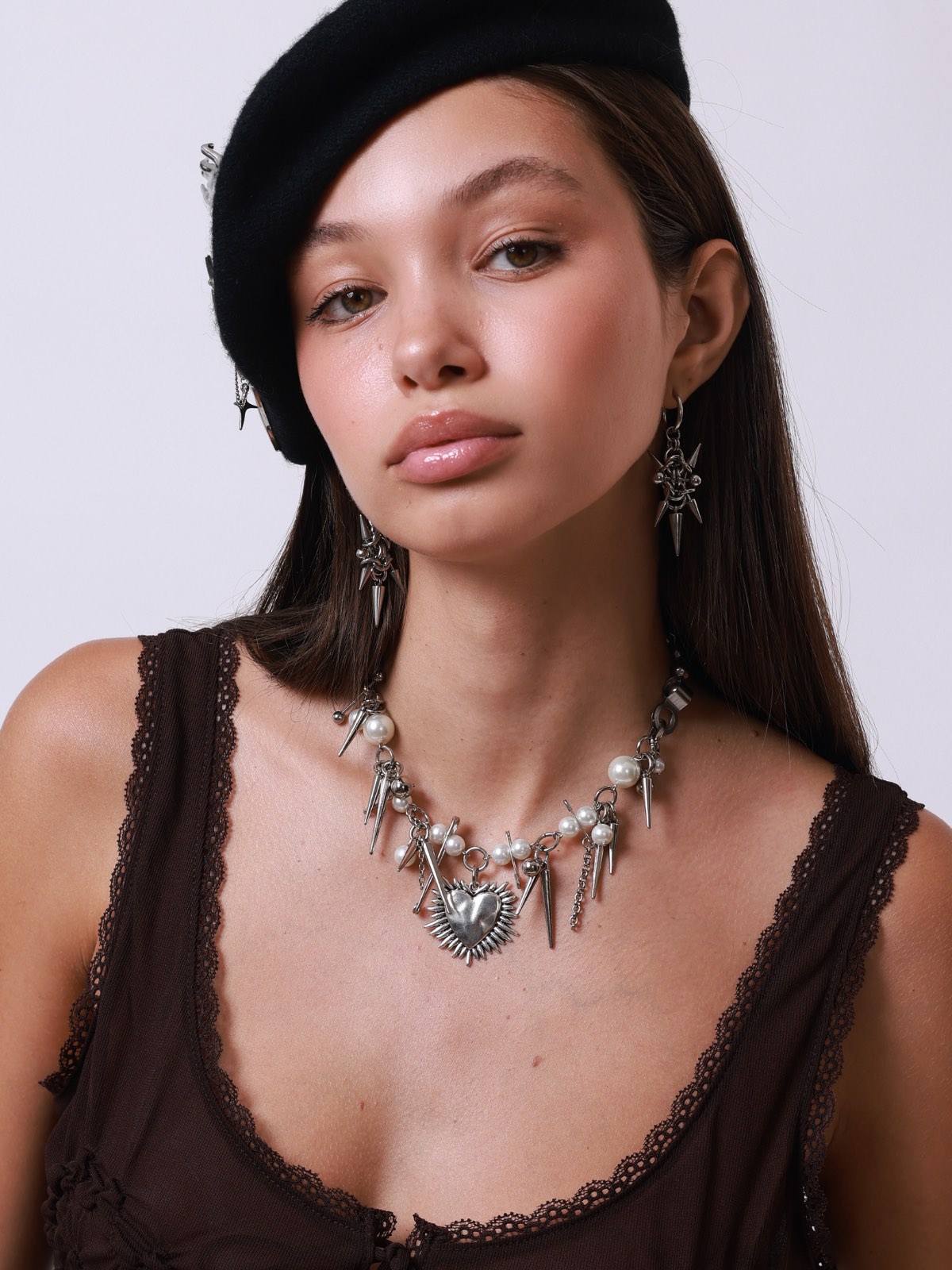 Colar Spike Heart, feito pérolas, spikes em diferentes tamanhos e pingente de coração prata