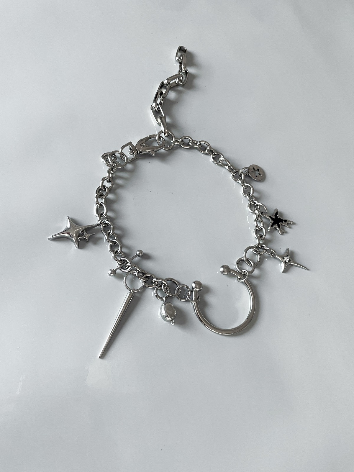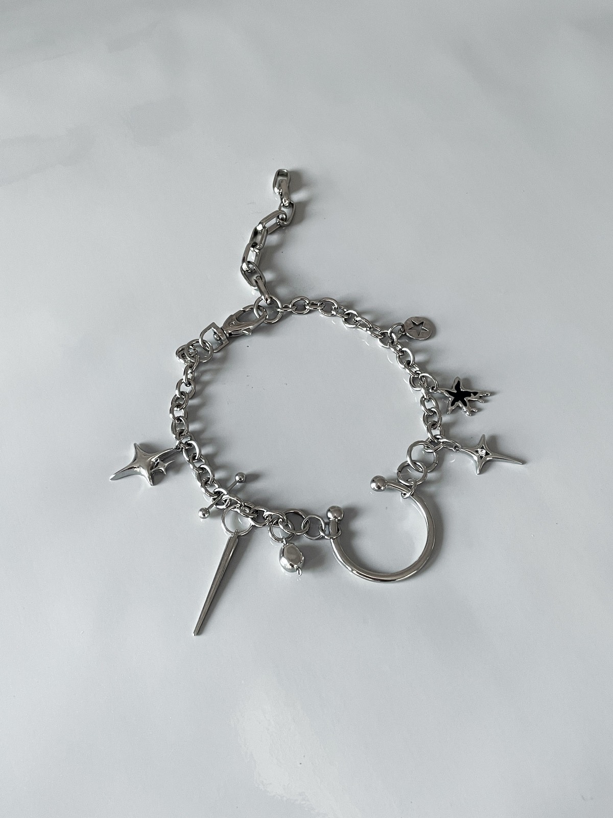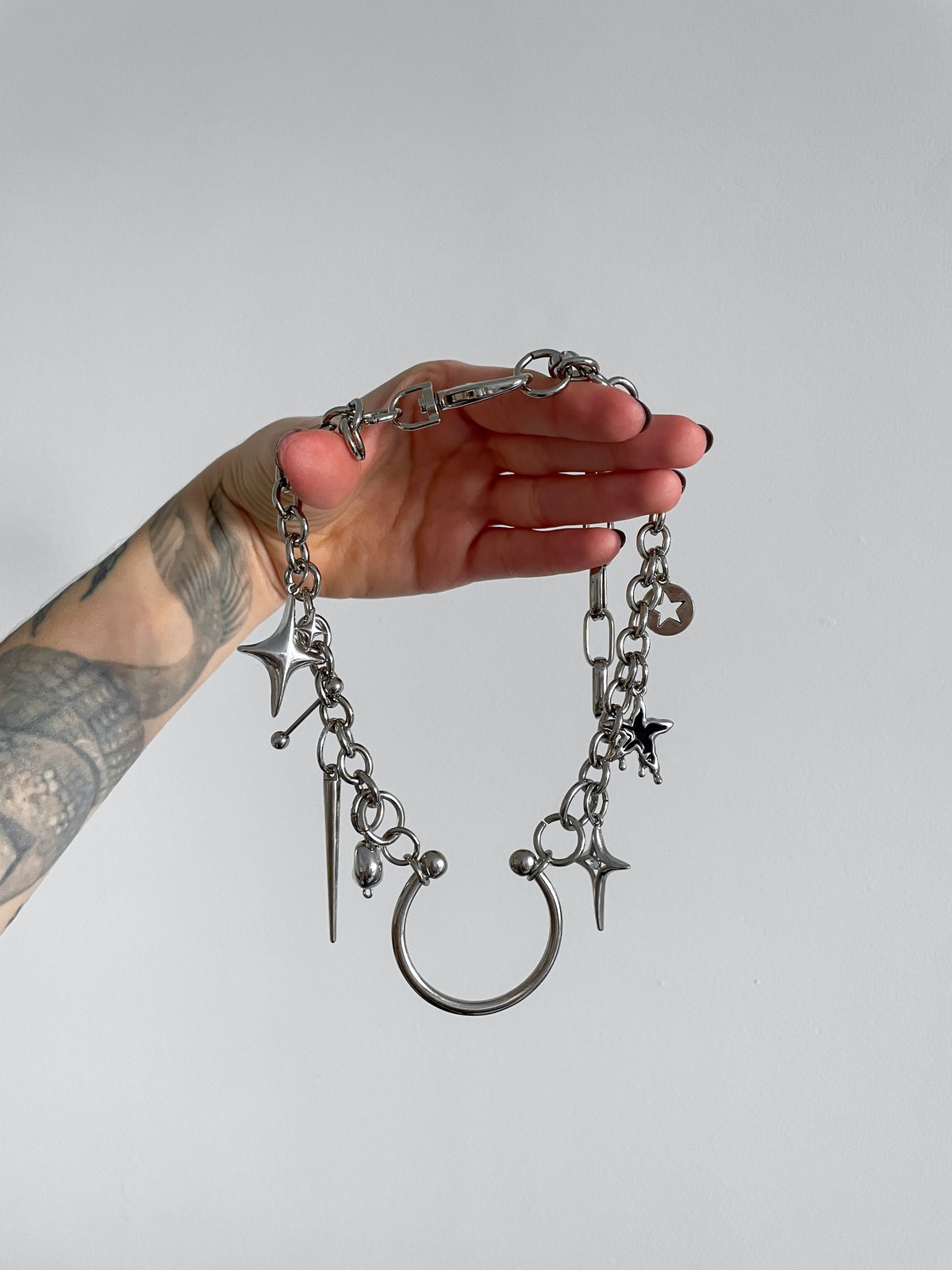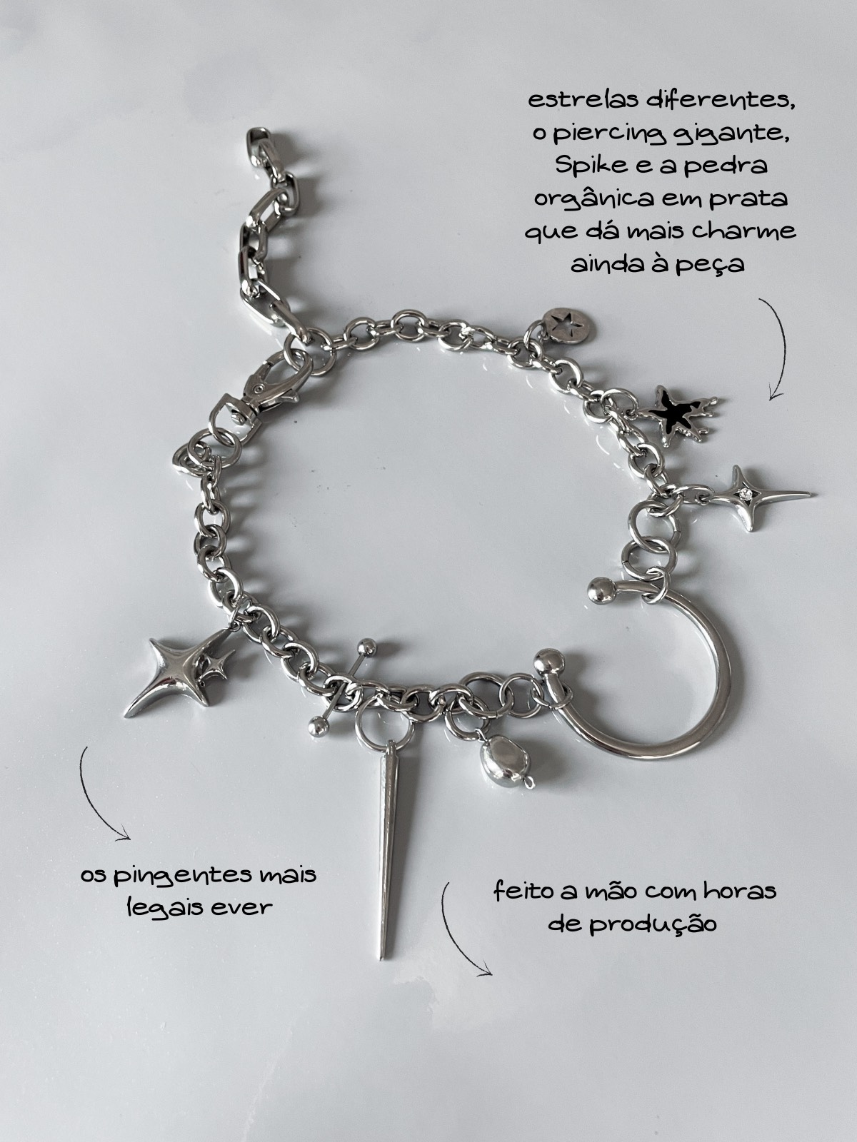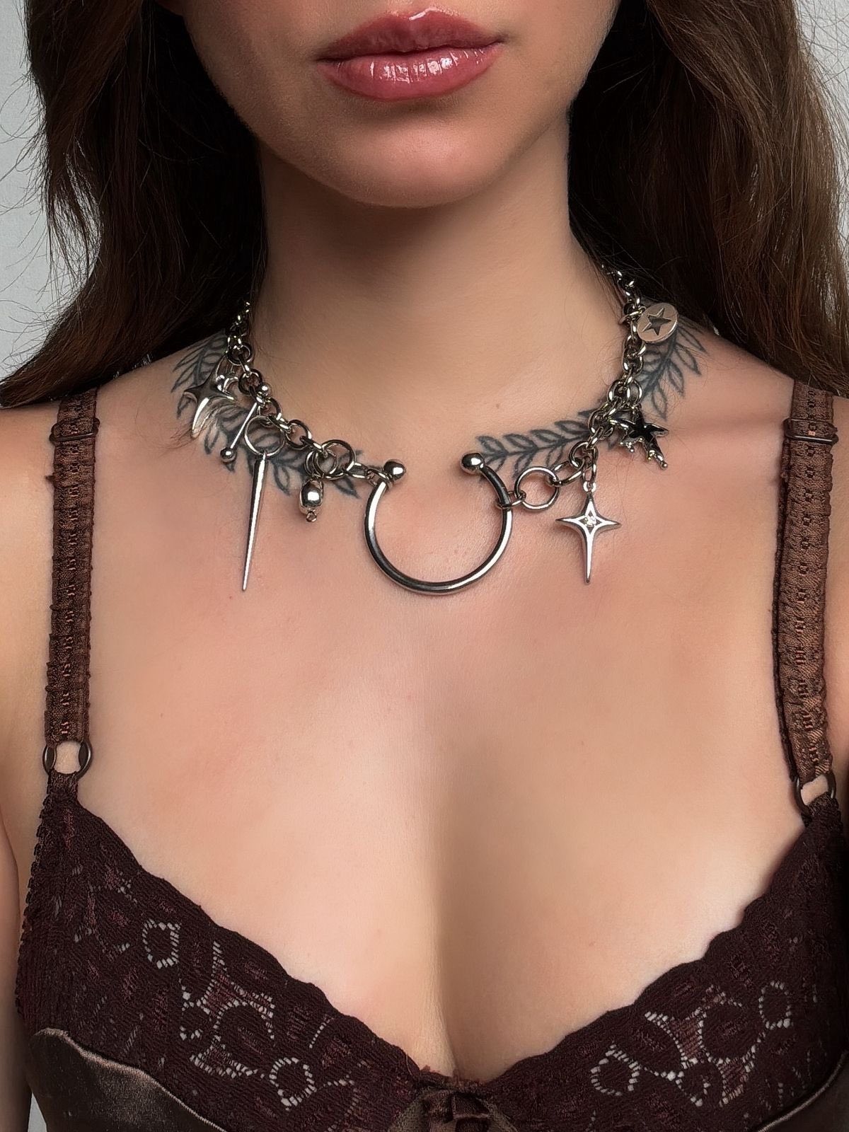 OMG! Olha que peça mais incrível. Ele tem esse mood piercing em formato de meia argola gigante de ponta cabeça e ainda conta com pingentes como a pedra de metal orgânica, o piercing, a estrela vazada, a estrela esmaltada em preto, spike e os pingentes de sparkle que são lindíssimos. Aquele colar que você não pode ficar sem!